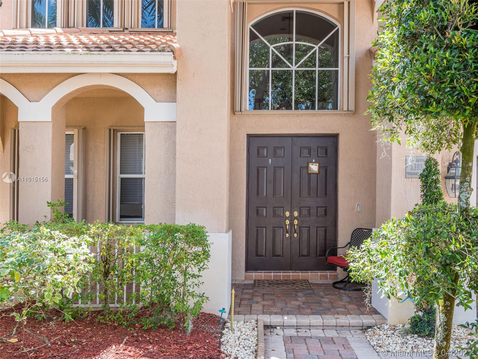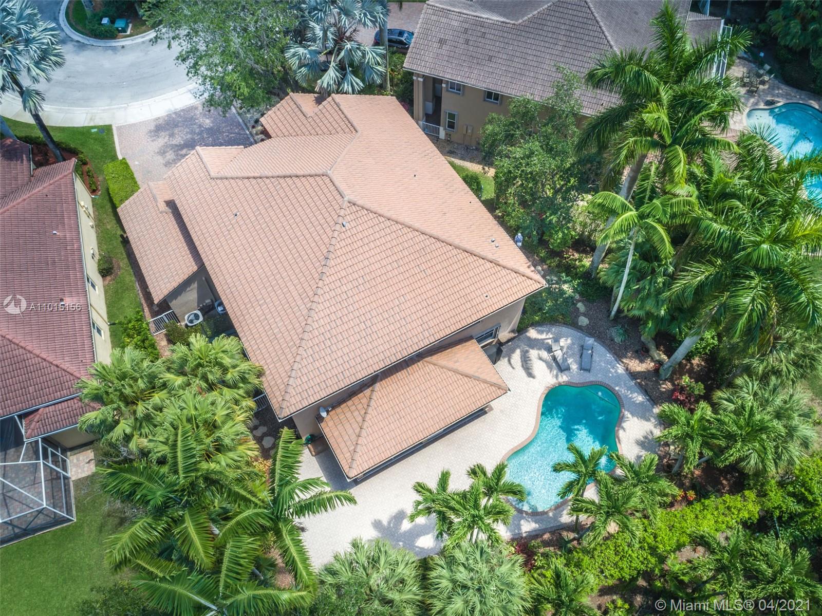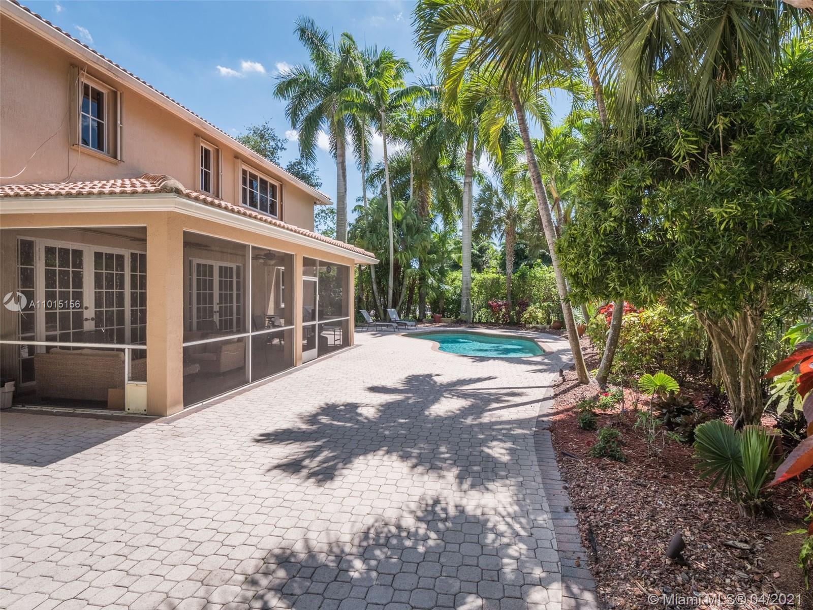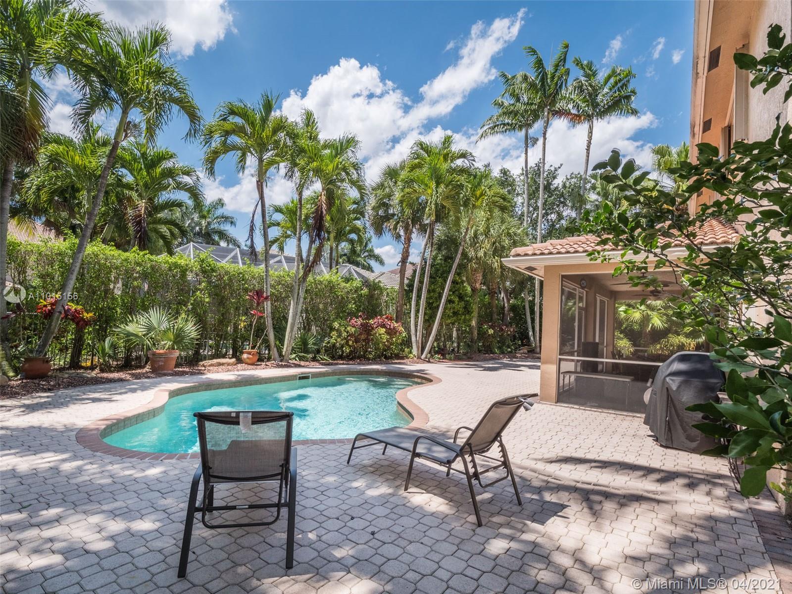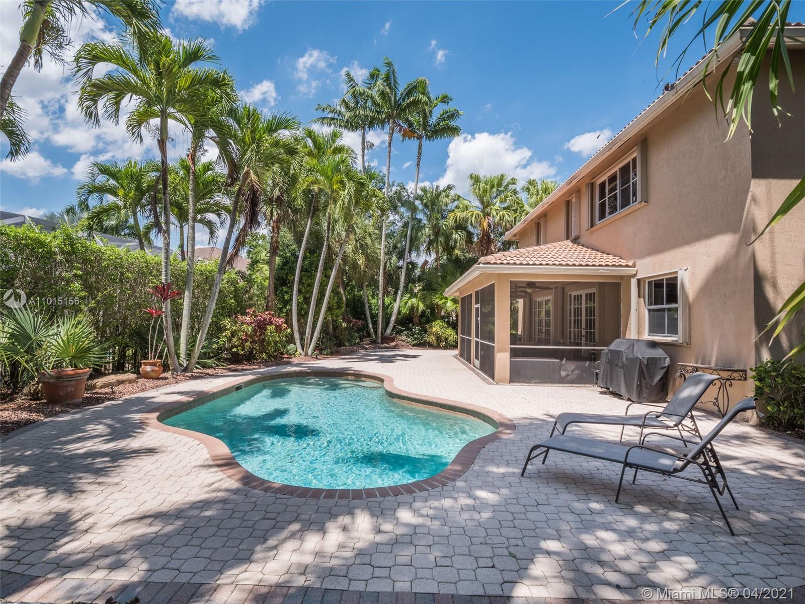 Perfectly placed in the cul de sac in the gated community of Hunters Pointe at Weston Hills CC. Popular Glendale model with great curb appeal. The two-story living room welcomes you with new porcelain tile flooring flowing throughout the first level. Freshly painted in today's colors. White kitchen with granite countertops and Stainless steel appliances. An oversized family room can easily convert to an additional full bedroom or office. Double sliders on your private fully fenced yard with screened patio, paver pool deck with a freeform pool. Master bedroom second level with wood flooring, sitting room, and two large closets. Renovated baths, wood floors in all bedrooms. Walk to community park.