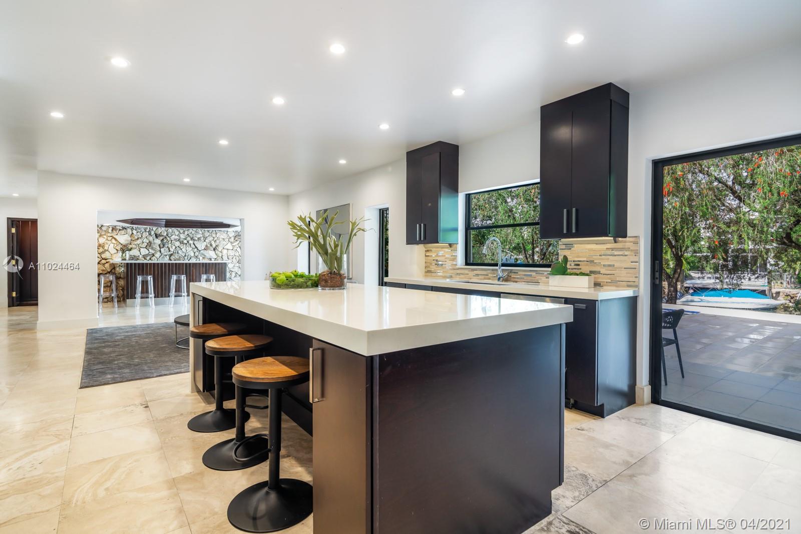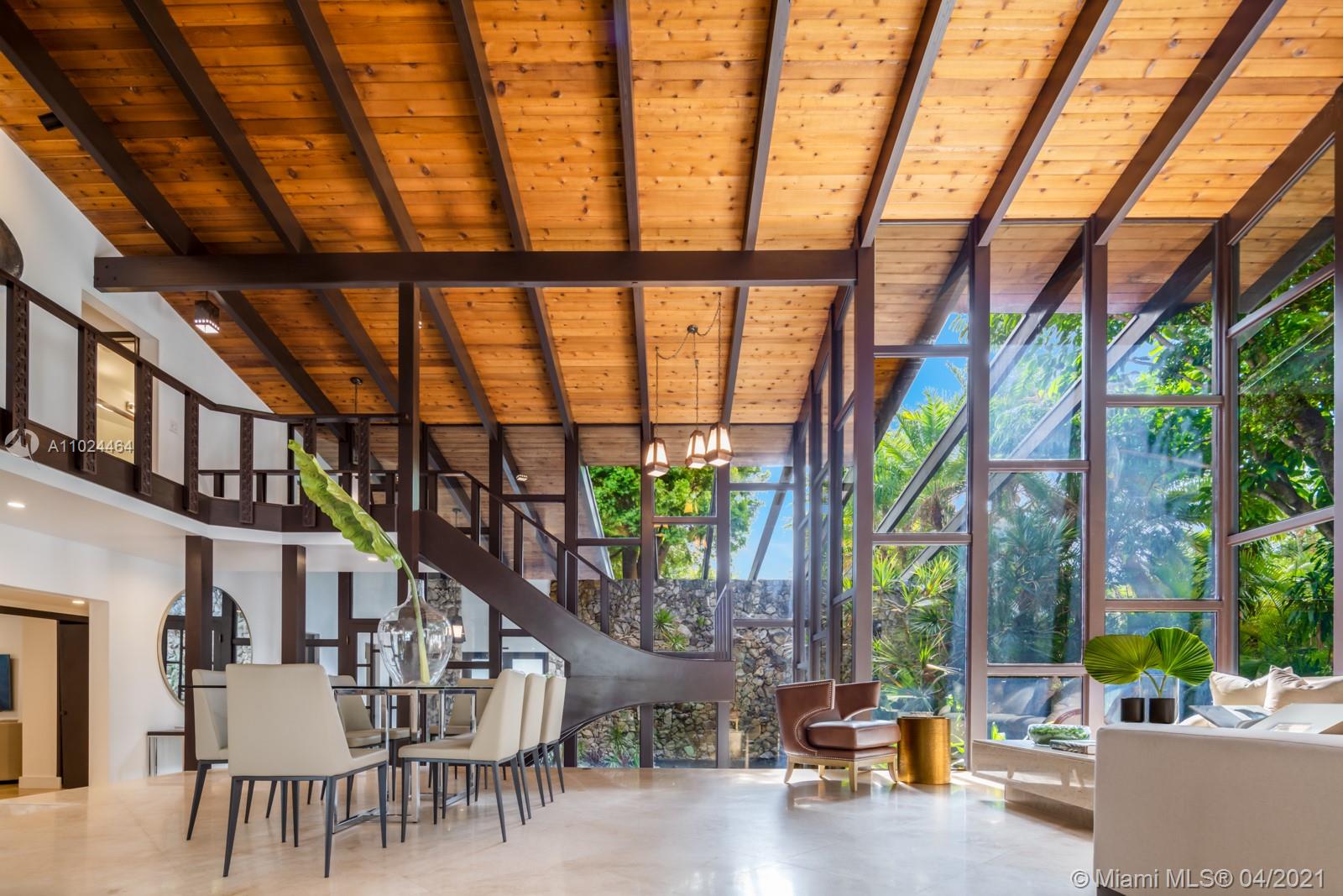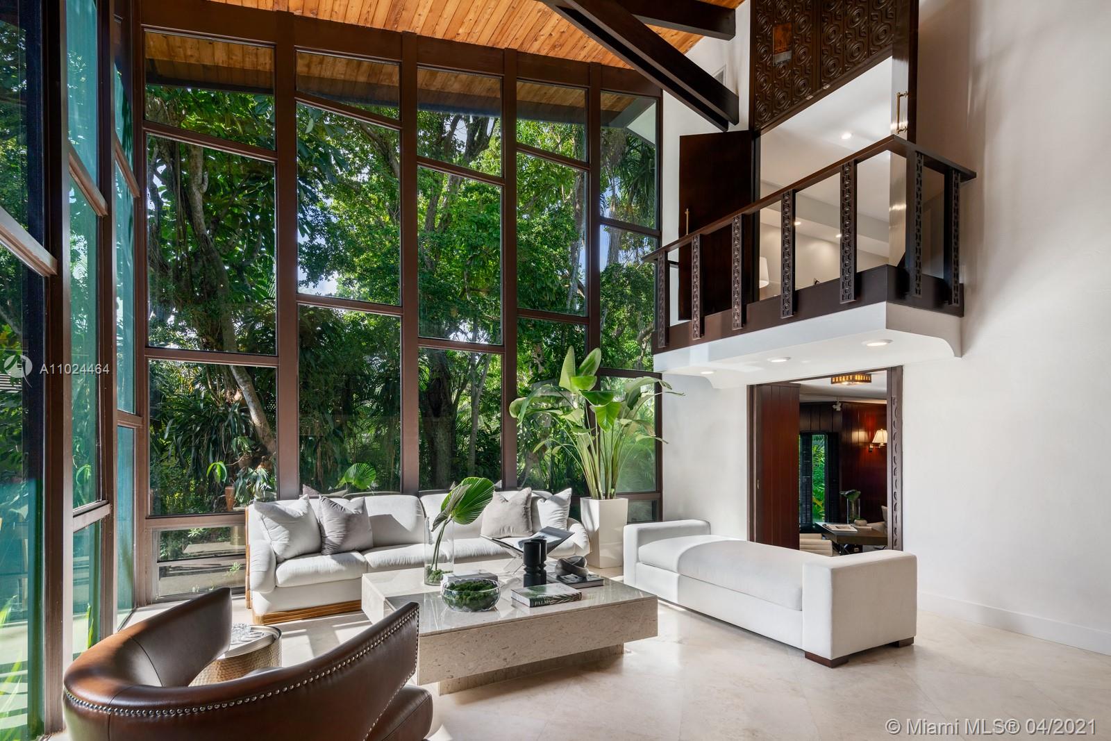 This waterfront home is an architectural masterpiece inspired by renowned architect Frank Lloyd Wright. Located on the Coral Gables waterways, one of the Gables’ most desired areas, this property offers 5,421 SF, 5 bedrooms and 6 bathrooms.The soaring double height ceilings & use of glass walls ensure an abundance of natural light, while blending the interiors with the tropical, lush exteriors of this home. This custom home offers an updated, open kitchen with island, renovated bathrooms, a separate bar area, a large first floor terrace, marble & wood floors throughout and an interior courtyard with a waterfall and pond. The 18,496 SF lot offers 110 Ft of waterfront with a pool and plenty of space to entertain. Additional details are a laundry room, a two-car garage & lots of closet space.
