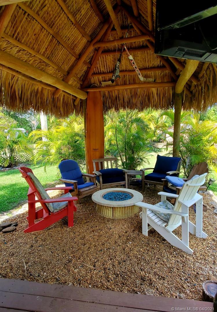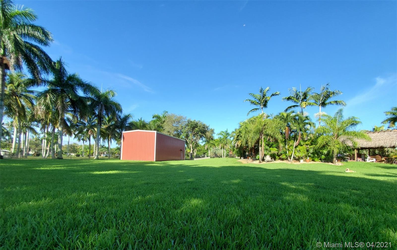 3/2+ Den/Office on over an acre with No HOA. 2 car attached garage & additional 1000 sqft detached garage/workshop, great for RV/Boat/Cars. Tropical backyard oasis has a heated resort-style pool with spa & waterfall, large tiki hut, wood deck & includes tv's. 2 additional sheds & over 30 Royal Palm trees line the property. Plenty of room for horses. Split bedroom floorplan has water resistant plank flooring & large open kitchen with breakfast area & bar that overlooks the family room. Master suite has a walk-in closet, dual vanities, jacuzzi tub & separate shower. Guest bedroom includes a Murphy bed and new mattress. Accordion Hurricane shutters, Alarm system & newer 85gal electric water heater. Roof Inspected Mar 2021. Sold "as is”. Furniture is negotiable.