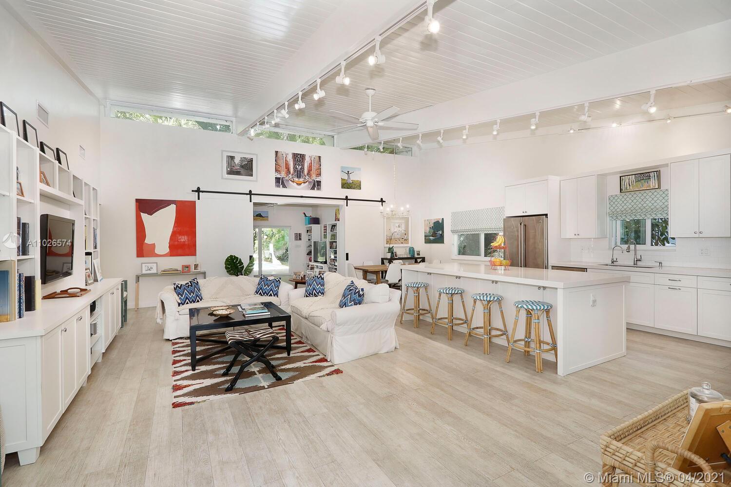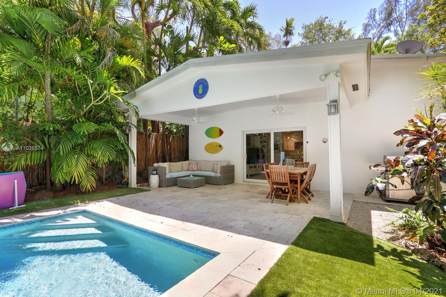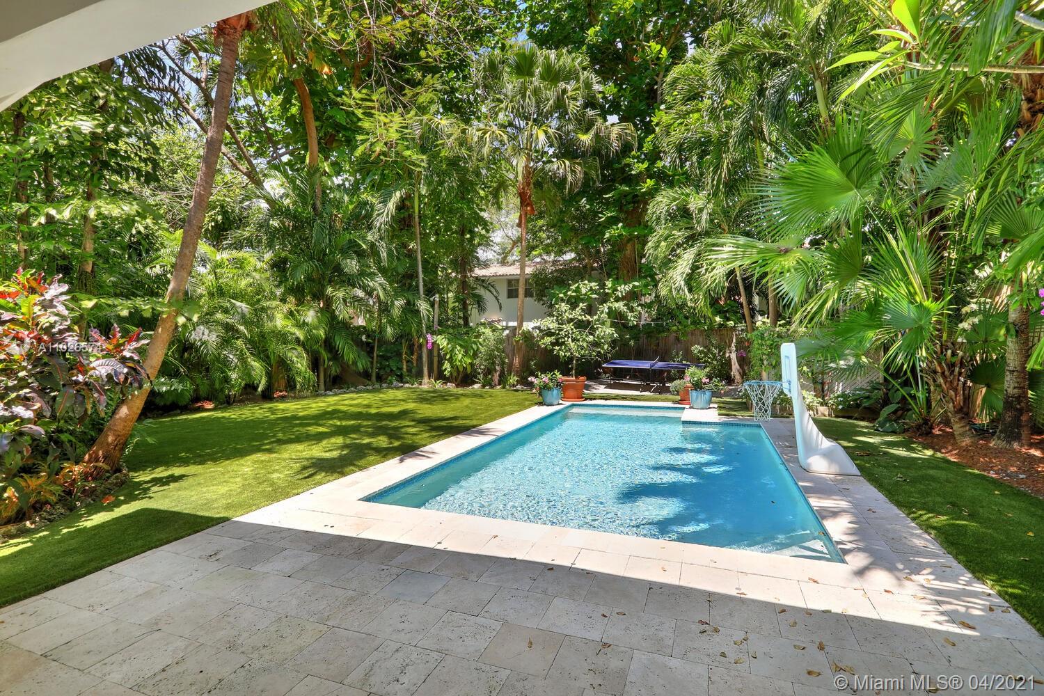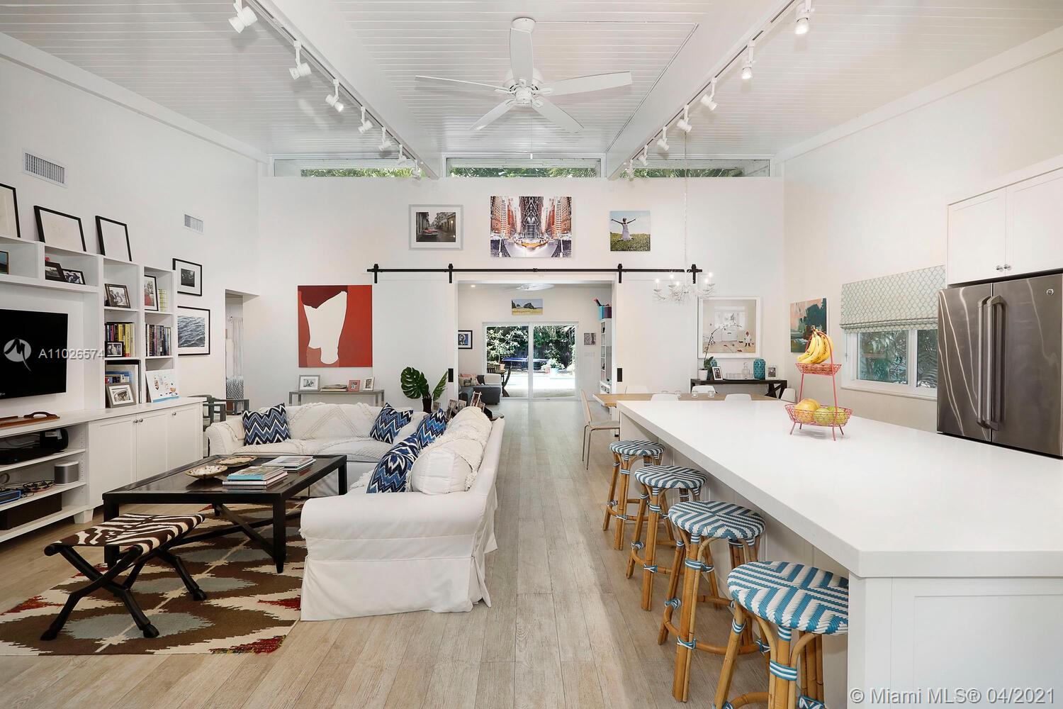 Tropical bungalow with a “coastal” vibe. Totally renovated & expanded by current owners. Light-filled, open living spaces feature high, wood-beamed ceilings & a soothing white color palette. Stunning new kitchen has wood cabinetry, gas range, quartz countertops & an oversized island w/ bar seating. Other updates include: new bathrooms, custom closets, impact windows & doors, tankless water heaters and Italian porcelain tile flooring. Master suite offers an oversized walk-in closet & overlooks the garden. Separate family room opens to spectacular, ultra-private outdoor space w/ deep covered terrace, new heated/saltwater pool & an expansive garden w/ lush tropical landscaping. Walk to nearby parks, top schools and to the Grove village center’s many galleries, boutiques, restaurants & cafes.