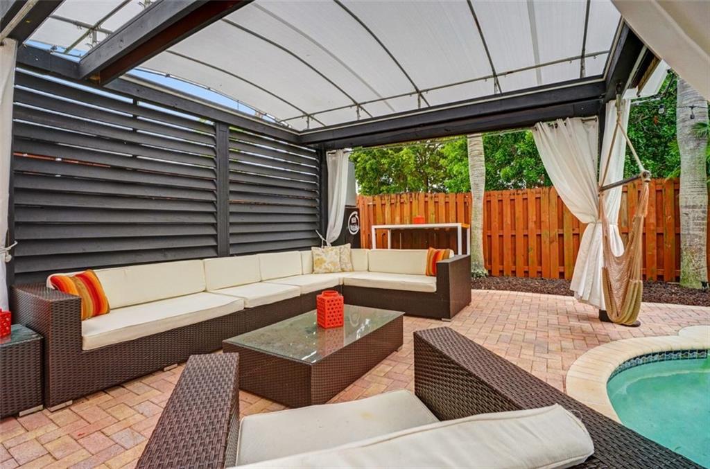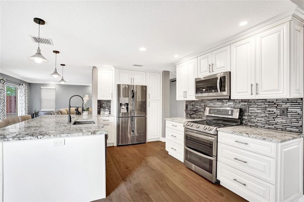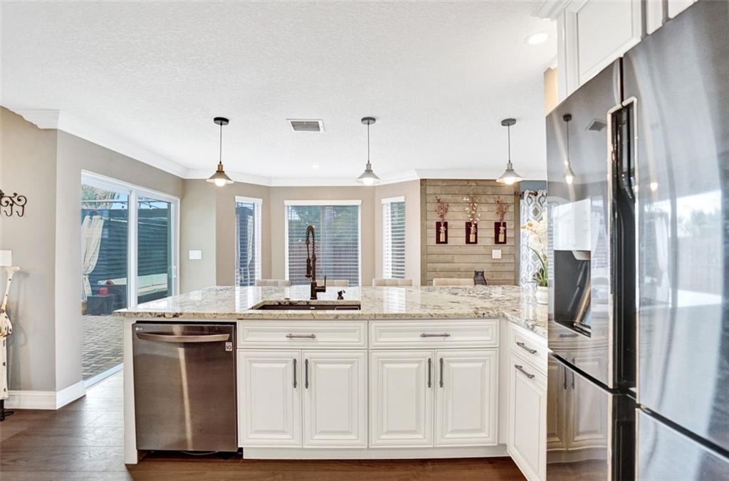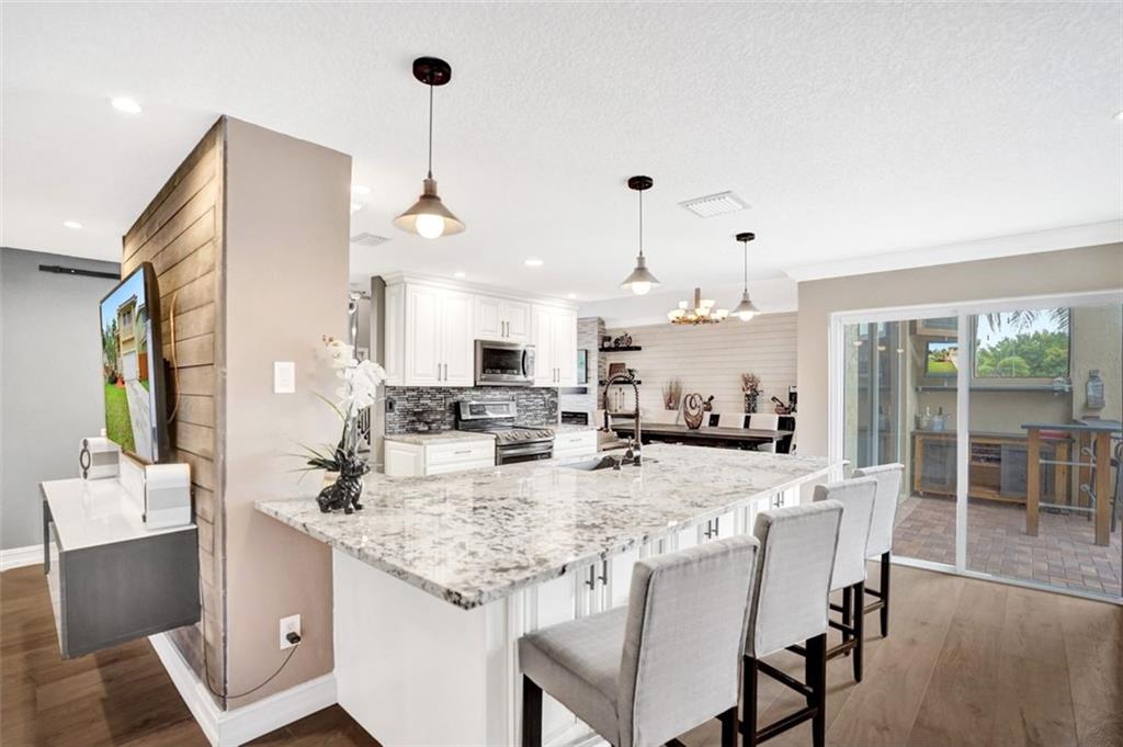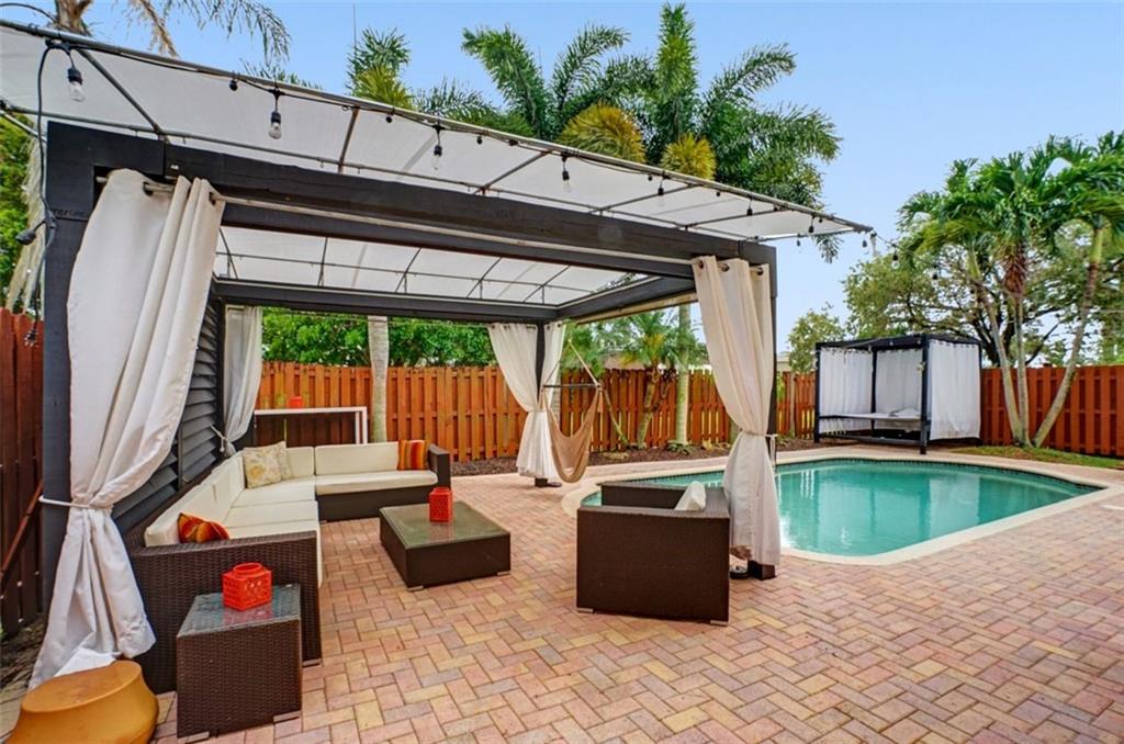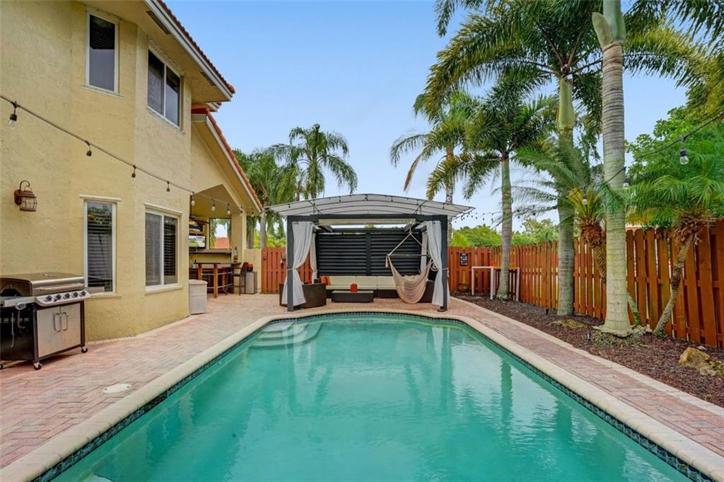Beautifully updated 4 Bedroom 2.5 Bath Pool Home with a designer's touch! Warm and welcoming, this home offers an open concept updated kitchen w/ granite countertops, island w/seating & black stainless steel appliances. Beautiful plank flooring runs throughout the entire home, spacious high ceilings open to the second floor, boasting beautifully updated stairs and railing. Separate laundry room with stacked front load washer and dryer. Spacious master offers two walk-in closets with plenty of storage. Perfect for entertaining, your own backyard oasis features a fully fenced yard, pool, patio area with covered pergola gazebo, a covered cabana with hammock bed, bar, and BBQ area! Roof 2 years - Hurricane Shutters. Vista Filare is centrally located close to major highways, shopping, & dining!