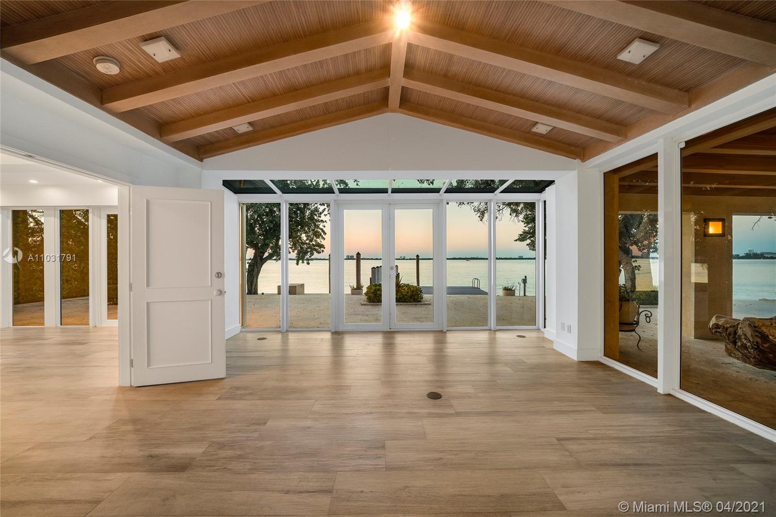 This Bayfront home is perfectly located on the coveted tip of the Venetian Islands. The 5BR/5BA home sits on a 13,382 SF lot w/open Biscayne Bay & stunning sunset views. Over 4,800 interior SF, wide plank tan oak & custom Cuban tile floors, high wood-beamed ceilings, sky lights & an interior courtyard. Spacious living room w/fireplace & wet bar, family room w/full BA, & dining room all w/large windows & water views. Gourmet kitchen sports top-of-the-line Wolf & Samsung appliances, granite center island, eat-in seating & adjacent family area to relax. Bay facing principal suite offers direct terrace access, voluminous walk-in closet & elegant principal bathroom w/walk-in glass shower & pedestal soaking tub. Large pool, deck w/covered seating area, large dock, direct bay & Ocean access.