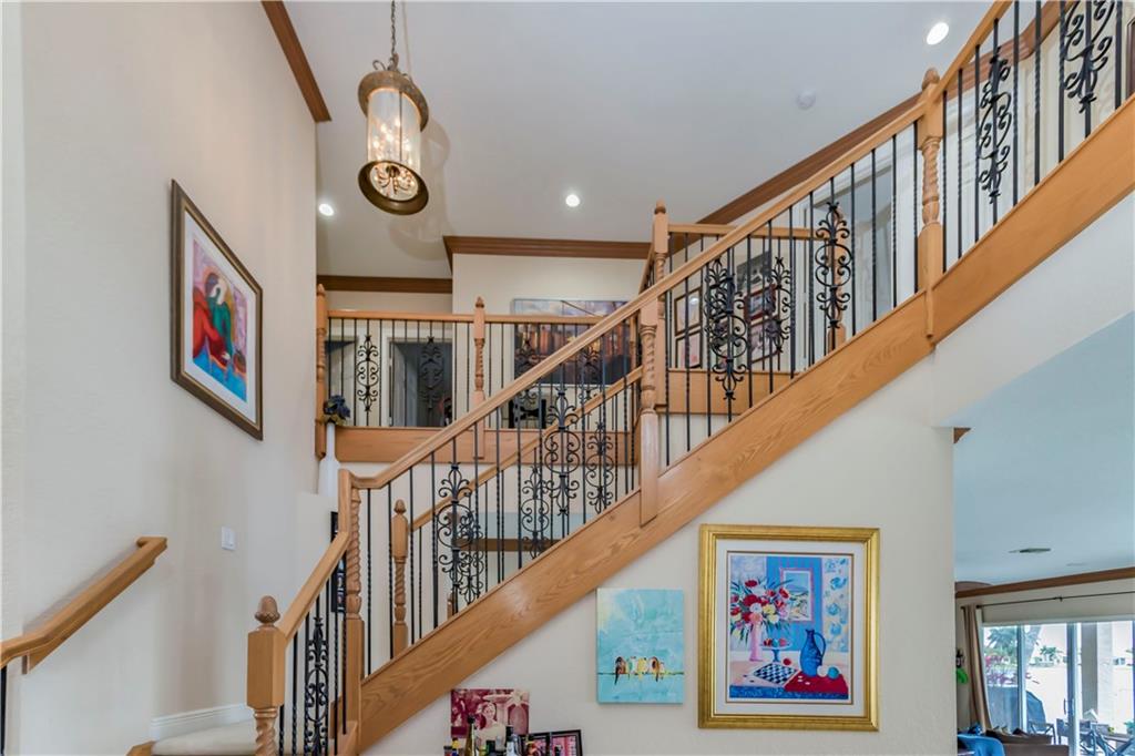 Enjoy breathtaking views from this huge lake front home! Large pie shaped lot gives you lots of lake frontage & complete privacy. This is 1 of the largest models in Sunset Lakes w 6 lg bedrooms & 4 full baths. As you enter the home you will be in awe of the soaring 2 story high ceilings in the formal living room, dining room & foyer, a grand staircase w gorgeous wrought iron railings. A stunning 2 story high fireplace enhances the living space. The gourmet kitchen has solid wood cabinetry & gorgeous granite countertops & an amazing lake view. Upper level & lower bedroom have brand new wood floors. All appliances replaced w stainless steel. Newer washer & dryer. Split 3 car garages is a great feature allowing you to store a boat or classic car separate from the kids toys & daily vehicles.
