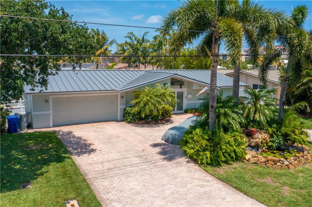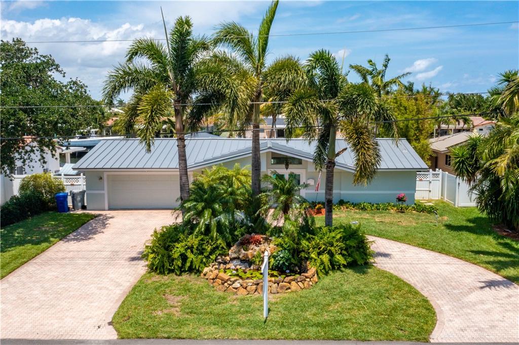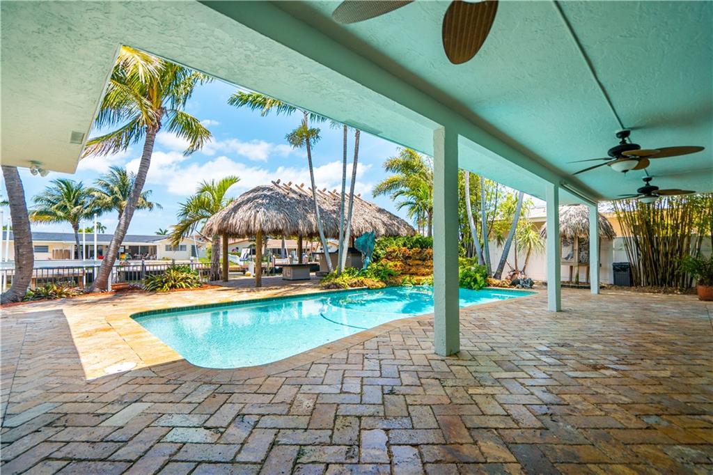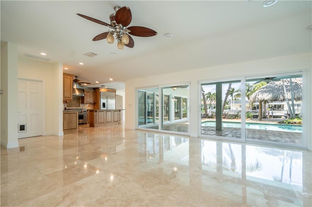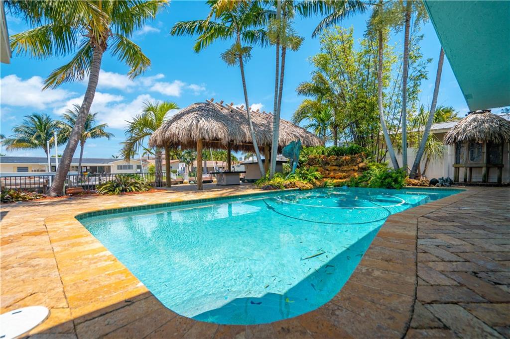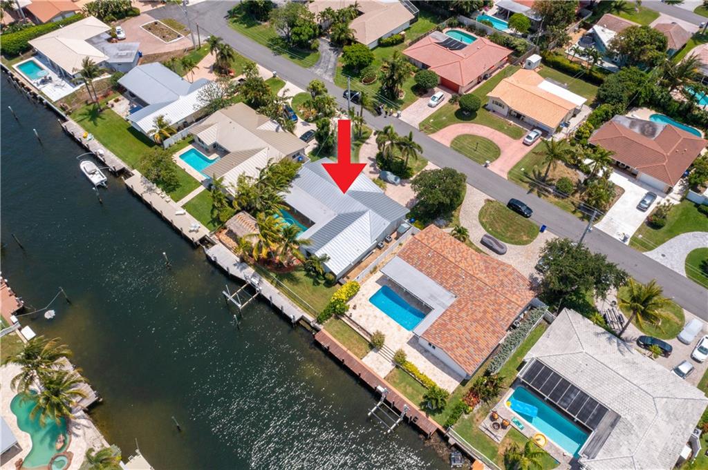 Beautifully remodeled waterfront home with private pool and dock. Choice location with 80 feet of waterfrontage, minutes to the Intracoastal and no fixed bridges. Open floor plan with volume ceilings, marble flooring, 3 split bedrooms and 2 baths. Great entertaining home, walls of glass looking out to the sparkling pool and canal views. Kitchen features a large island, granite countertops, wood cabinetry, stainless steel appliances and a Chef's gas stove. Kitchen is open to the living and family rooms. Master bedroom features walk-in closet and bamboo flooring. Newer dock, seawall and 16,000lb boat lift. 2-car garage plus circular driveway.