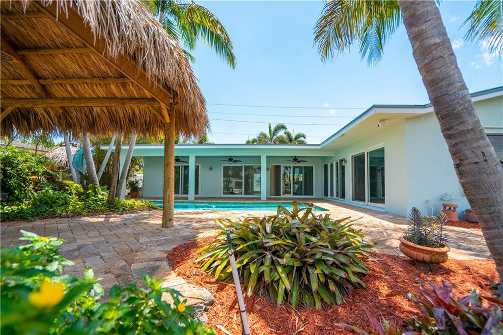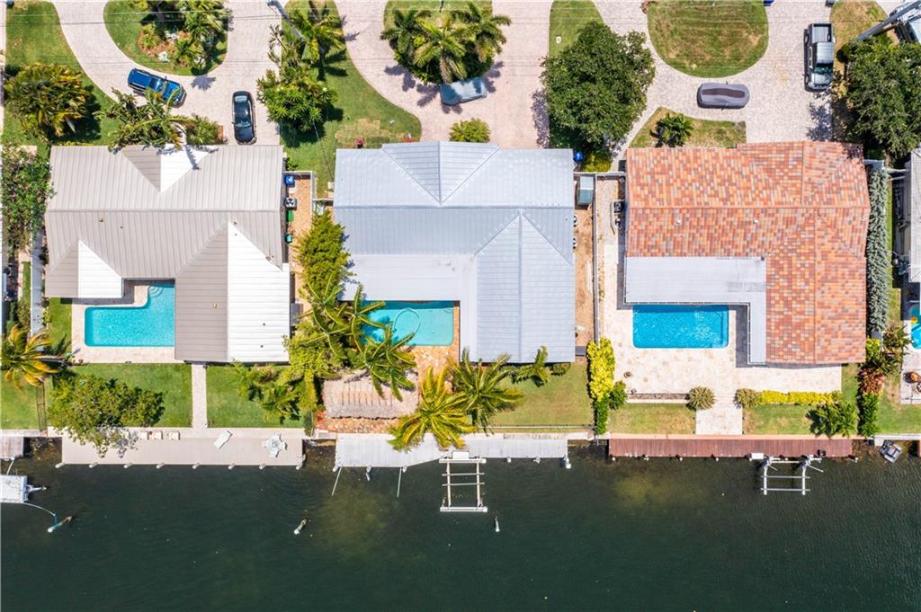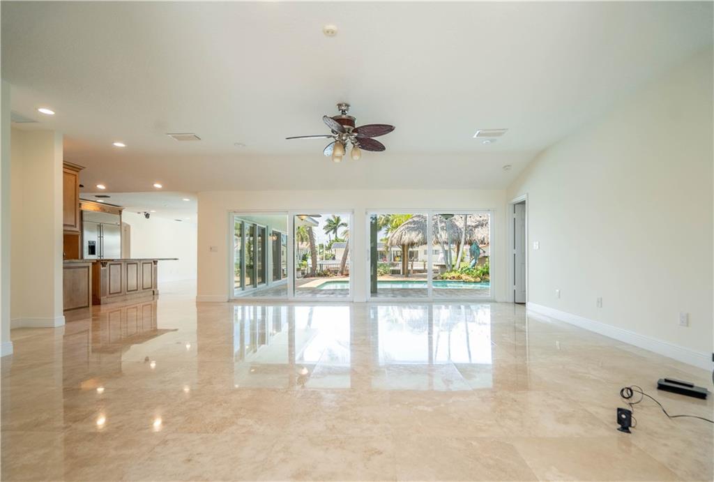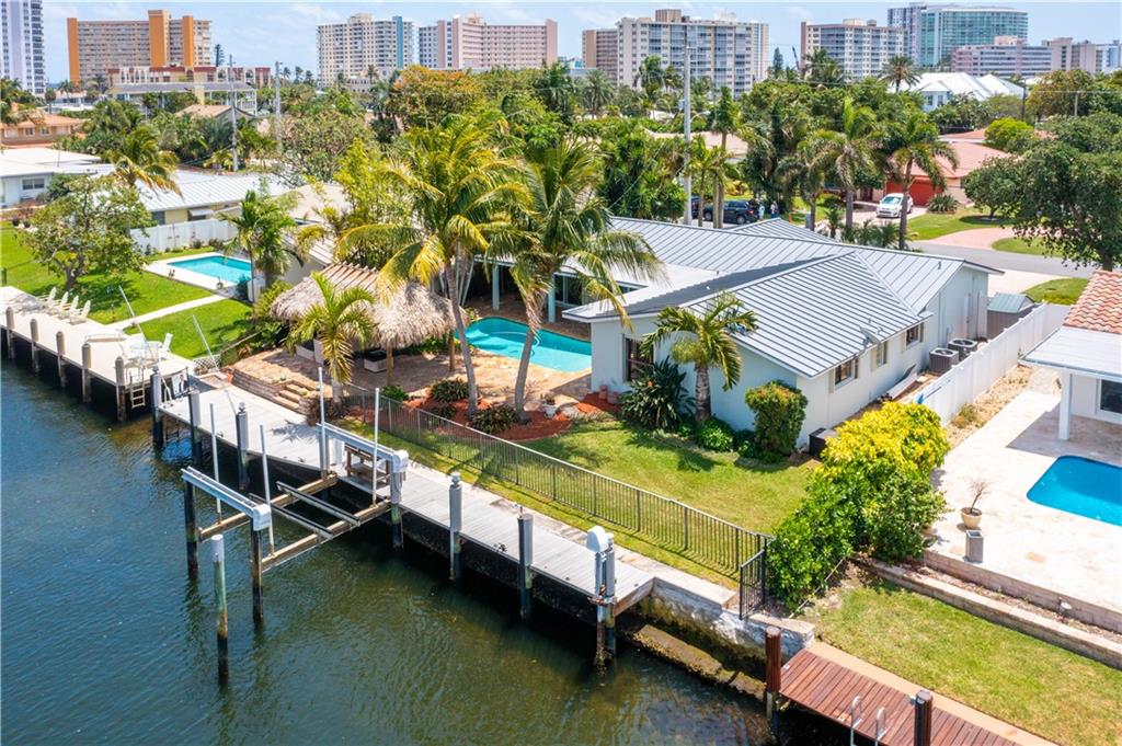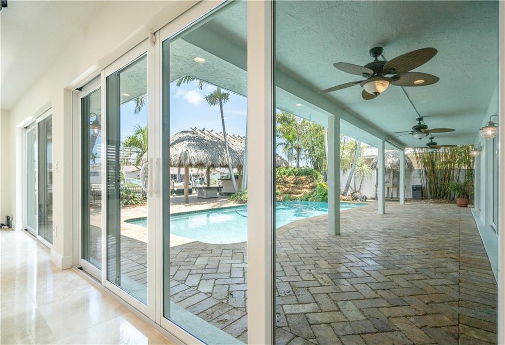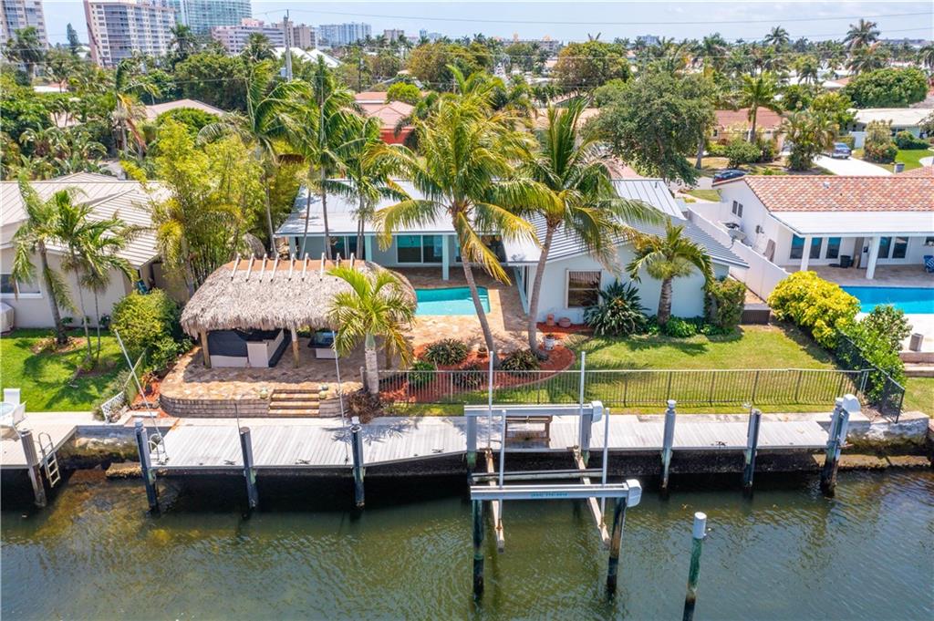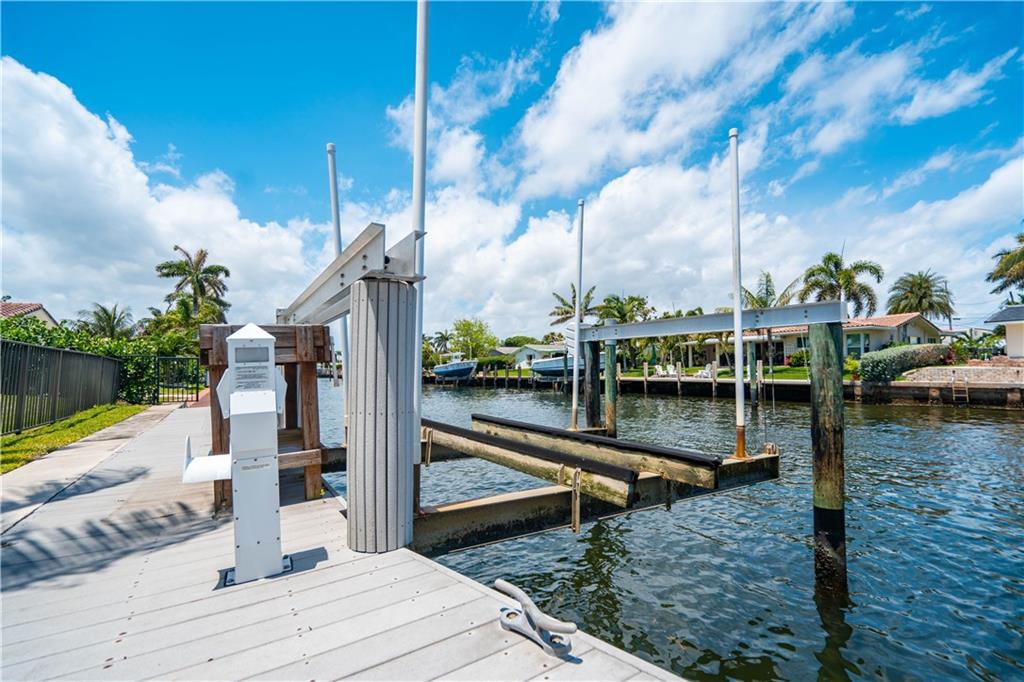 Beautifully remodeled waterfront home with private pool and dock. Choice location with 80 feet of waterfrontage, minutes to the Intracoastal and no fixed bridges. Open floor plan with volume ceilings, marble flooring, 3 split bedrooms and 2 baths. Great entertaining home, walls of glass looking out to the sparkling pool and canal views. Kitchen features a large island, granite countertops, wood cabinetry, stainless steel appliances and a Chef's gas stove. Kitchen is open to the living and family rooms. Master bedroom features walk-in closet and bamboo flooring. Newer dock, seawall and 16,000lb boat lift. 2-car garage plus circular driveway.