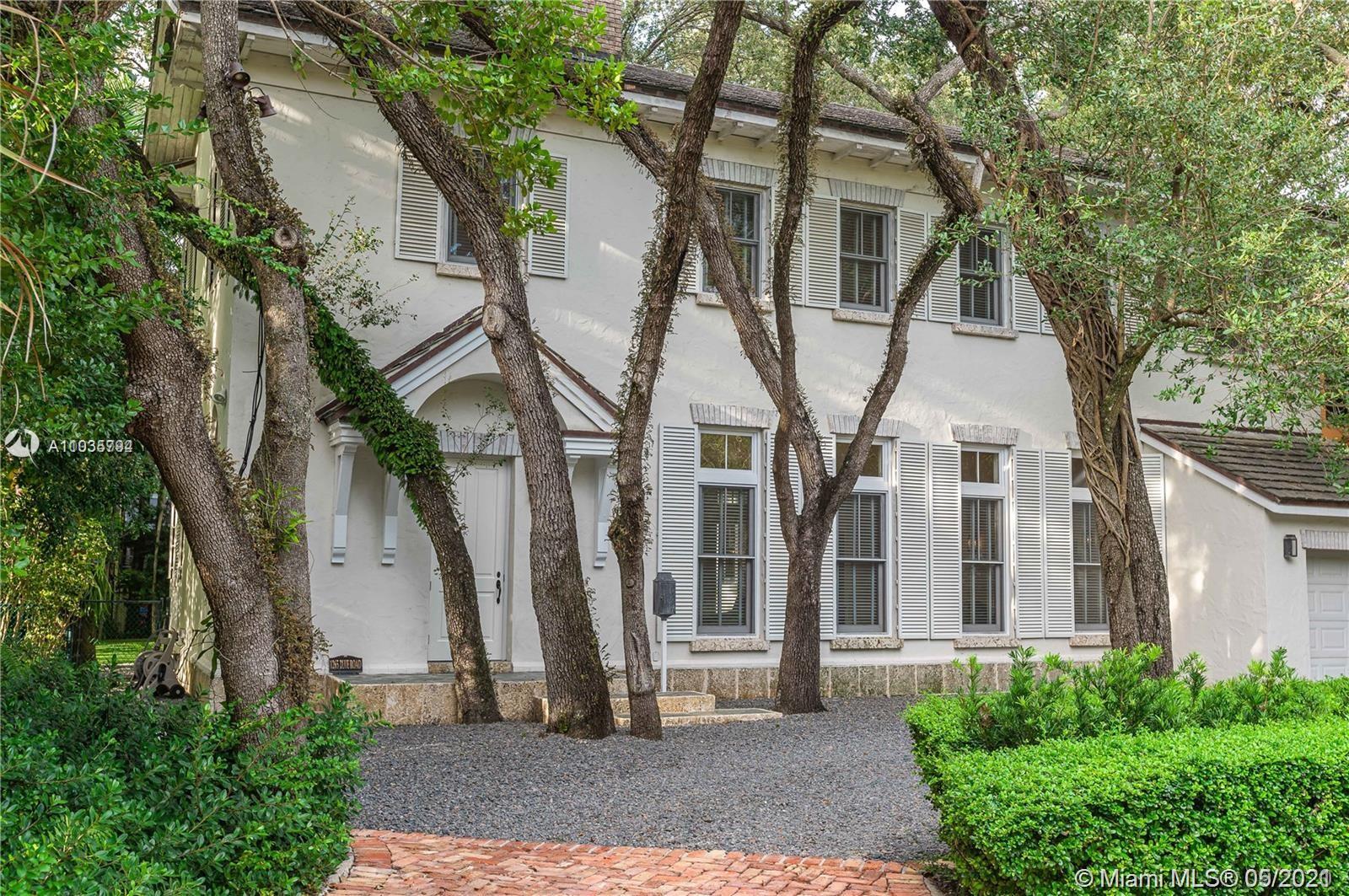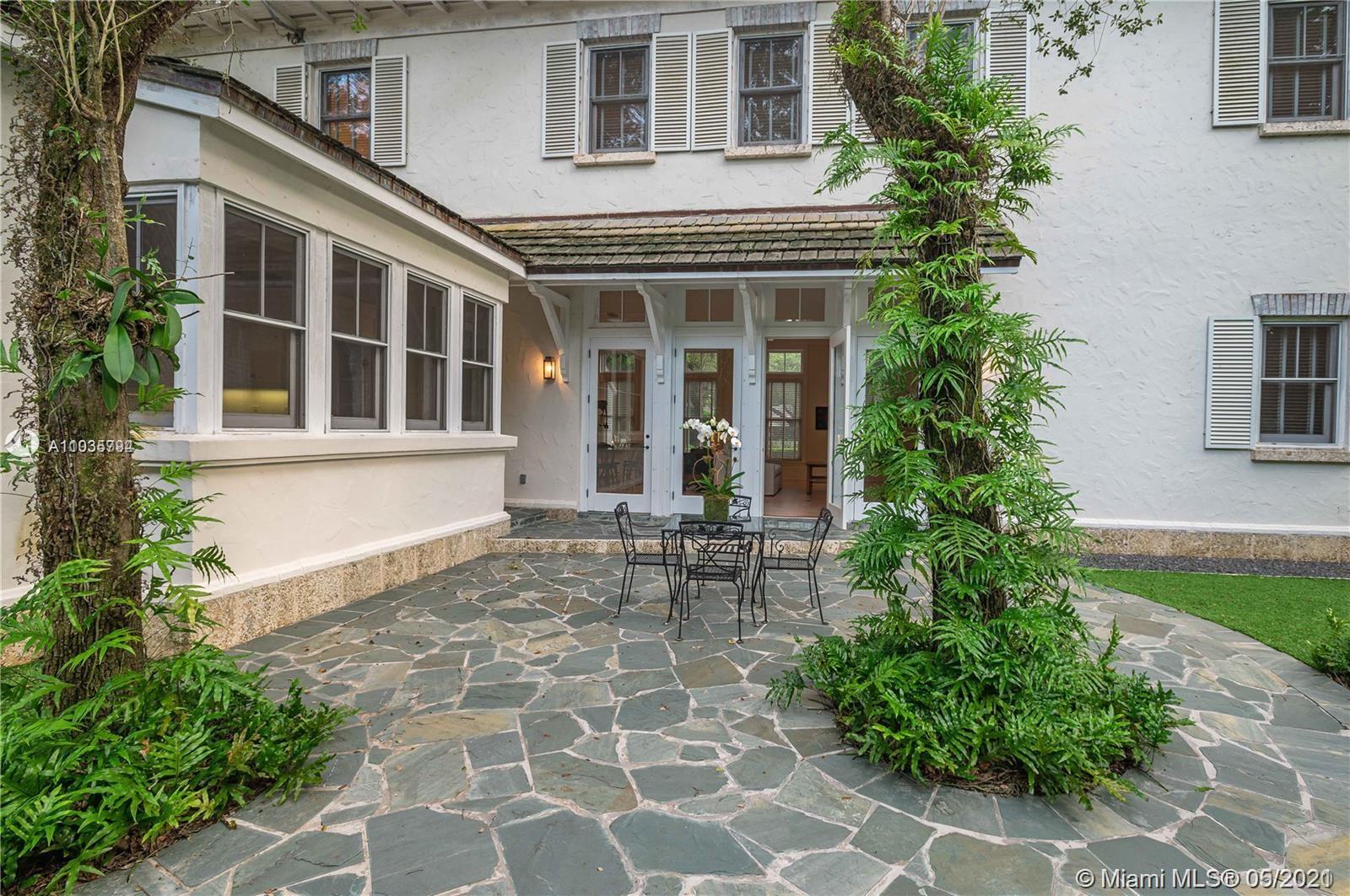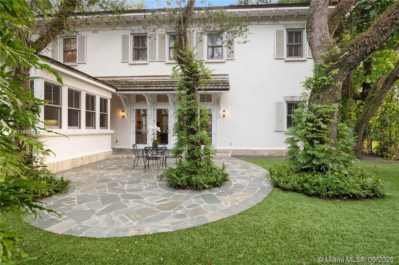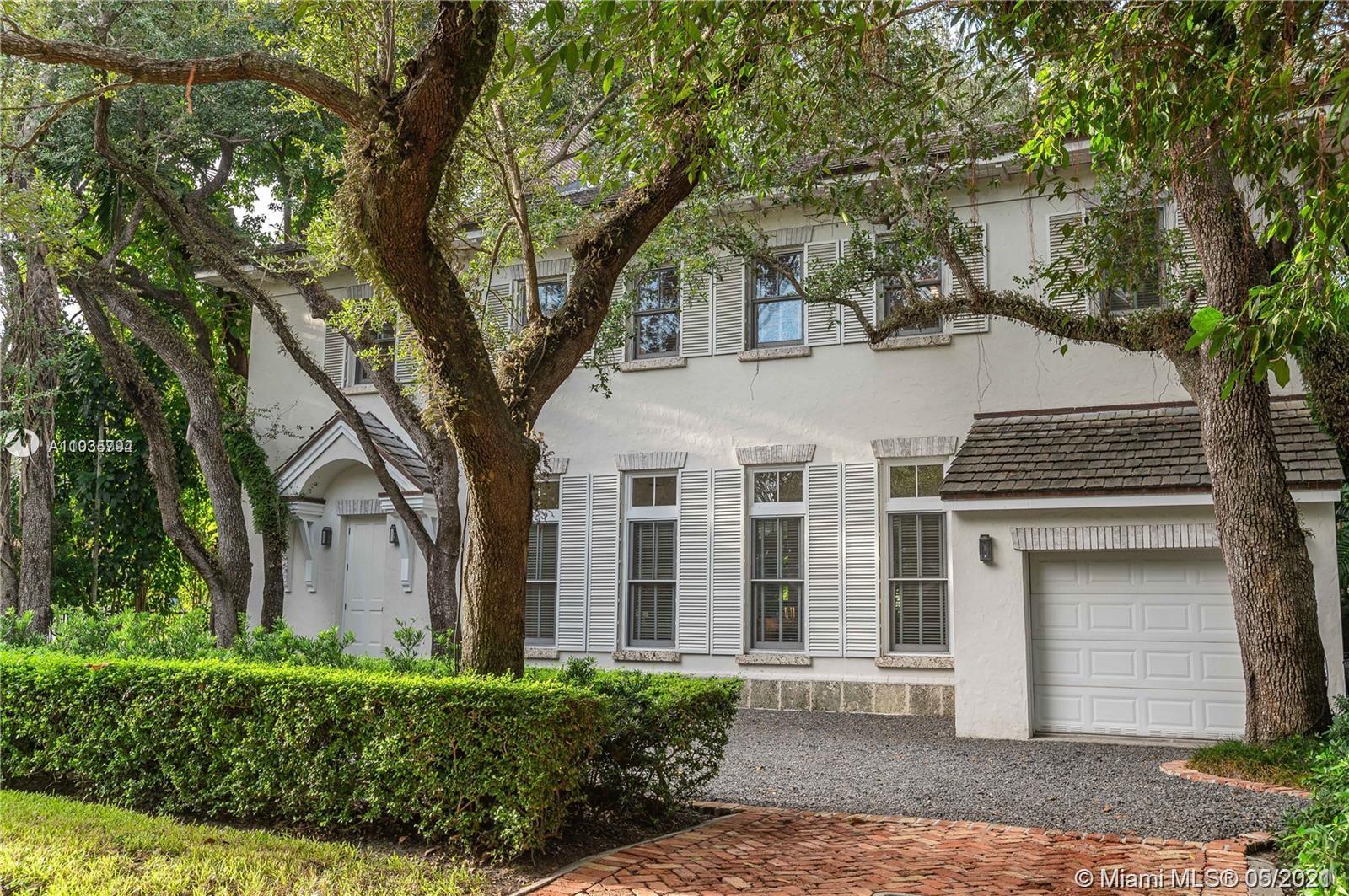 An architectural masterpiece adjacent to Coral Gables' "Pioneer Village". The open "Great" room invites you in w/ 13-foot ceilings in a bright cheerful space. A diagonal composition of the plan guides movement throughout the house. Interior details include two brick fireplaces, custom light-fixtures, mouldings, & maple-wood flooring throughout. Kitchen features cabinetry w/ hand-blown glass, soapstone counter-tops, & Viking/Sub-Zero appliances. 3-BR on the second level feature en-suite bathrooms w/ Waterworks fixtures & tilework. Downstairs room may serve as an office/study or guest room. The interiors communicate freely w/ the enchanting outdoor space. A series of french doors open out to a slate patio & turfed garden. Located steps away from the prestigious Riviera Country Club.