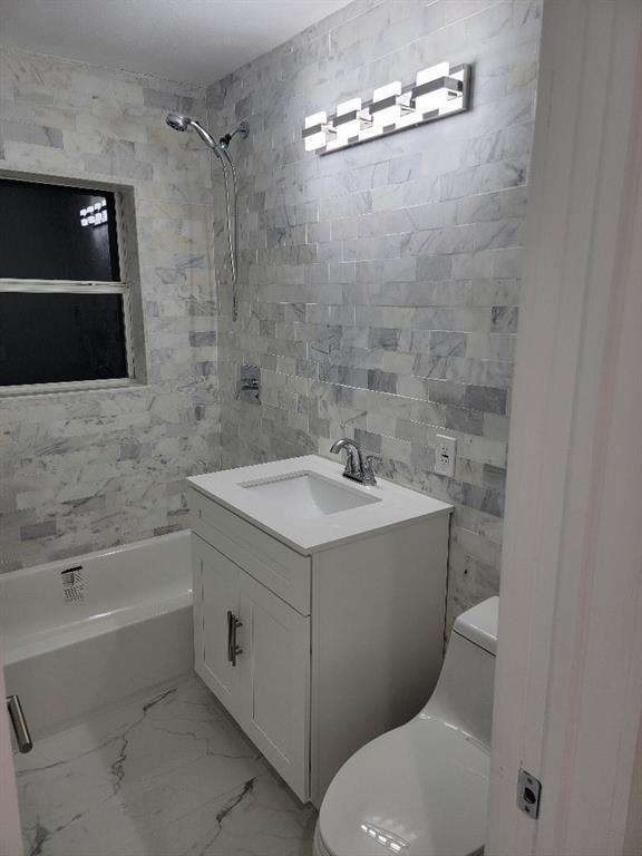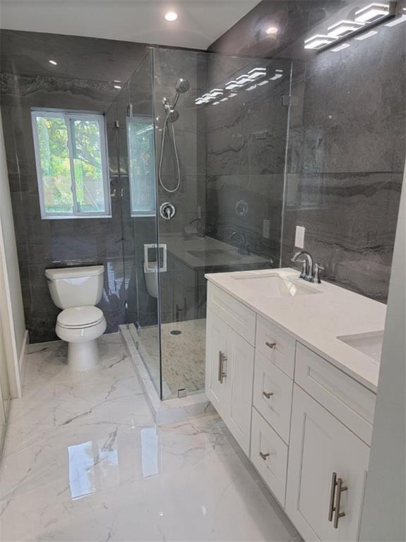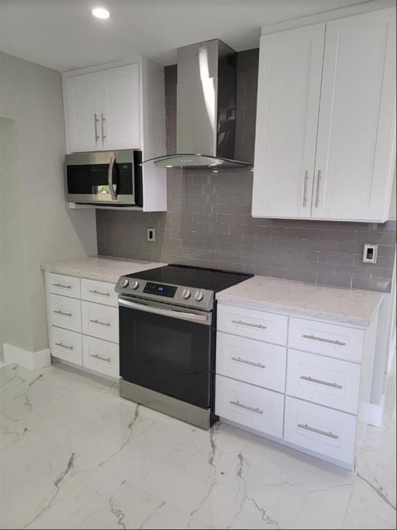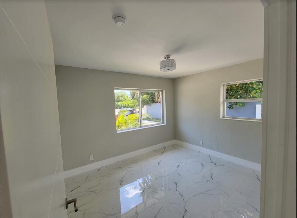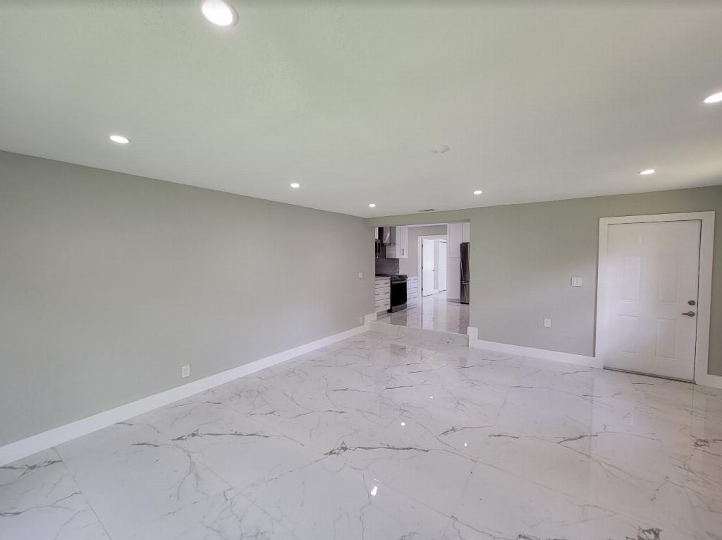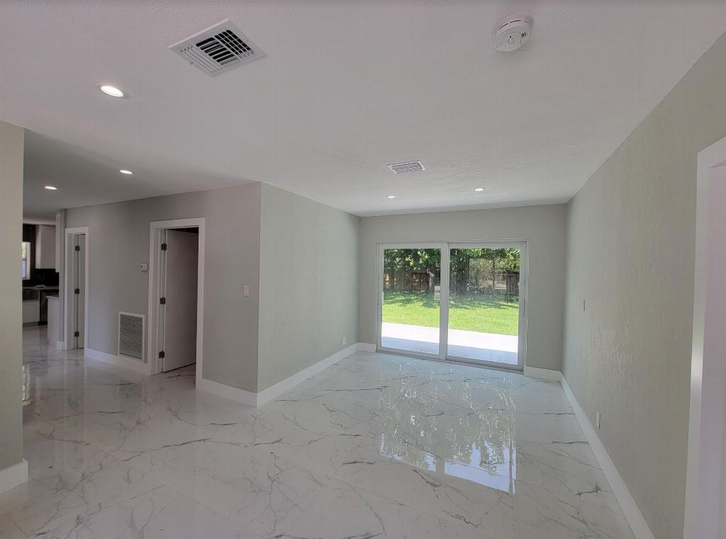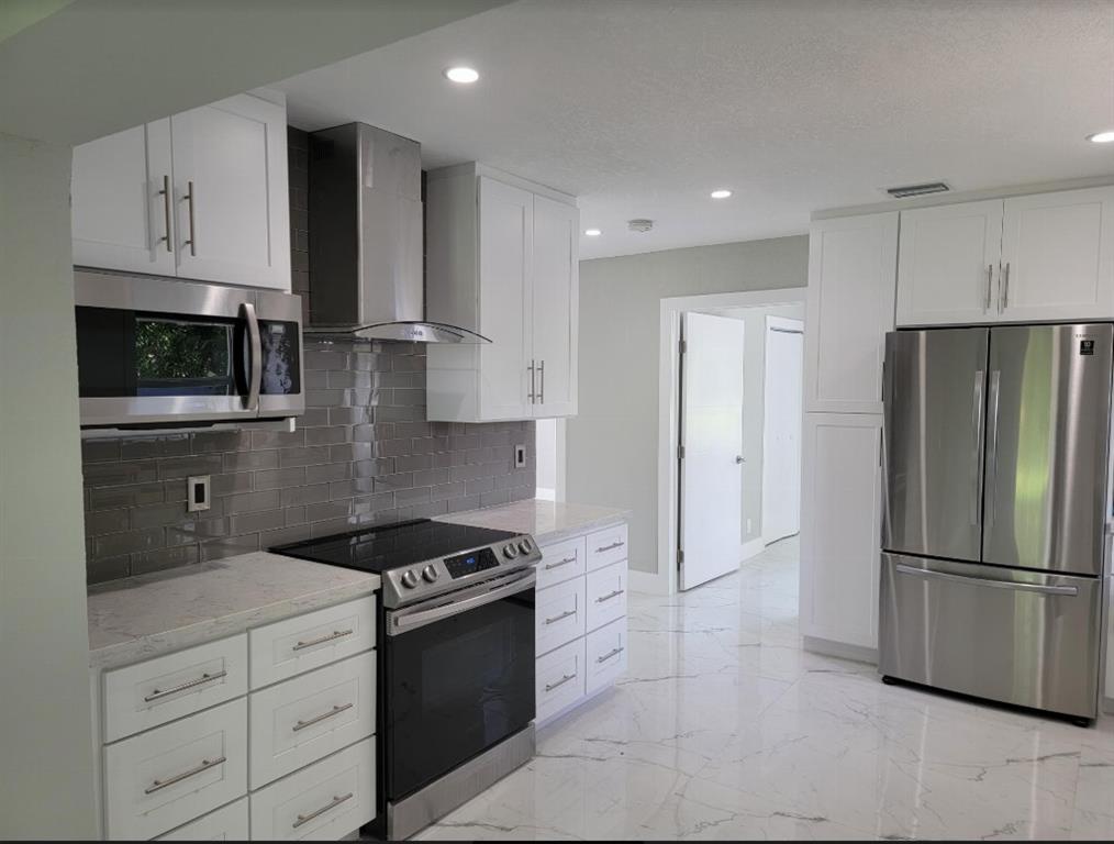 Completely renovated from the studs and all-permitted. Everything is brand new including: high-impact hurricane windows and doors, electrical, plumbing, high-efficiency 4 ton air-conditioner, sleek white Shaker kitchen cabinets with white quartz countertops and gorgeous glass backsplash open to oversized family room, high-end five-piece stainless-steel kitchen appliance suite including vent hood, vaulted-ceiling master bedroom suite with walk-in closet and luxurious master bath with double vanities and large glass-enclosed shower, guest bath with floor-to-ceiling white tumbled marble subway tile, 24x48 white polished porcelain floor tile in all rooms, recessed lighting throughout and so much more!