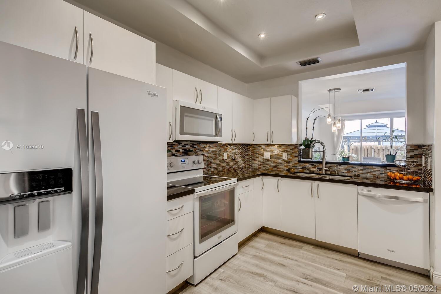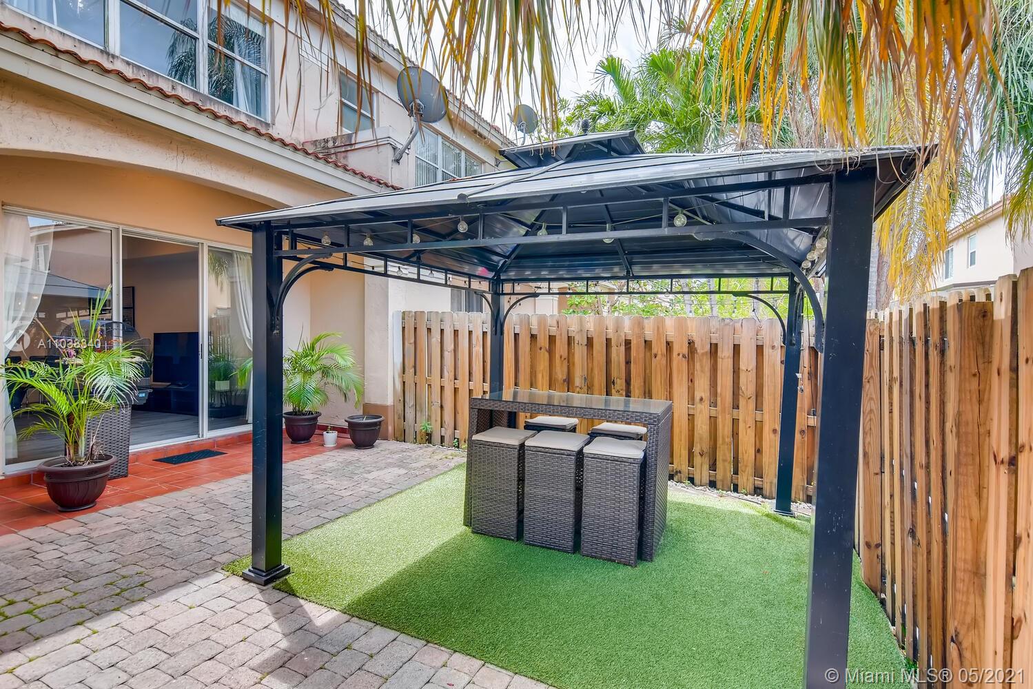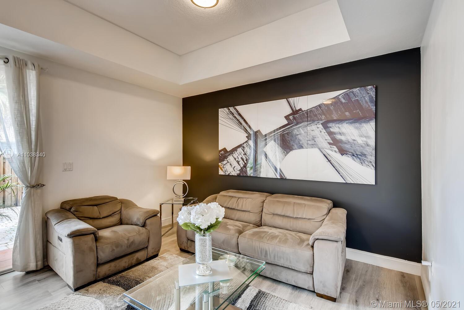Lush greenery and a gated front porch add great curb appeal, while gray wood toned floors and natural light create a bright and inviting interior. Sliding glass doors create a seamless indoor/outdoor space between the living room, featuring a tray ceiling and stylish accent wall, and the fenced-in backyard, complete with a paver patio, pergola covered turf lawn, and tropical landscaping. In the kitchen, black countertops nicely contrast the white cabinets and appliances, and recessed and under cabinet light reflect off the glass tile backsplash. A bar pass-through makes serving to the pendant lit dining area a breeze, while a downstairs powder room is convenient for guests. Wind down in any one of the upstairs bedrooms; the primary has an ensuite bath, with a dual sink vanity.