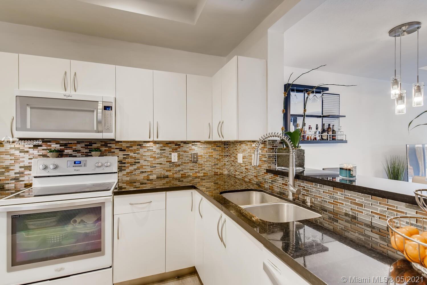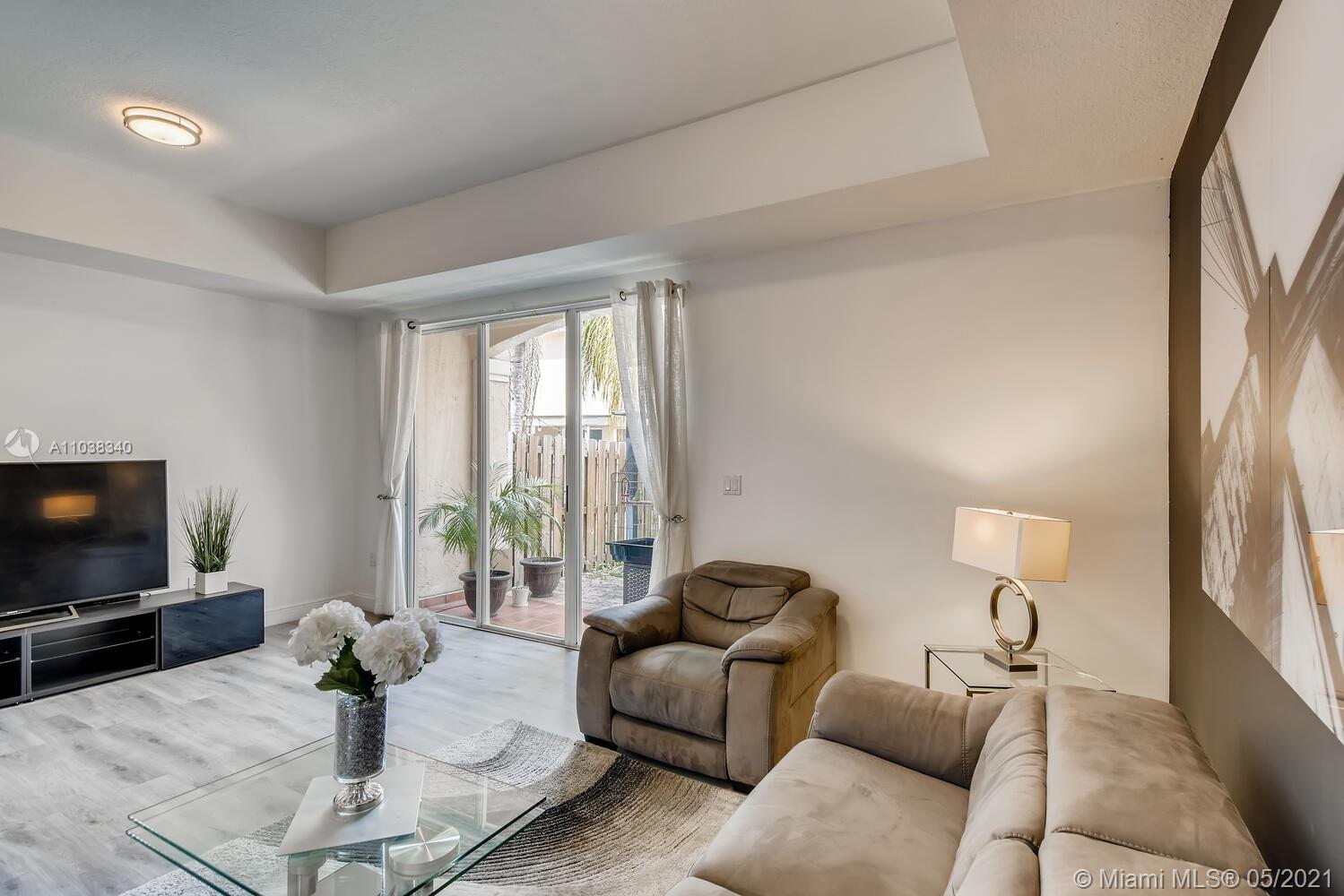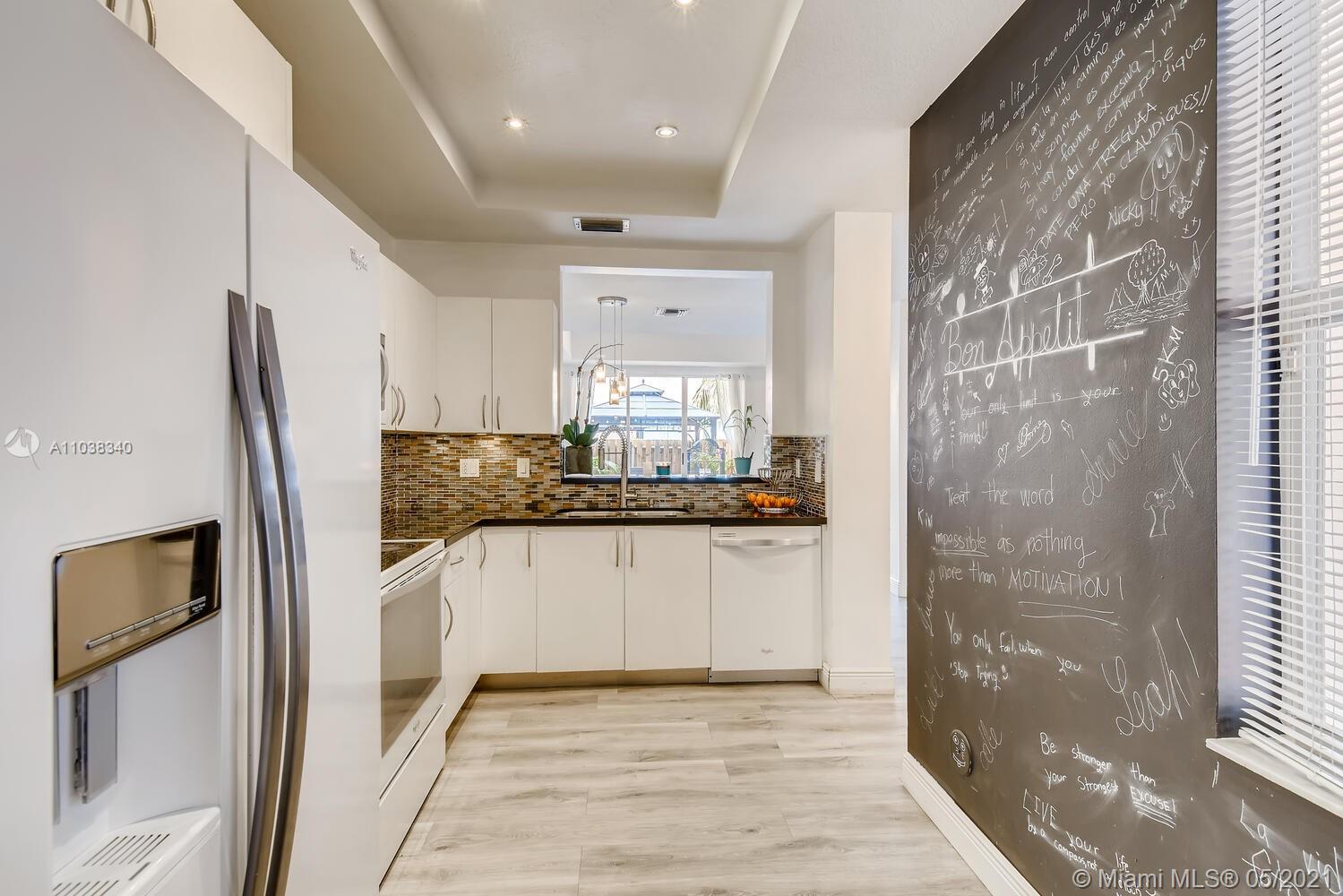 Lush greenery and a gated front porch add great curb appeal, while gray wood toned floors and natural light create a bright and inviting interior. Sliding glass doors create a seamless indoor/outdoor space between the living room, featuring a tray ceiling and stylish accent wall, and the fenced-in backyard, complete with a paver patio, pergola covered turf lawn, and tropical landscaping. In the kitchen, black countertops nicely contrast the white cabinets and appliances, and recessed and under cabinet light reflect off the glass tile backsplash. A bar pass-through makes serving to the pendant lit dining area a breeze, while a downstairs powder room is convenient for guests. Wind down in any one of the upstairs bedrooms; the primary has an ensuite bath, with a dual sink vanity.