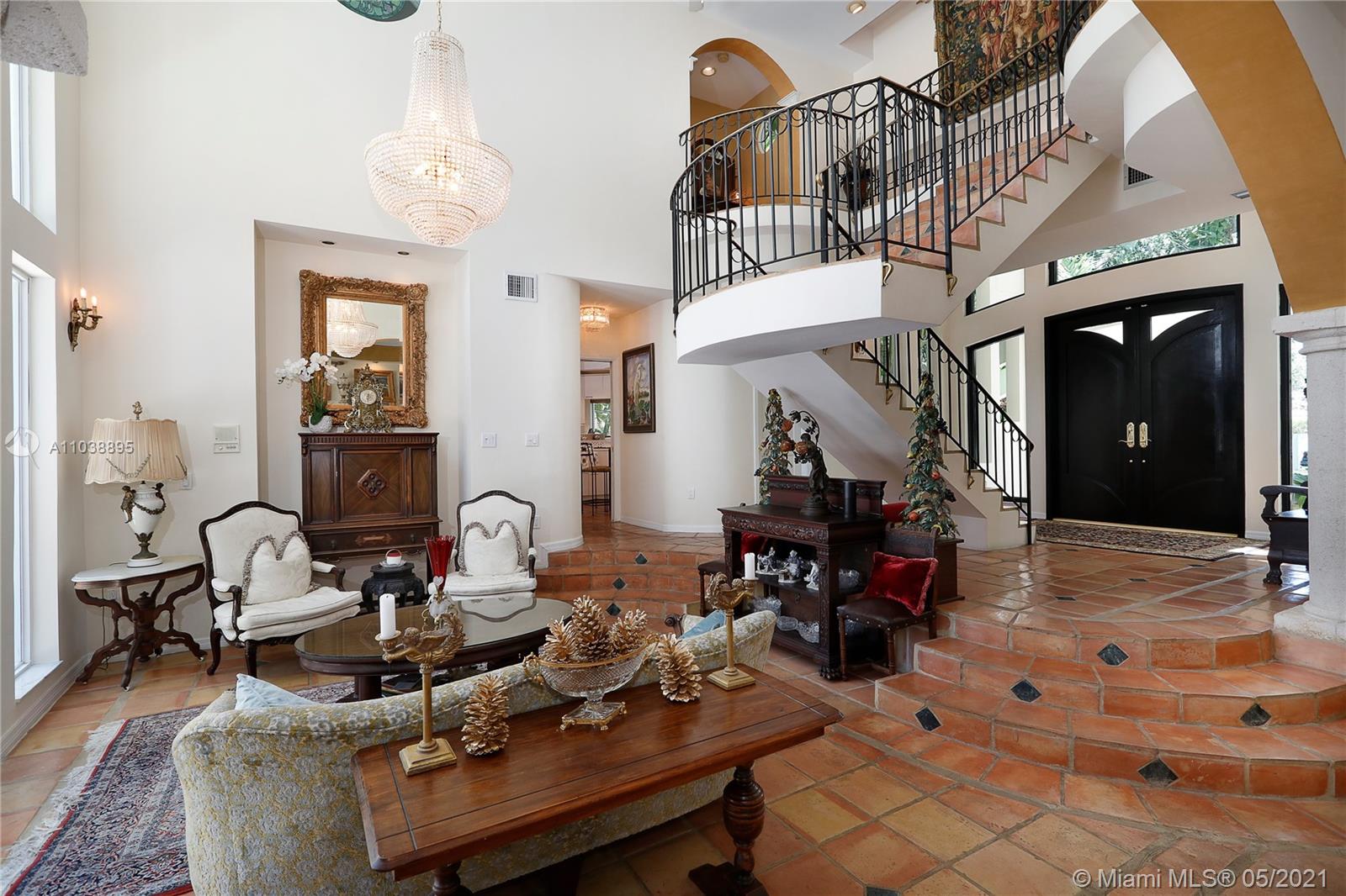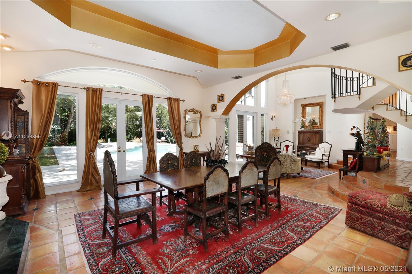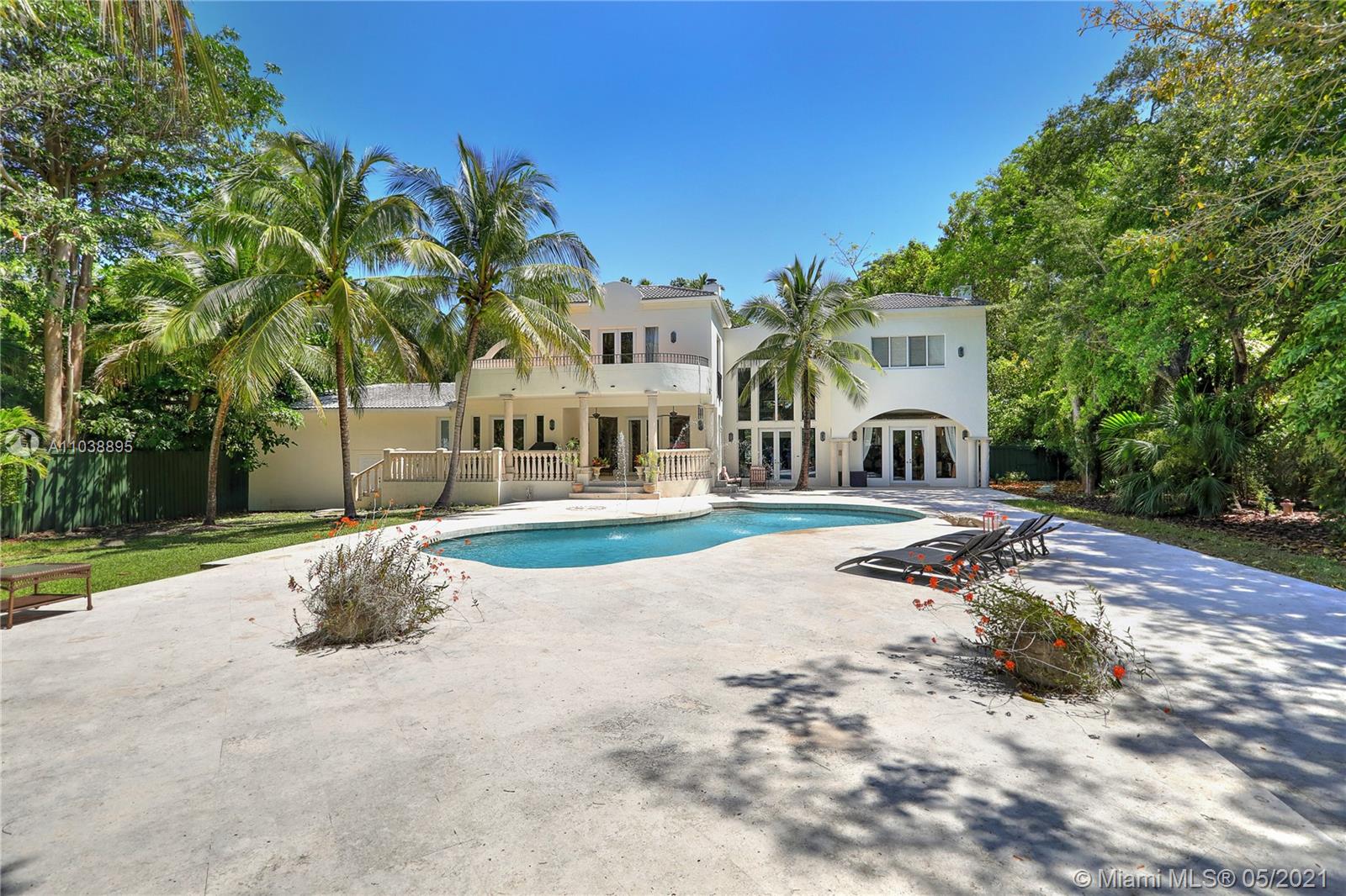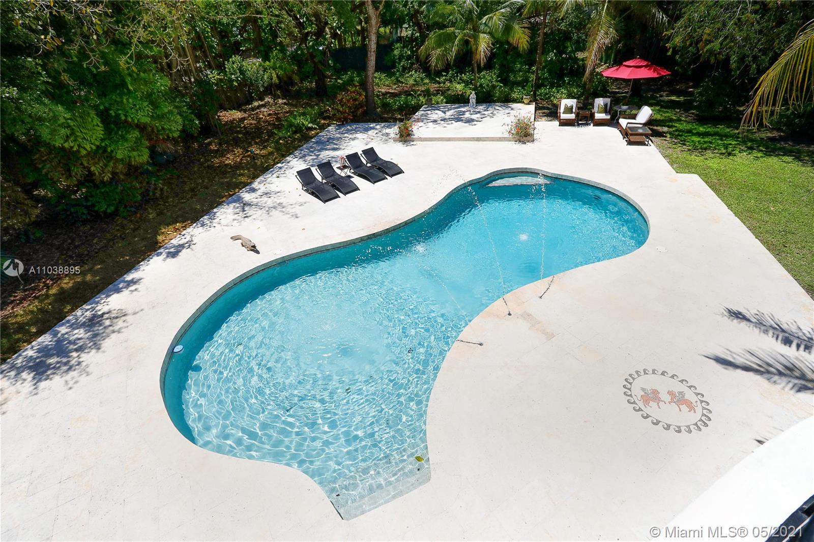 Tucked away on an ultra-lush 25,700 SF lot in guard-gated Hammock Lakes, this Art Deco-style 5 BR, 3.5 BA home is a wonderful opportunity! Designed for entertaining inside & out, it includes a foyer entry that leads to large formal liv & din rooms, the kitchen has gorgeous garden views, center island w/ gas range, & breakfast area, & is open to the spacious, sunlit fam rm. The formal & informal living spaces incl banks of French drs opening to covered patios, pool w/ fountains, & patio. 2nd floor primary suite is an oasis w/ sitting rm, large walk-in closets, marble BA w/ separate tub & shower, & private balcony. 2 more BRs upstairs & 2 down make this a true split plan. Sunset Elementary district, 2-car garage, laundry rm, roving security, circular drive, impact glass, & more!
