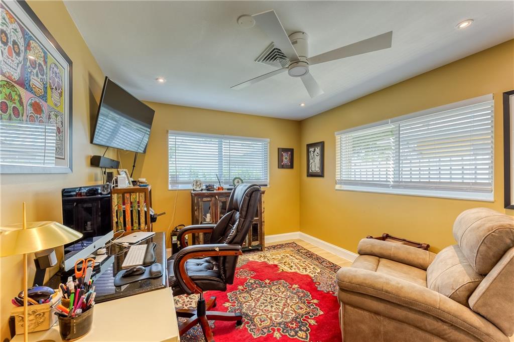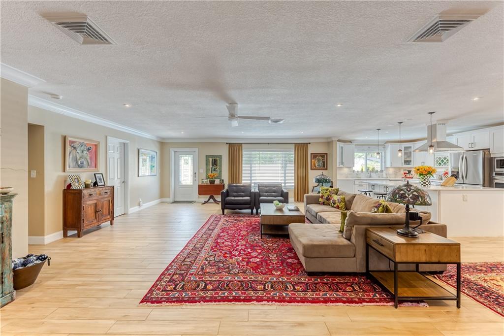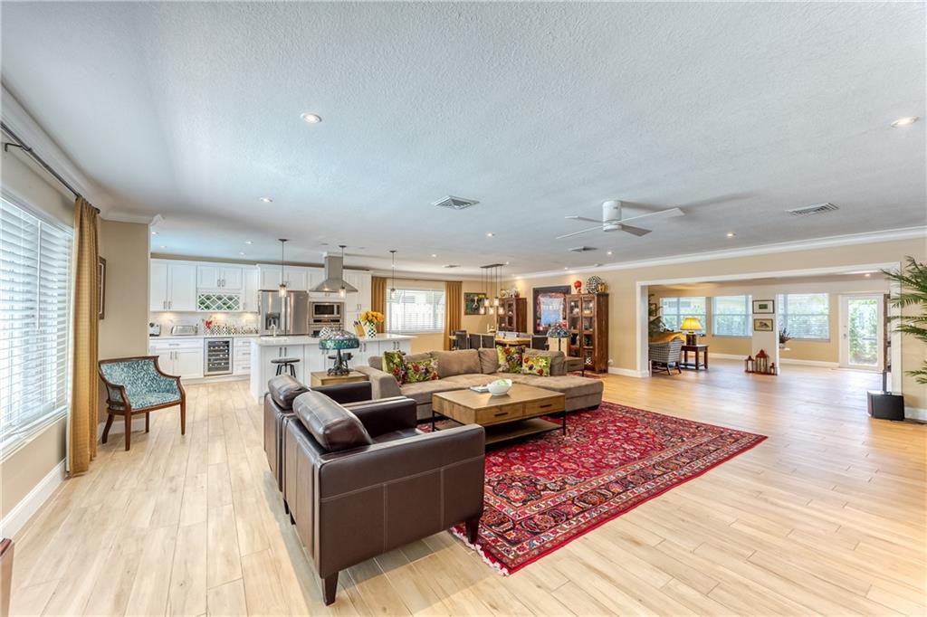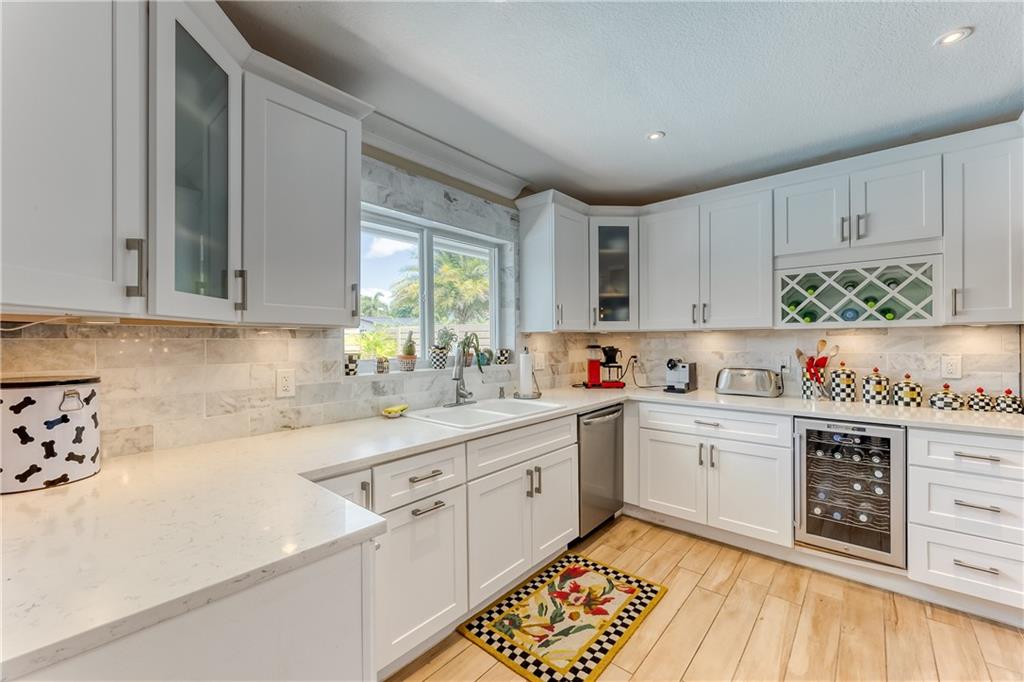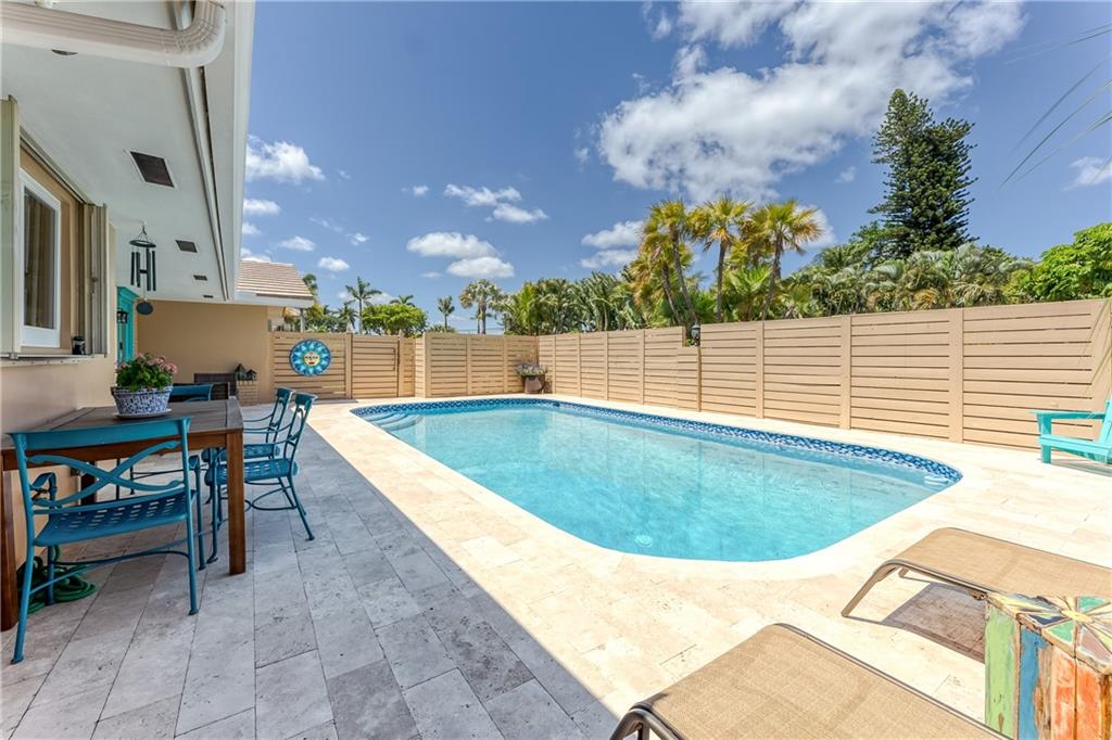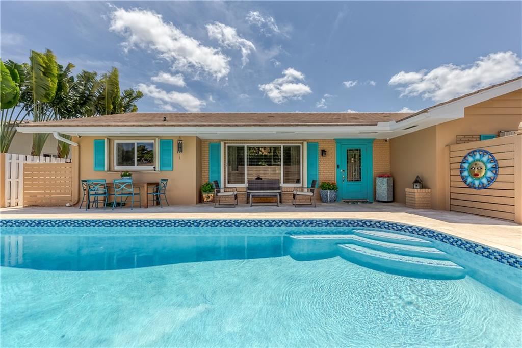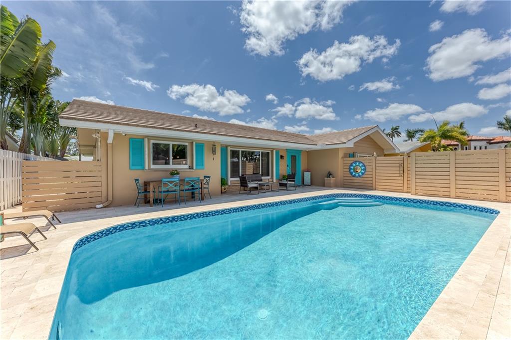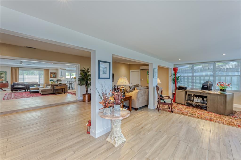 Large Open Contemporary Home in Coral Ridge Isles! Generous 4 bedrooms, 3 bath on a larger lot at 7,538sf. The newly resurfaced solar heated pool with attractive Travertine pavers greets you as you enter your gated compound. Truly open concept living, the kitchen is perfectly situated for entertaining - marble backsplash, quartz counter tops, all stainless steel appliances, cook island & wine cooler. Ceramic plank flooring throughout the house, new central AC system in 2019 with added AC mini split in the 2nd living area. House protected with mostly all impact windows & doors, easy accordion shutters for the back office corner. Two Bedrooms have en suite bathrooms, the other 2 bedrooms share a hall bathroom. Large indoor laundry room too. Welcome home to your private resort!