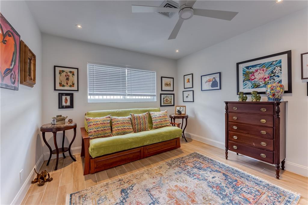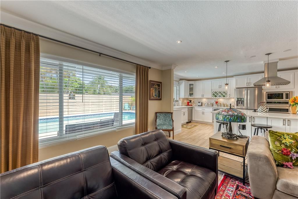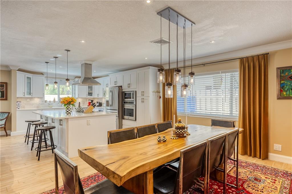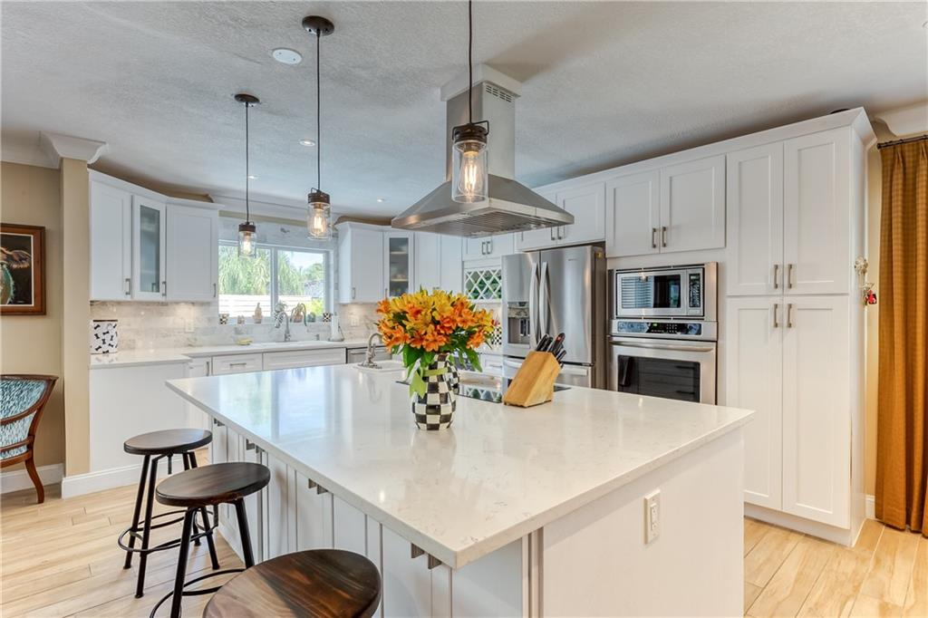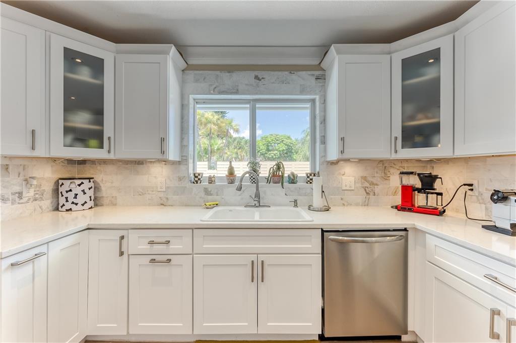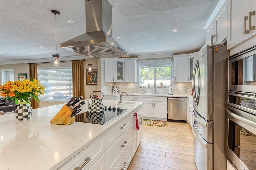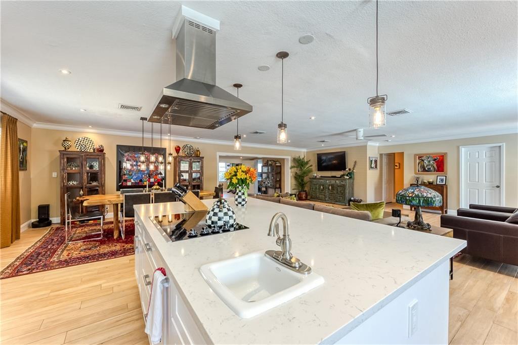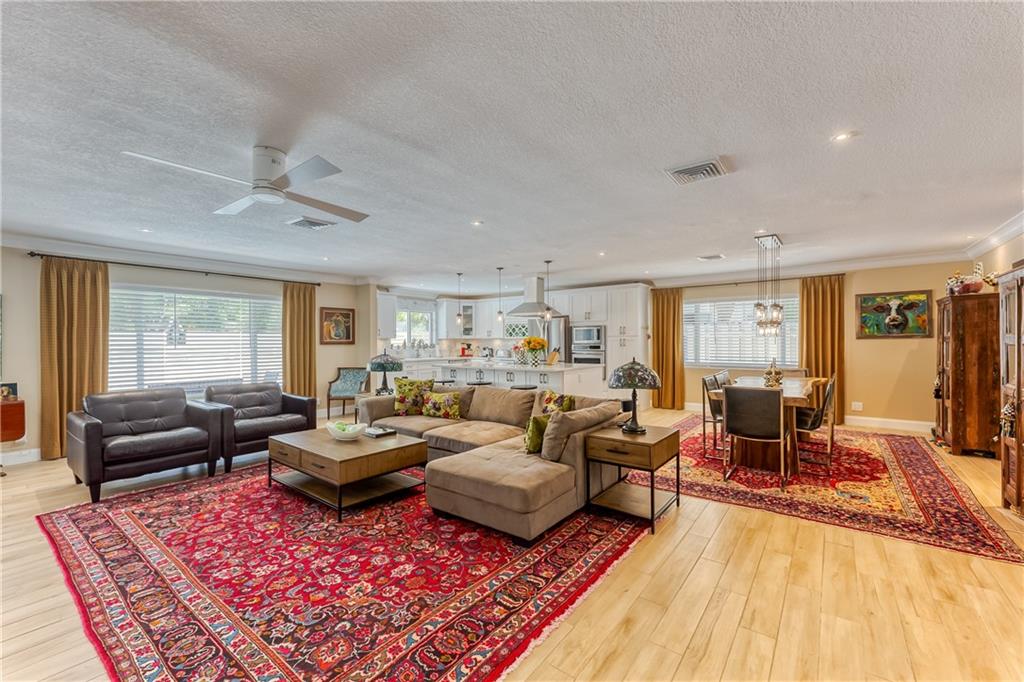 Large Open Contemporary Home in Coral Ridge Isles! Generous 4 bedrooms, 3 bath on a larger lot at 7,538sf. The newly resurfaced solar heated pool with attractive Travertine pavers greets you as you enter your gated compound. Truly open concept living, the kitchen is perfectly situated for entertaining - marble backsplash, quartz counter tops, all stainless steel appliances, cook island & wine cooler. Ceramic plank flooring throughout the house, new central AC system in 2019 with added AC mini split in the 2nd living area. House protected with mostly all impact windows & doors, easy accordion shutters for the back office corner. Two Bedrooms have en suite bathrooms, the other 2 bedrooms share a hall bathroom. Large indoor laundry room too. Welcome home to your private resort!