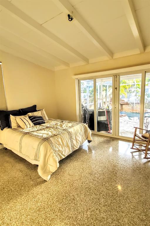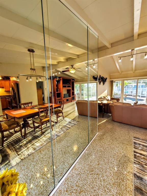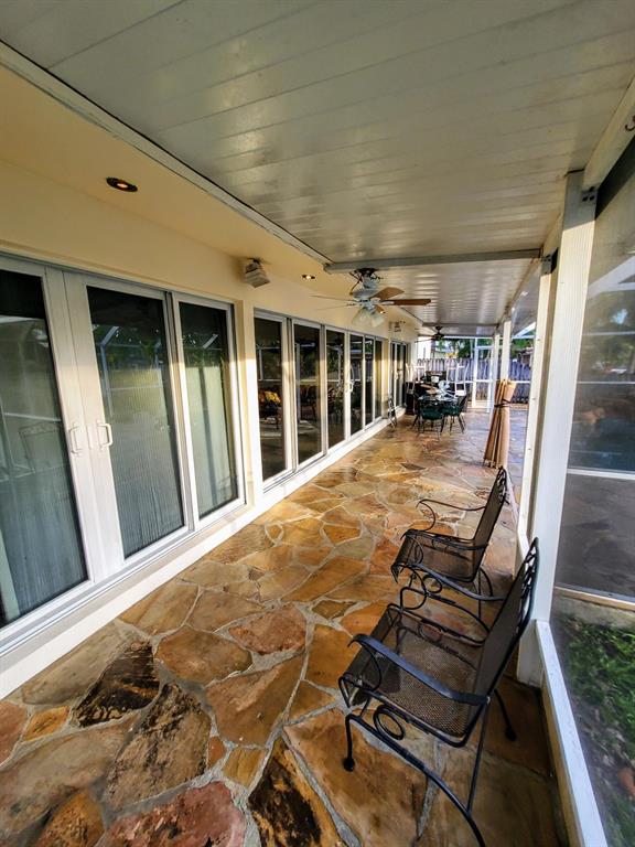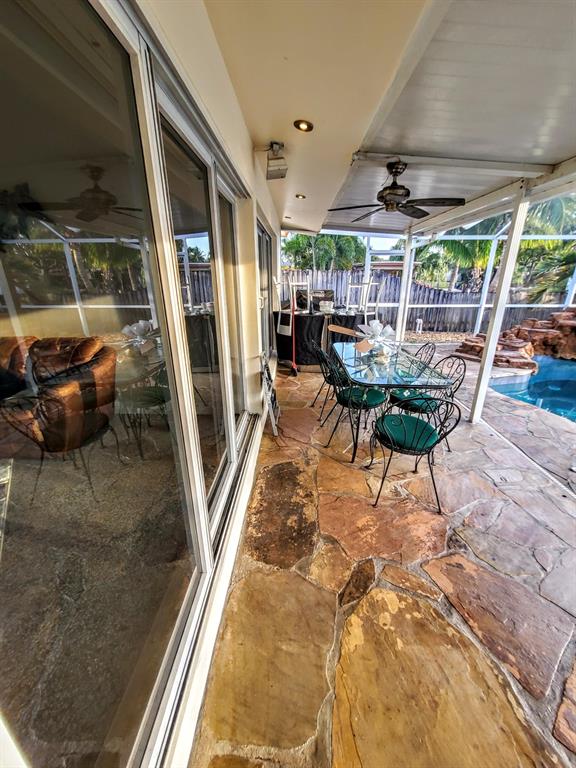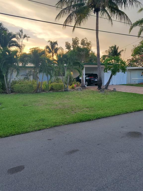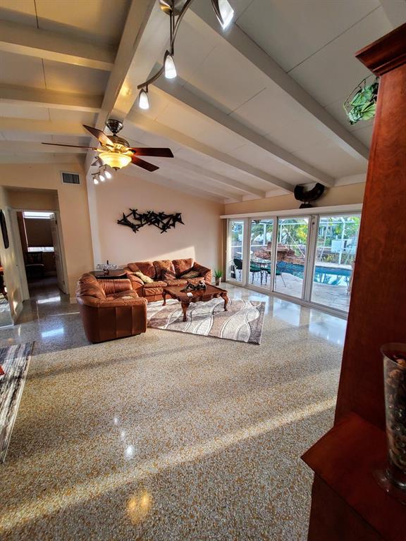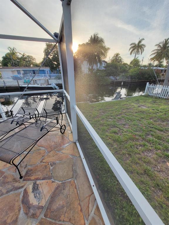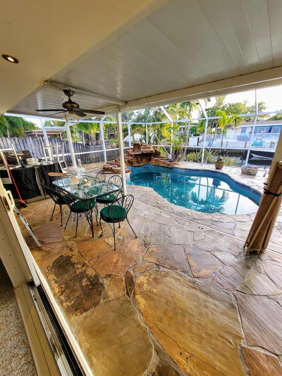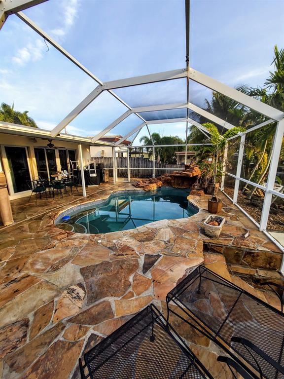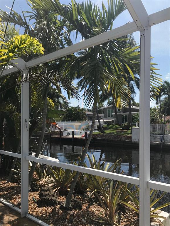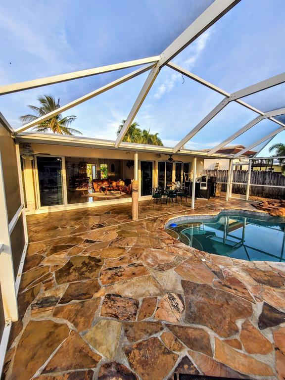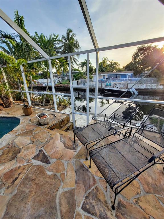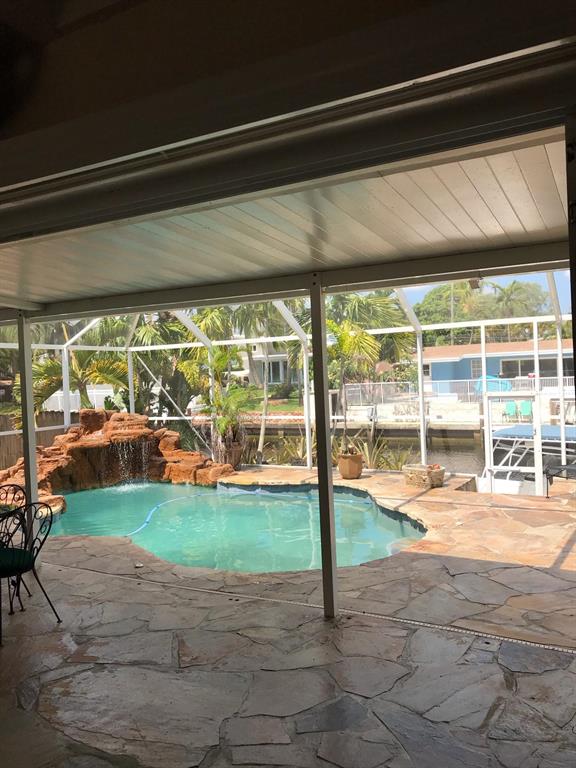 Welcome to this stunning 3 bedroom 2 bathroom Ranch style WATERFRONT home in the very sought after boating neighborhood of Lauderdale Isles. First pulling into the driveway you have a stamped concrete doublewide driveway and single carport with walkway to you etched glass front door. Into flawless earth toned original terrazzo floors. the far wall of glass frames the stunning stone pool deck and matching stone grotto pool and waterfalls all under a new cathedral screen enclosure. just beyond is access to your 65' of waterfront. Inside is a split plan with master suite to one side and two beds and a bath opposite, with an open plan main living and dining area. Updated granite and SS galley style kitchen, 2x new HVAC, metal roof, updated baths, impact glass, build ins, hand crafted accents
