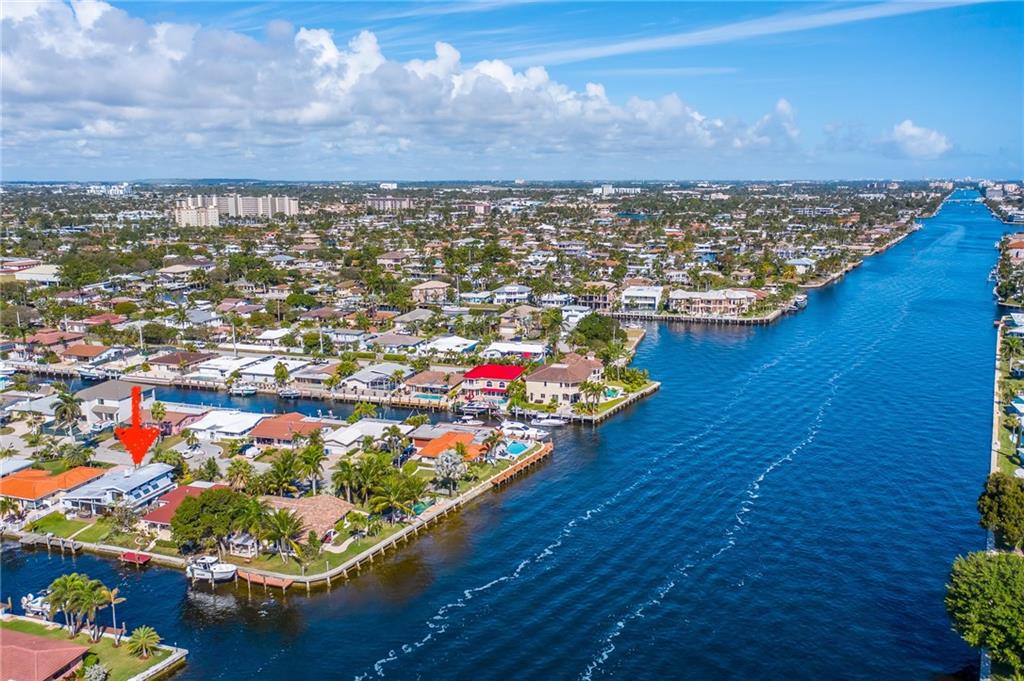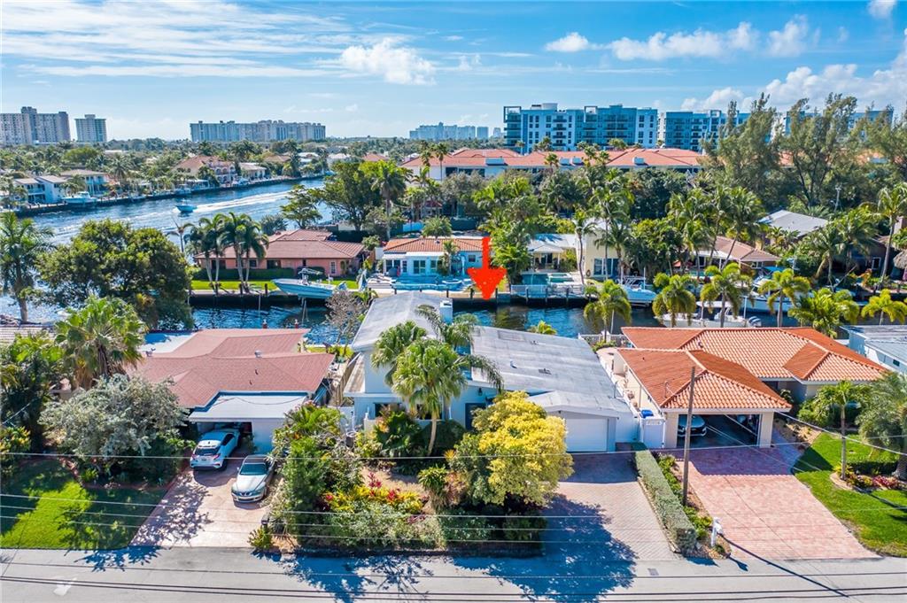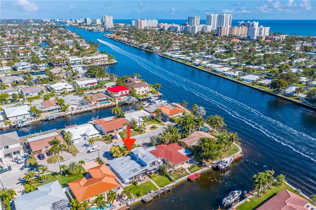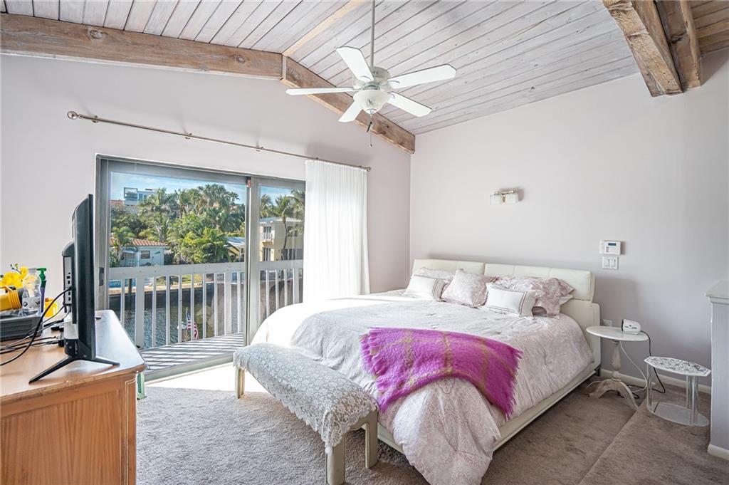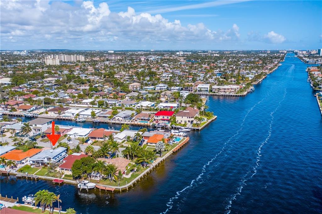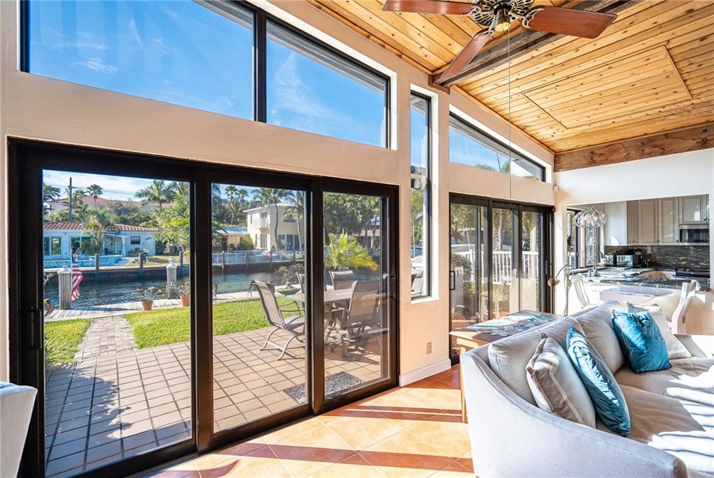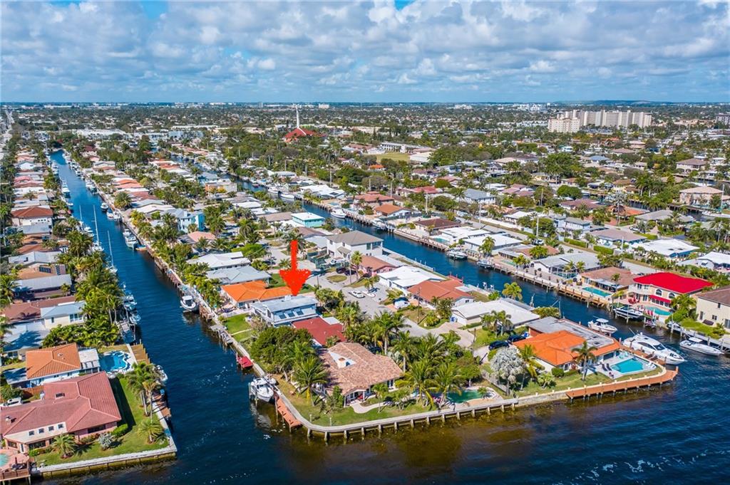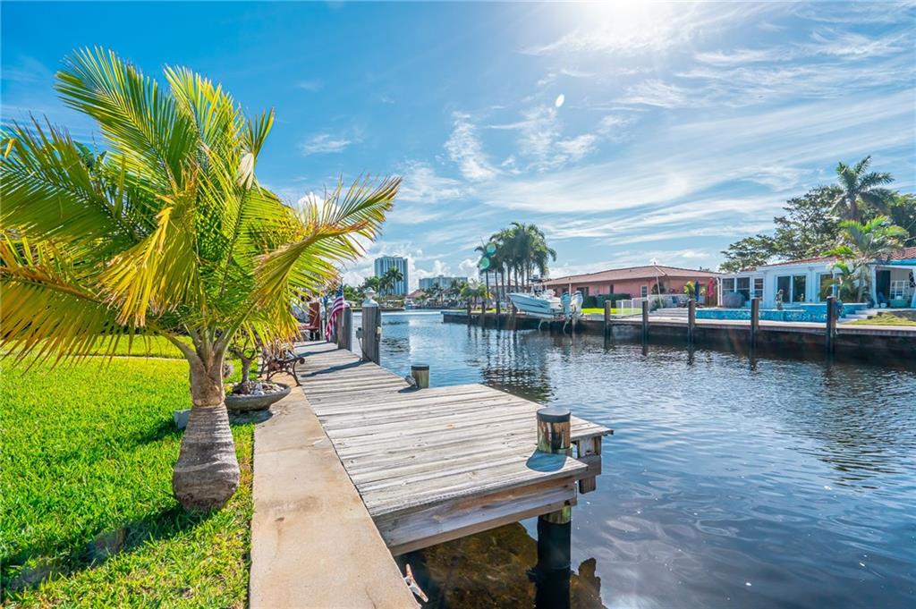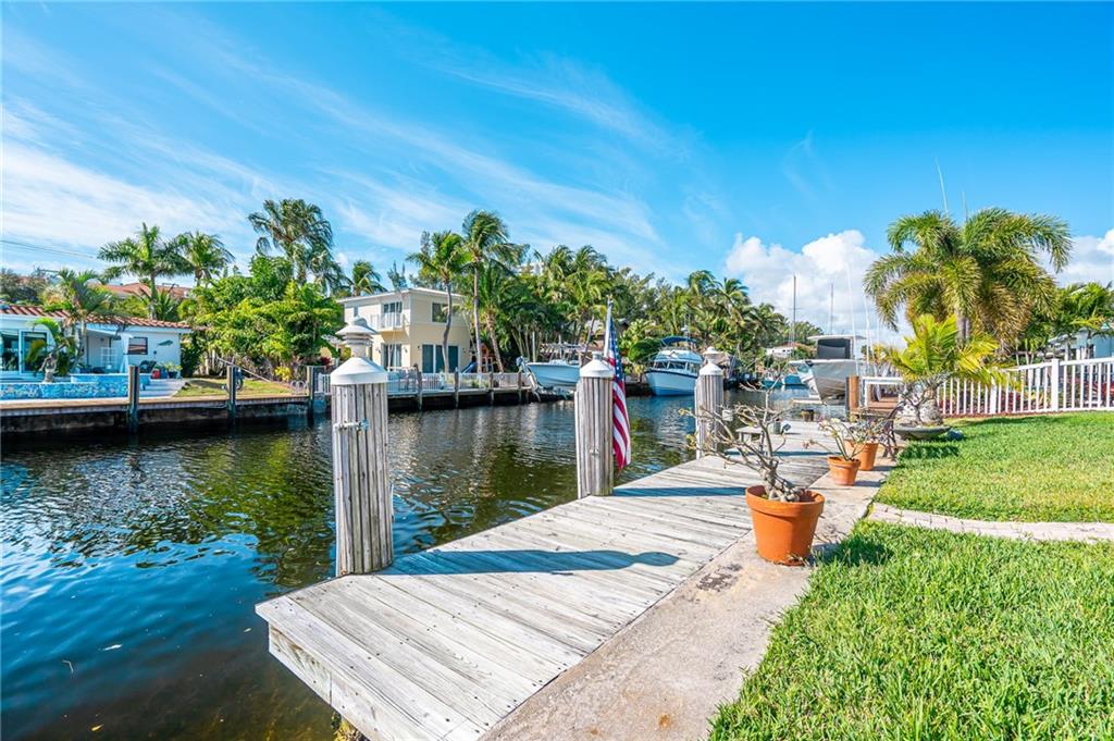 Second home from the point with fabulous intracoastal views! Spacious and stylish waterfront home in Pompano Isles neighborhood boasts exposed wood beam ceiling, 2 car garage, all impact windows, new kitchen with custom wood cabinets/granite counters and backsplash/stainless appliances with dining area attached. Entire second floor loft master suite with balcony, sitting area and spectacular intracoastal views from bed! Water views from the kitchen, living room and den/family room. Lot is 60X100 with a 40' dock (complete with water and electric on the dock so easy to install a lift). Room for a pool. Outdoor patio with retractable awnings are the perfect place to enjoy your waterfront view! Great entertaining home!