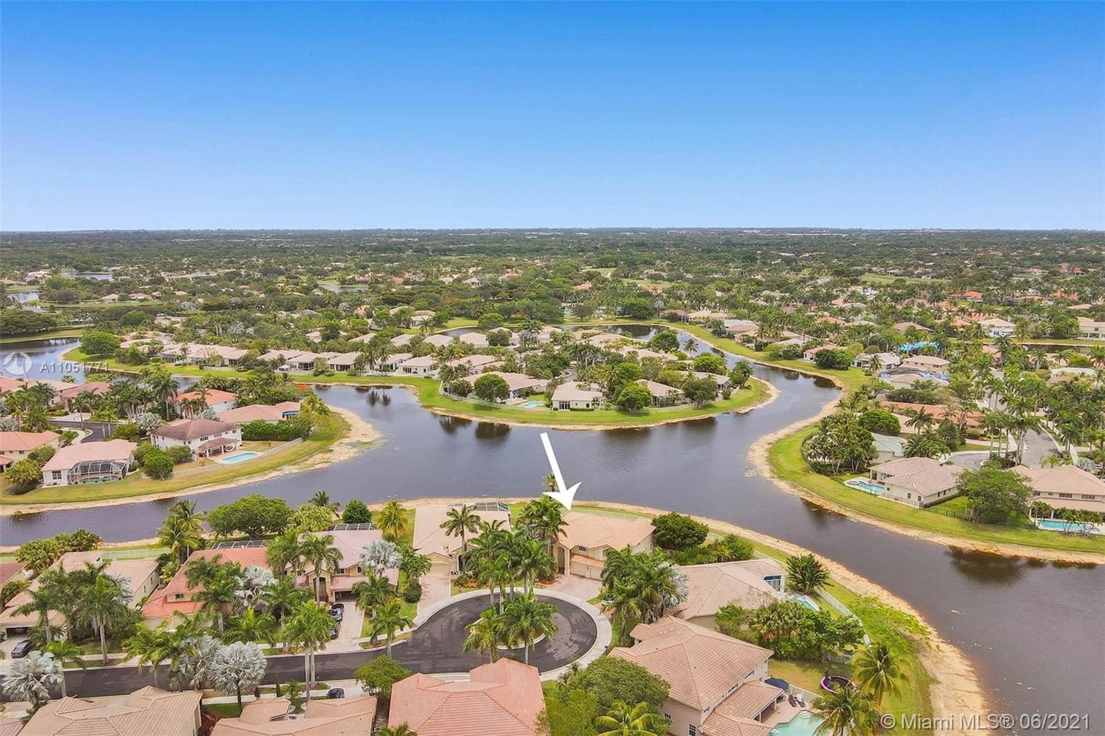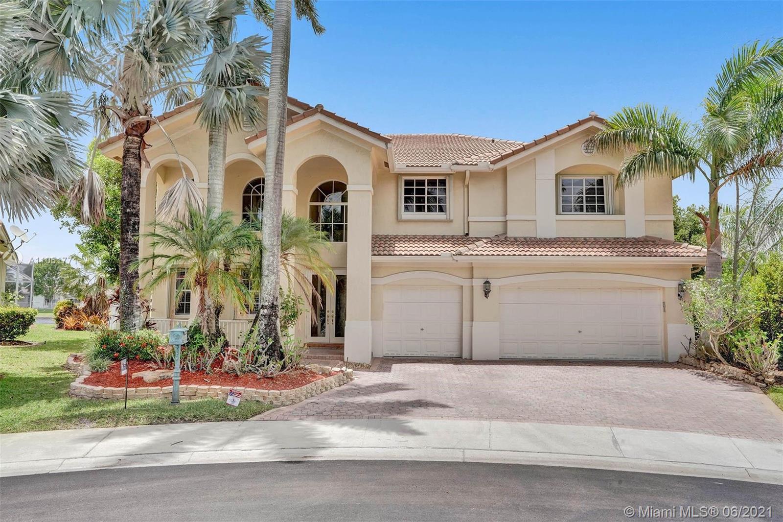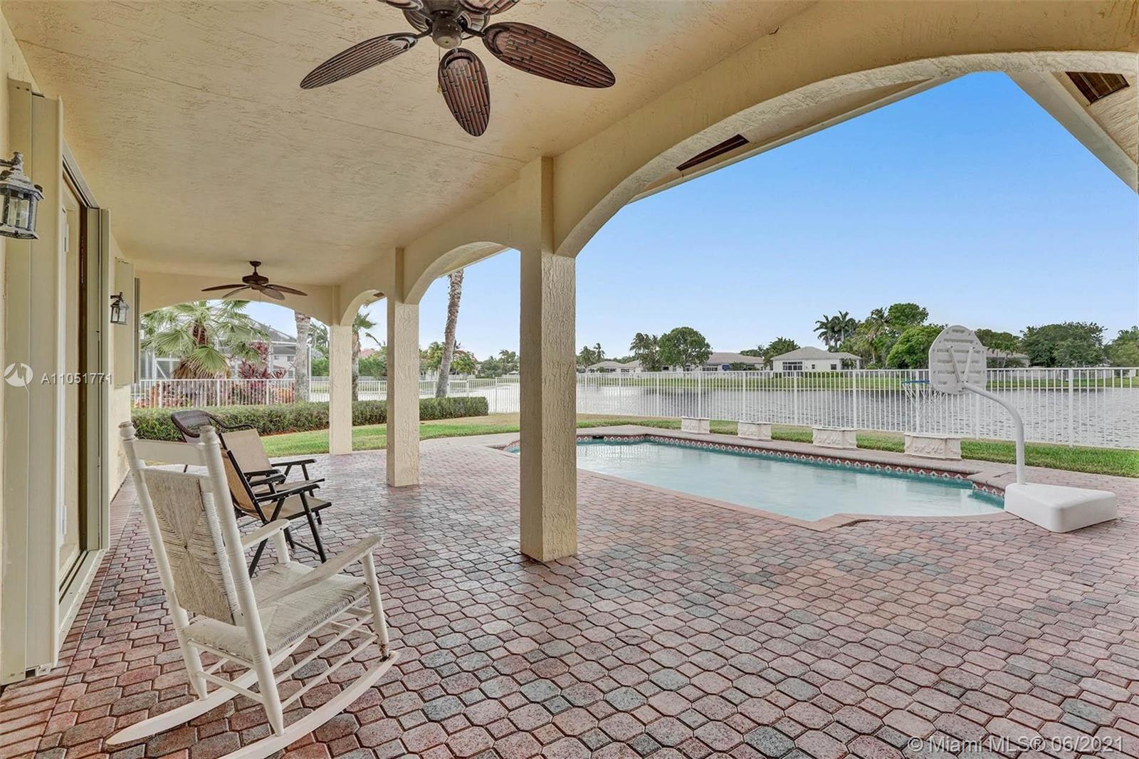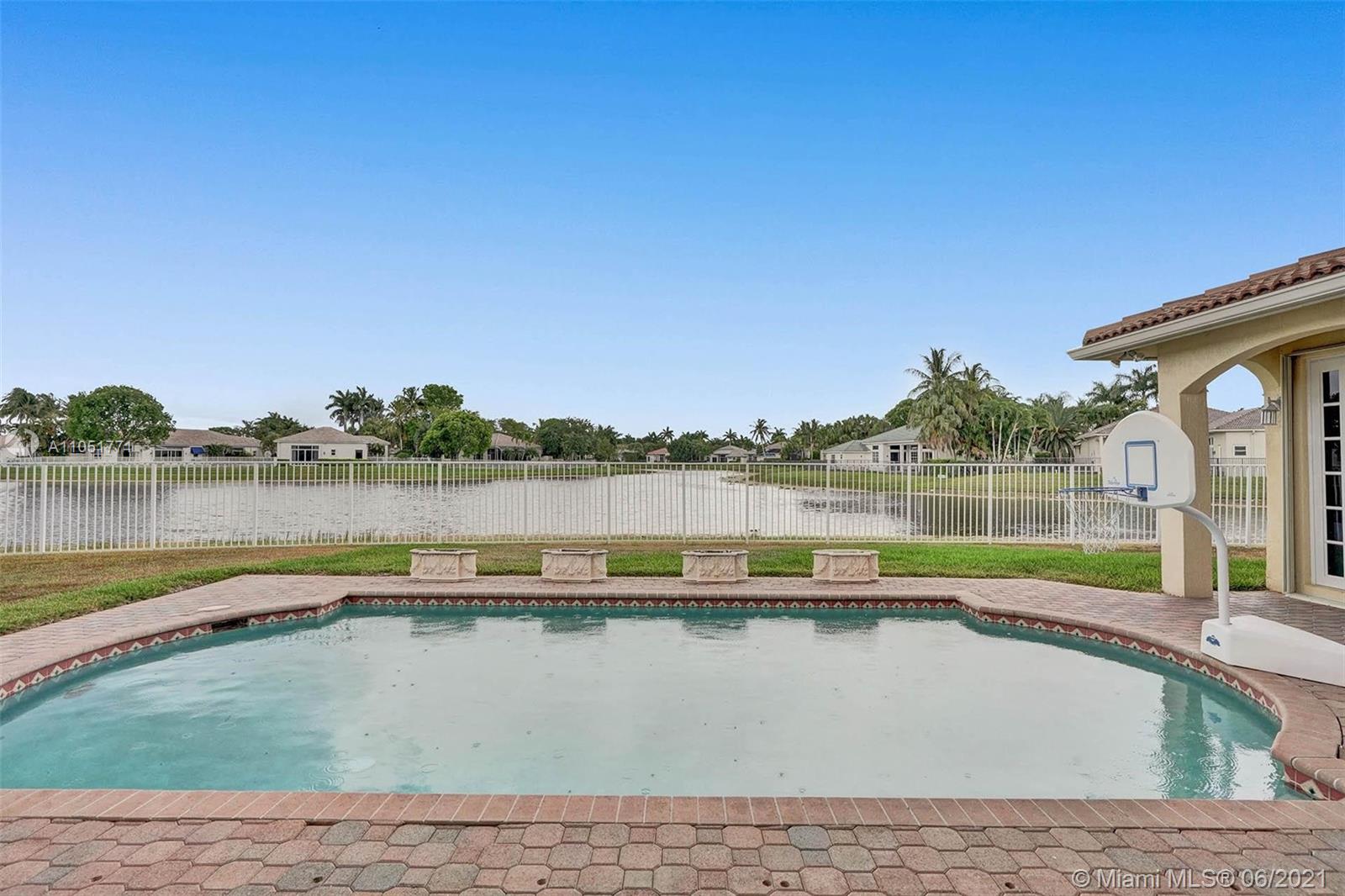 Looking for an expansive 15,000+ cul de sac lot with endless lake views, Popular two-story home with five spacious bedrooms plus an office and playroom with five full baths. Meticulously maintained with marble floors throughout living areas. Addition of full bedroom, playroom, and cabana bath. Wood kitchen cabinets with Stainless Steel appliances and granite countertops. French doors to the private pool and paver patio, fully fenced. Additional den/office attached to the owner's bedroom. Neutral decor throughout with fresh paint. One of the largest lots in Hunters Pointe. Partial impact and accordion protection.