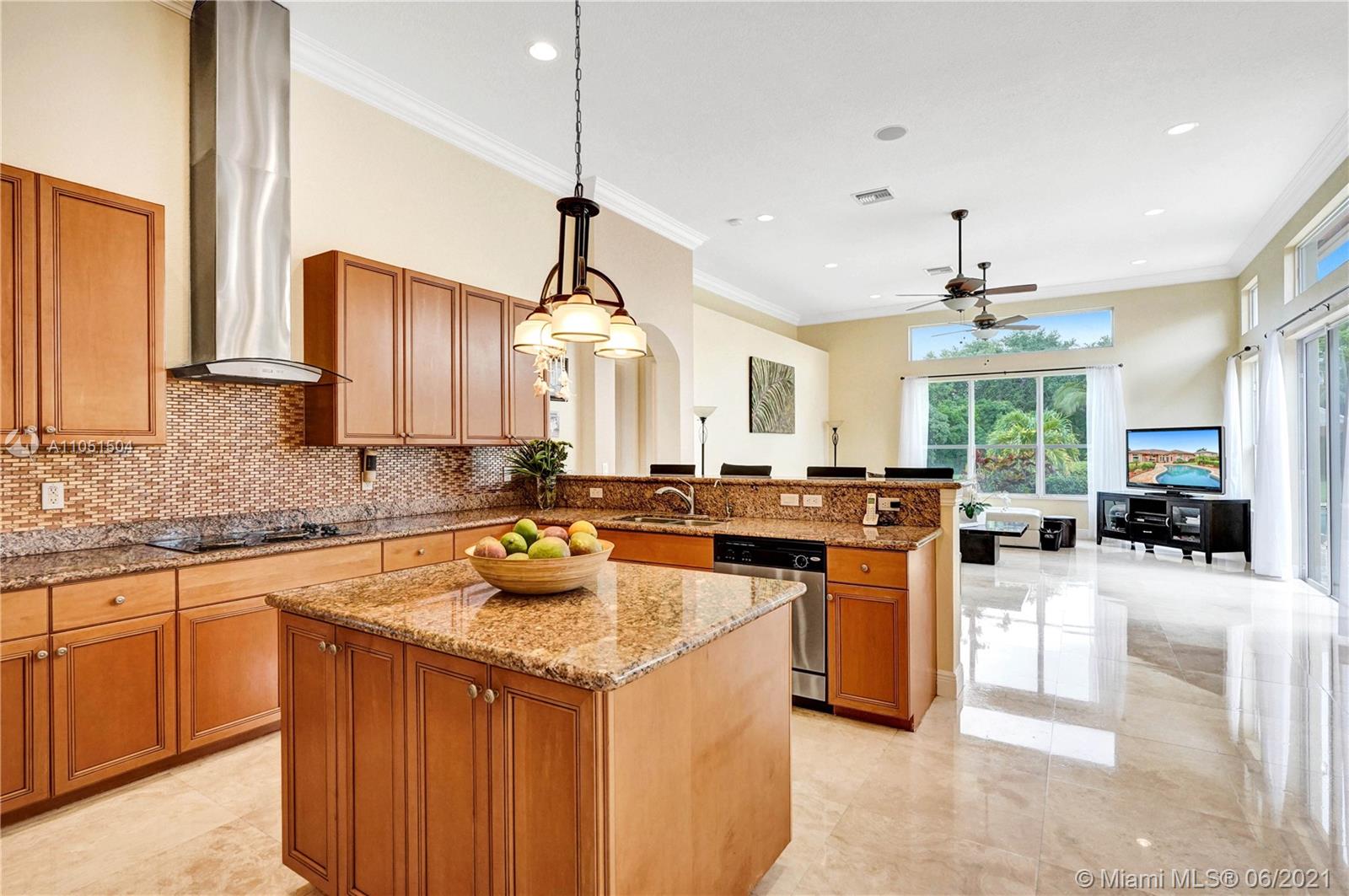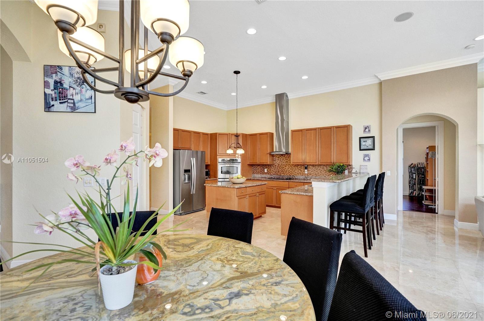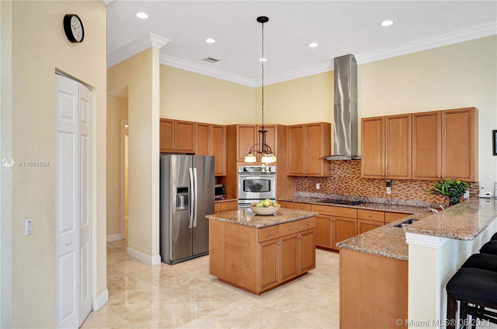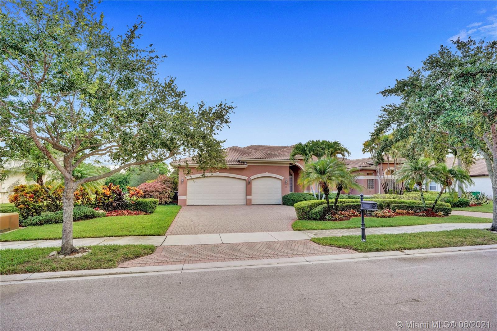 Rarely on the market this Caliterra/92 ranch model offers 5 bedrooms, 3 1/2 baths, 1 office and 3 car garage. The lushly landscaped exteriors and the free shaped pool create a perfect serene atmosphere for the new owners. Very elegantly designed home with an alluring split floor plan great for entertaining, kitchen with center island and granite countertops. This home features marble floors, newly installed bamboo floors in all bedrooms, custom made cabinetry. All windows have hurricane shutters. Stunning house, very light and bright from all rooms, quality appointed, with multiple walk-in closets. Great amenities (club house with gym, tennis courts, basketball courts, jogging trails), lush landscaping and tree lined streets will truly make your living an awe inspiring one!