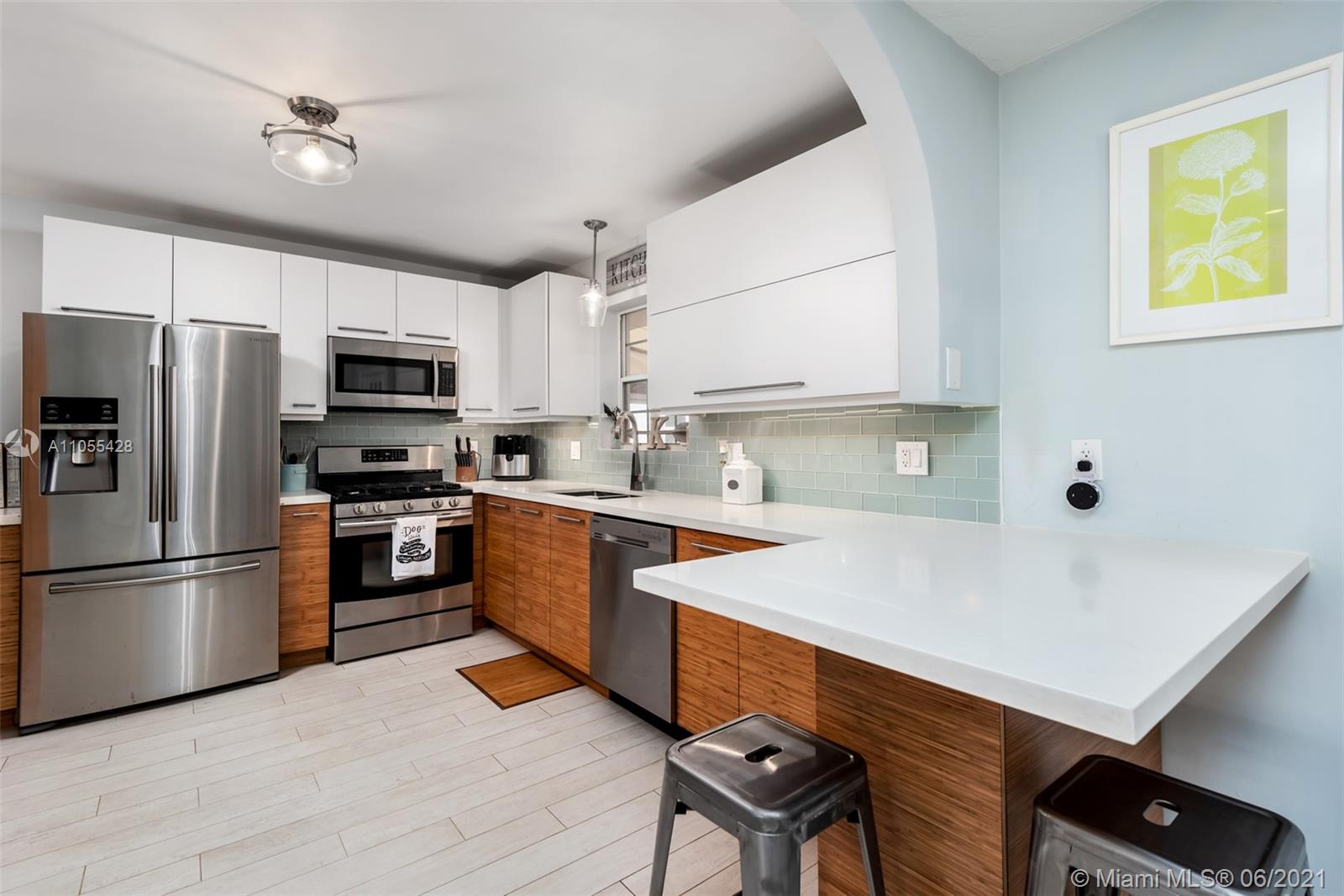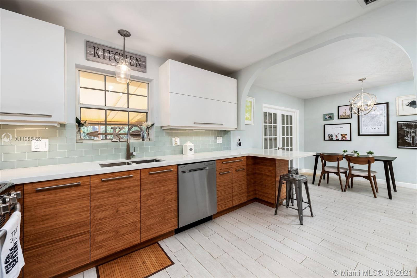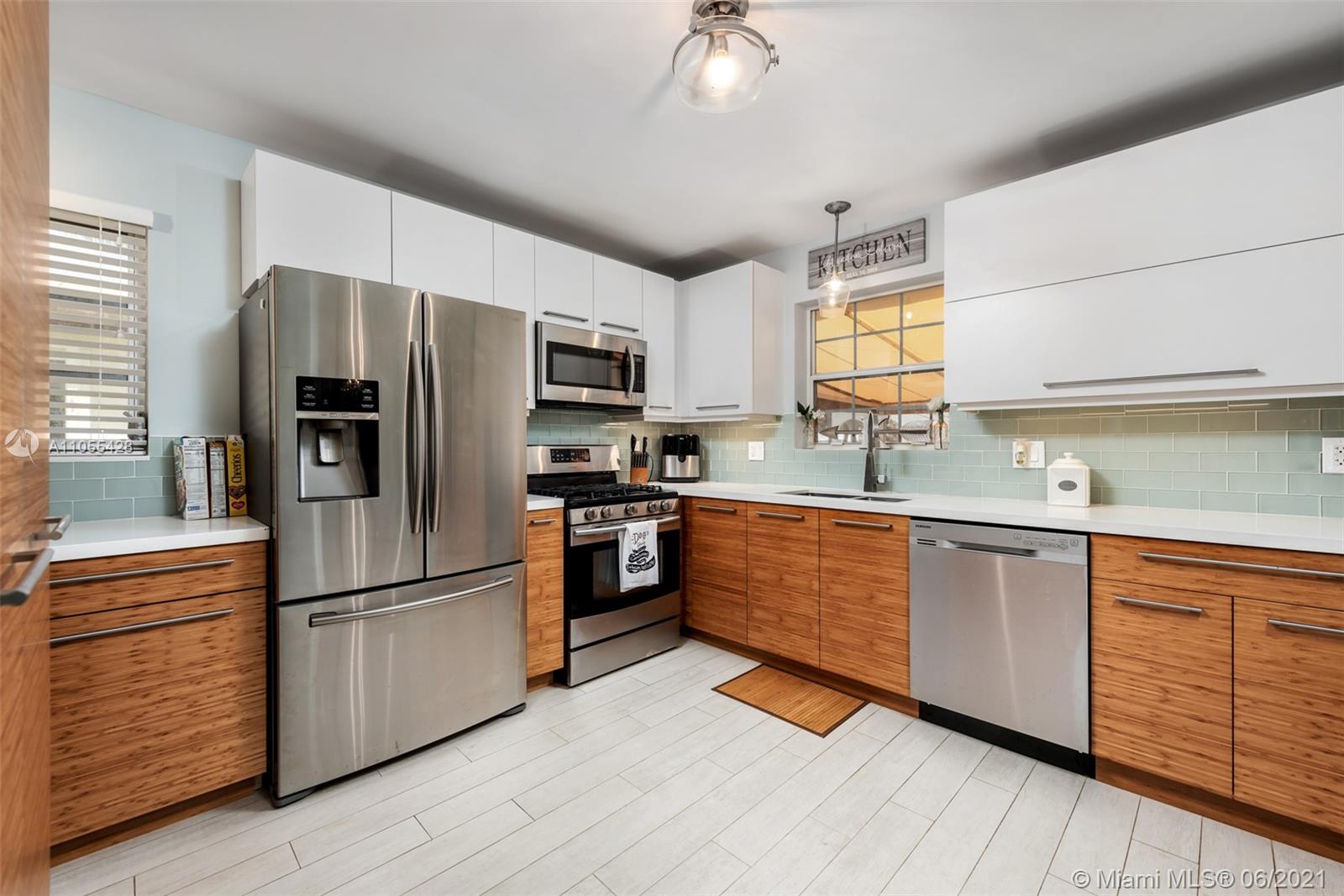 Home 1400 sq ft per owner. Beautifully updated 3 bed / 2 full baths open concept home in quaint & highly desirable Hollywood Lakes. Fully updated designer kitchen with bamboo cabinets, quartz countertops, stainless steel appliances, gas stove, new porcelain floors throughout. Updated bathrooms, 1 car garage with window & side door which can easily be converted into 4th bedroom. Spacious fenced backyard with fruit trees, and lot's of room for a pool. A/C 5 years old. Walking distance to ArtsPark at Young Circle Hollywood Beach Golf Club. Minutes to famous Hollywood Beach, Hollywood boardwalk, Downtown Hollywood, & new Margaritaville Beach Resort.
