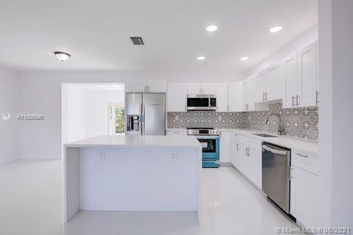 Beautifully Remodeled 3 BR 2 BATH W/ 2 Car Garage 2100 Total SQ FT including Large Covered Terrace. New Impact Windows and Doors throughout the house. All new underground PVC plumbing and all new electrical service box and all new switches and outlets. New Custom European Shaker Kitchen Cabinets with Quartz countertops . Brand new Stainless Steel Appliances including Refrigerator, Range , Microwave and Dishwasher. Brand New White porcelain tile throughout. All new interior doors and baseboards throughout. Bathrooms remodeled with all new tile, fixtures and vanities. House has natural gas service for Range, W/H and Dryer. Large CBS shed in the backyard. New flat roof for terrace area. Brand new 4 ton High Efficiency A/C . Vivint alarm system also included.