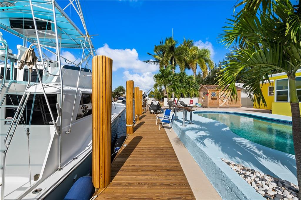 Boater’s delight Key West inspired 2 bed 2 bath home located in Pompano Isles, east of US-1 with no fixed bridges! This lot sits on 60 ft of canal frontage with a new deep water dock and can accommodate up to a 50’ boat. Step inside and you will find tile floors throughout the entire house, with direct water views and an abundance of natural light from nearly every room. Features include a laundry room, one car garage, hurricane impact windows & sliding doors leading you to this tropical outdoor paradise on the canal. Fenced in, this backyard has plenty of tranquil outdoor space with a heated saltwater pool, outdoor shower, fruit trees, and air conditioned entertainer’s shed! Walking distance to many shops and restaurants, and minutes from the beach, this is a home you don’t want to miss.
