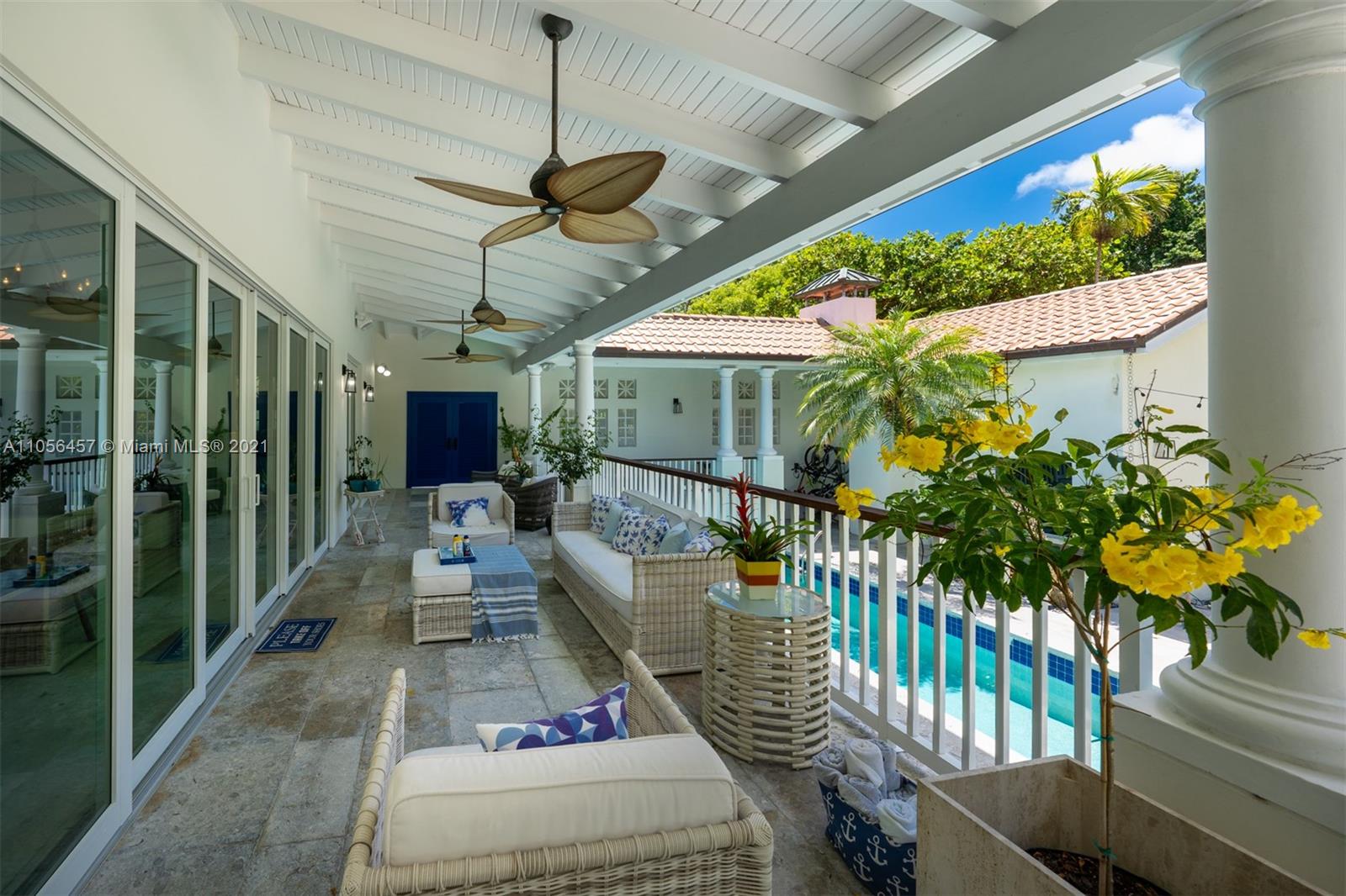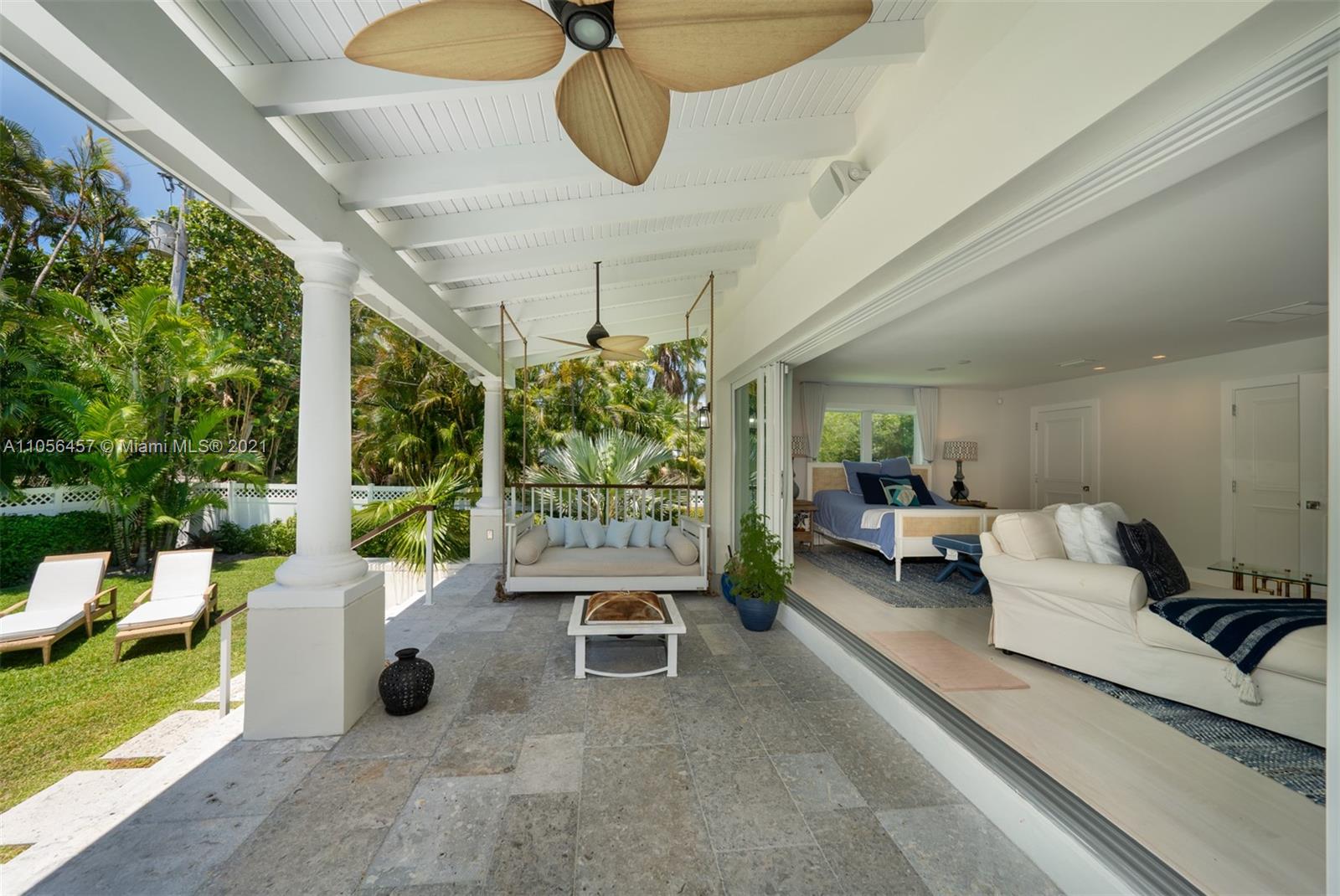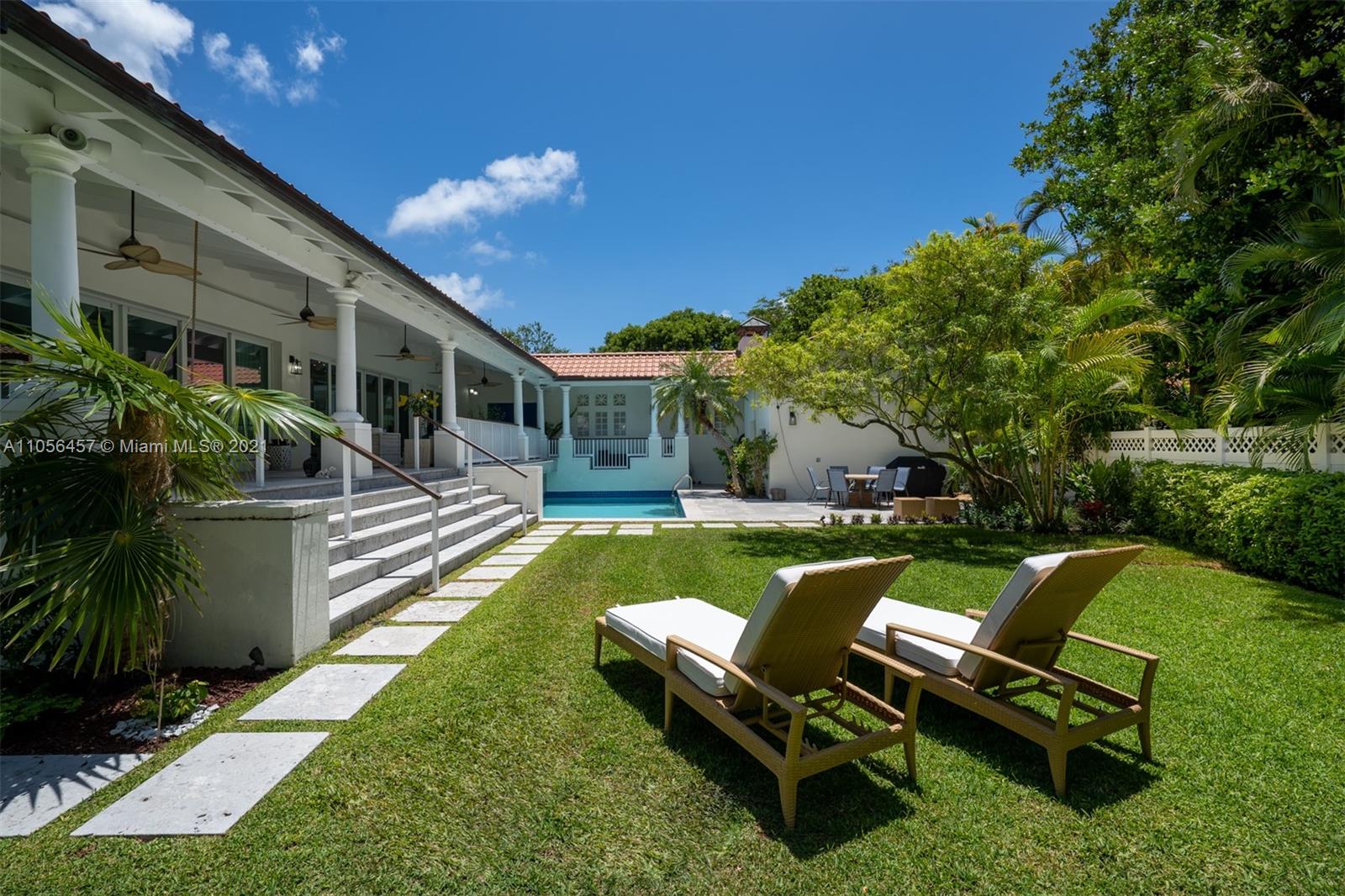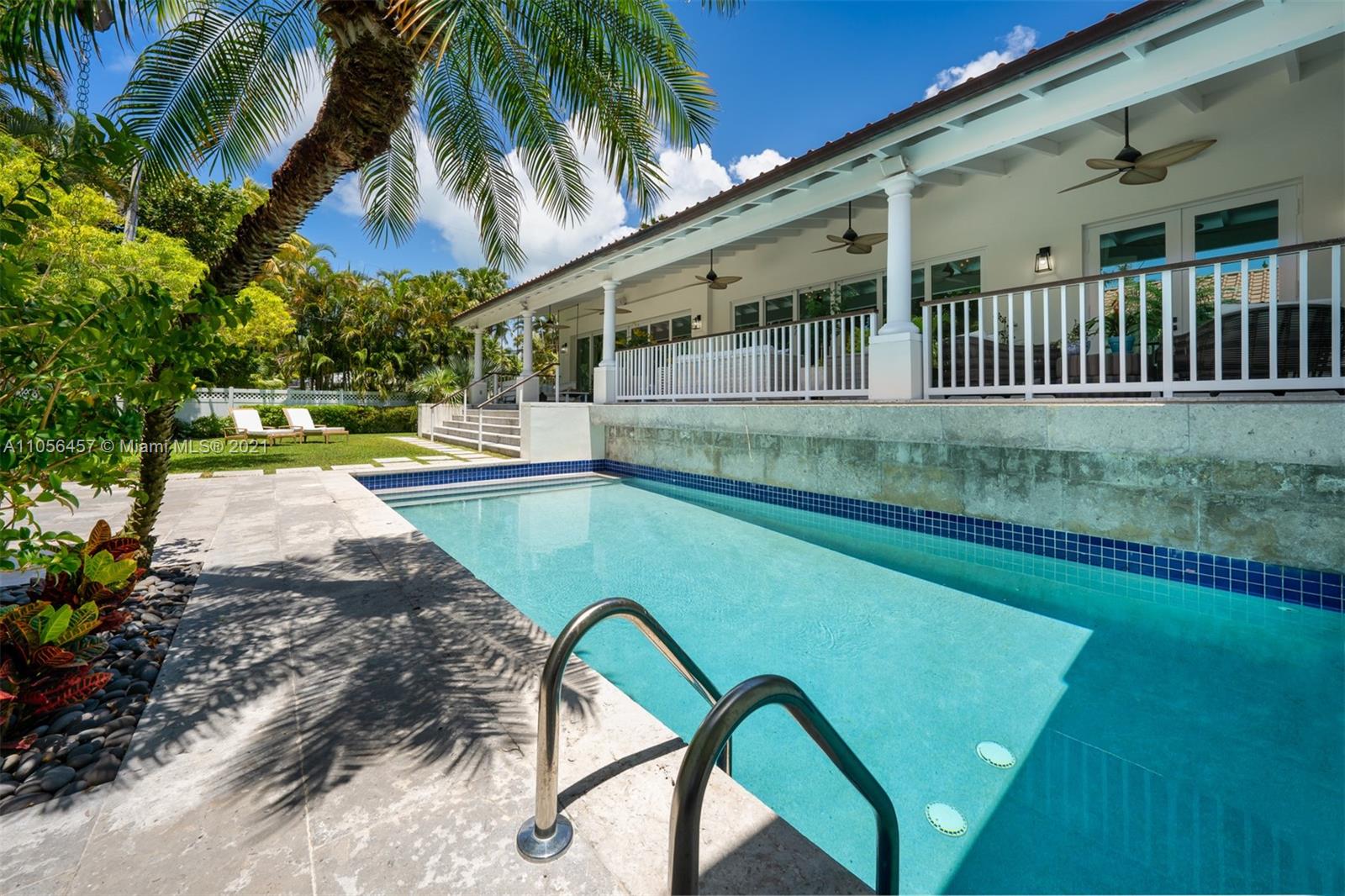 welcome to your Key Biscayne Beach House, located 3 blocks from the beach. Impeccable condition, designed by Village Architects. Located in the Holiday Colony area, the closest neighborhood for single homes to access the beach .One story home. Secluded and private, behind the double blue door an oasis of serenity will welcome you. Covered porch that gives more space to the living room area,direct access to pool and garden area. Oversized master suite with sliding doors opening to the terrace. Large family room , dining , kitchen with high ceilings . Surround system throughout the home. Built at 10 ft above flood ( see attachment for certificate of elevation). Impact glass doors / windows (expect one small window in laundry area). THE PERFECT HOME