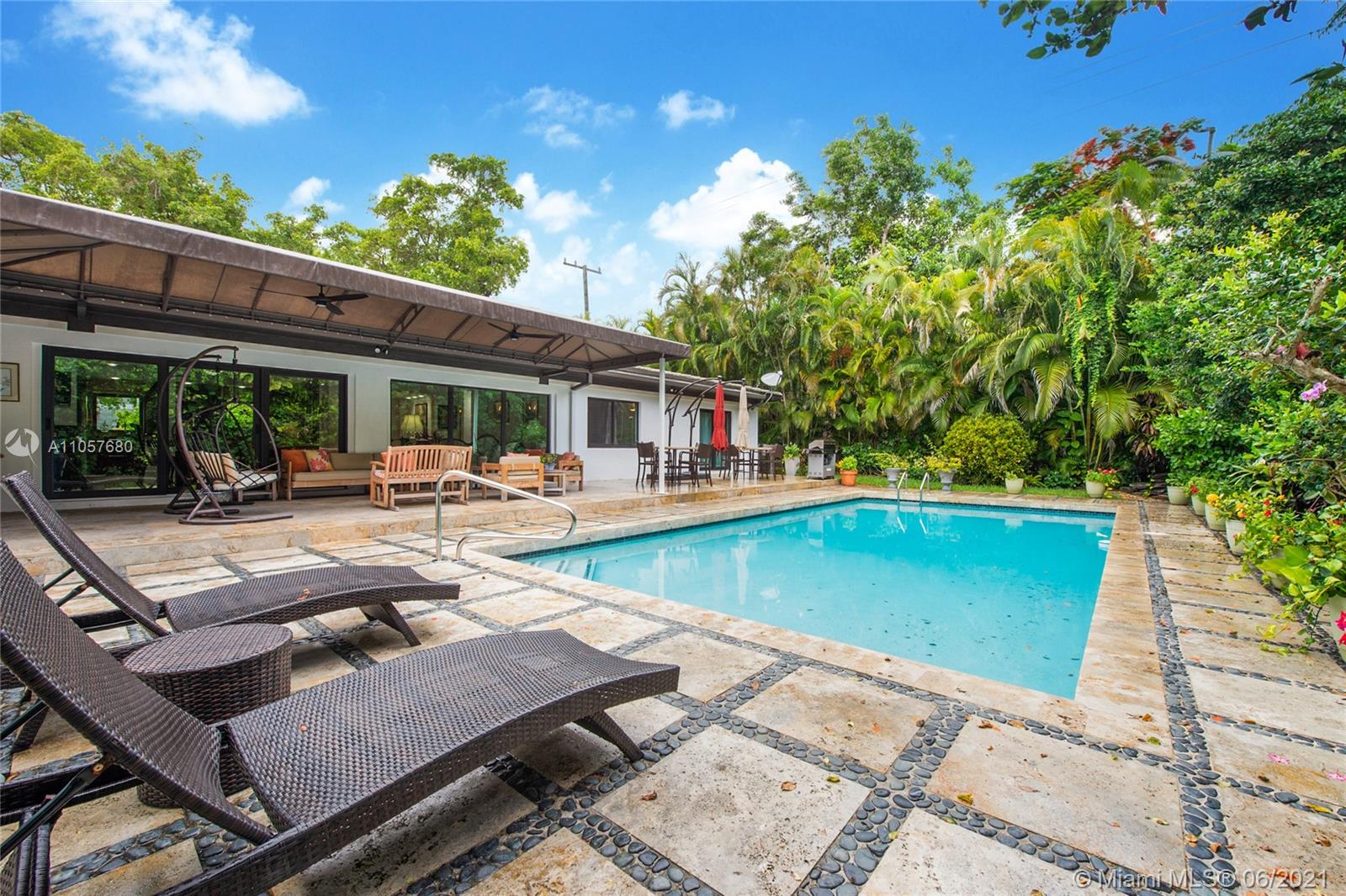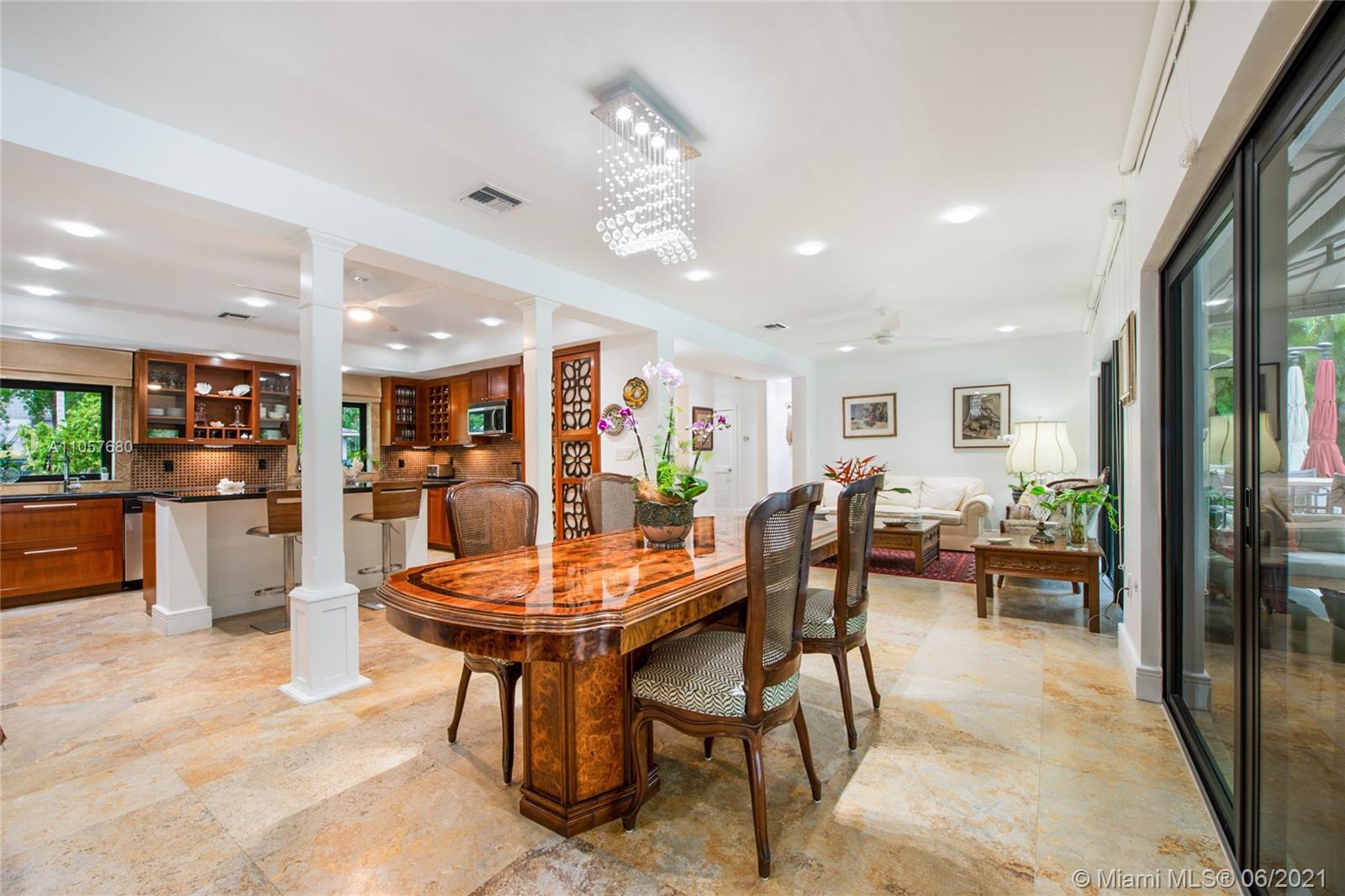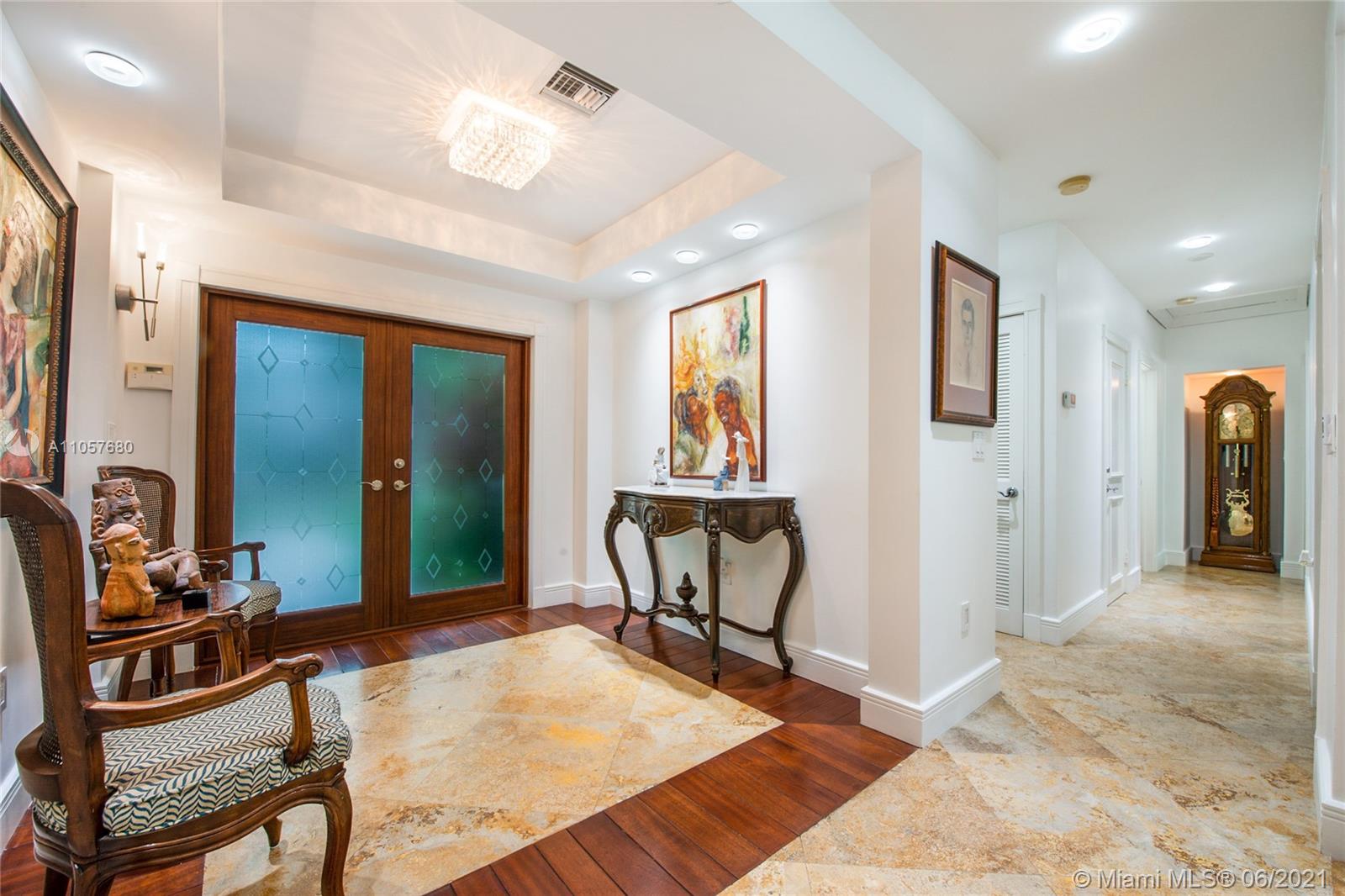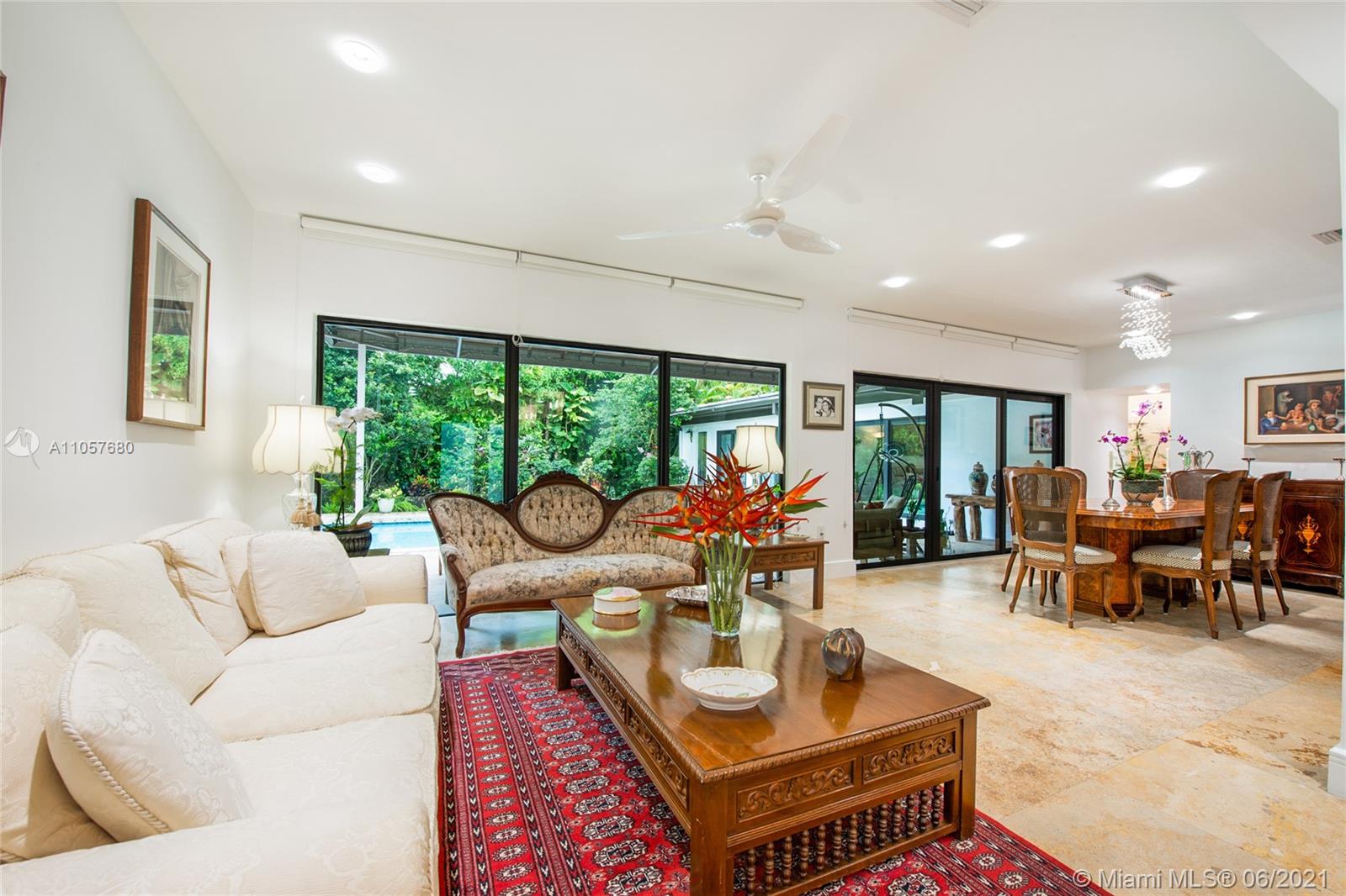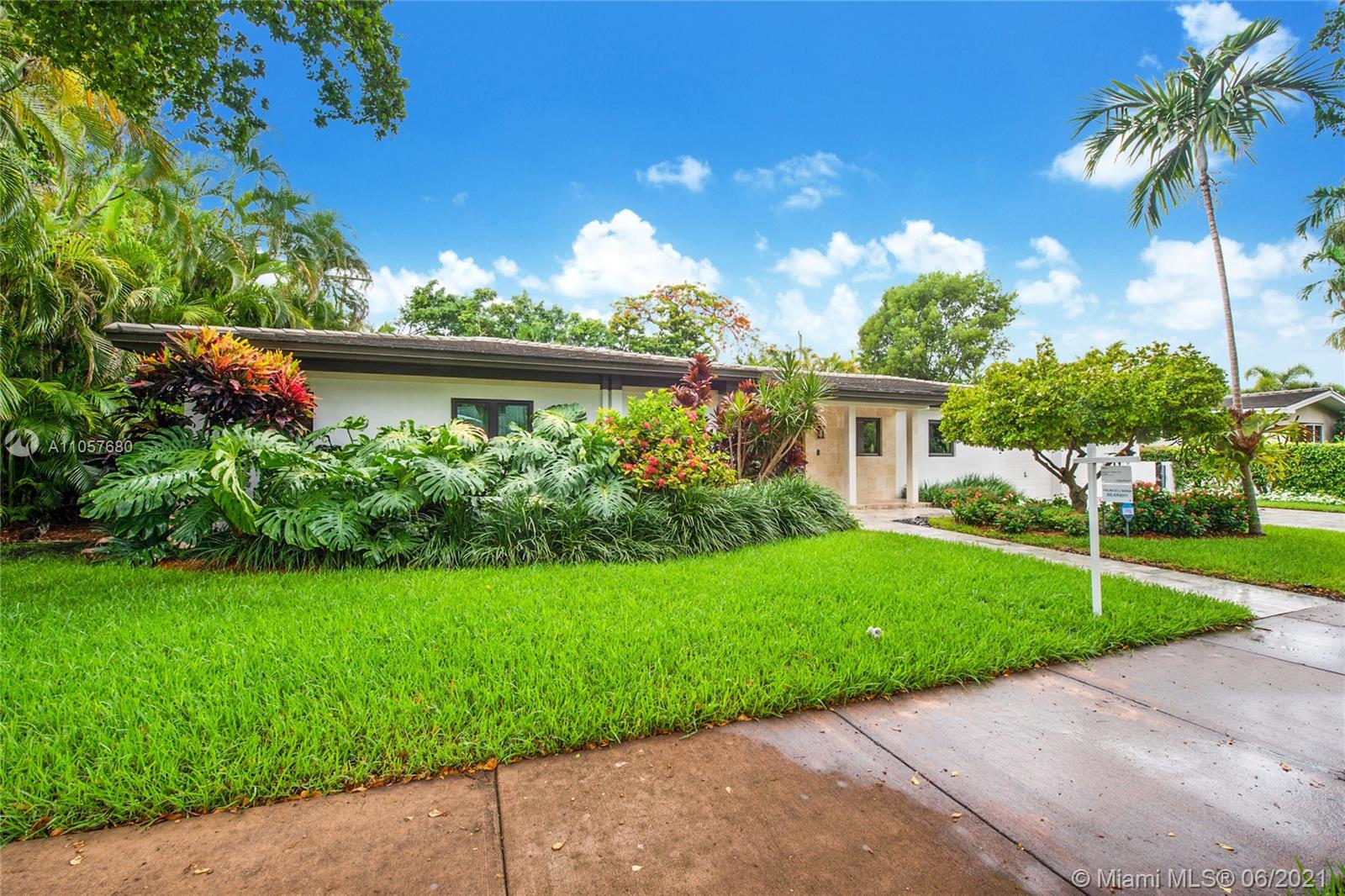 Sophisticated and well-appointed 1-level residence in a coveted South Gables location! Featuring recently installed roof and newer low-e impact-resistant windows and doors (100% impact all around). Graced with marble and wood floors, the residence revels in a fantastic floor plan where the west wing features a bar, indoor laundry + bath, expansive media room and the spacious main suite. The balance of the beds and baths are on the east wing of the home. It’s Florida living at its finest as the covered terrace and pool/patio are ripe for sunbathing and dining al fresco. Home awaits you here…