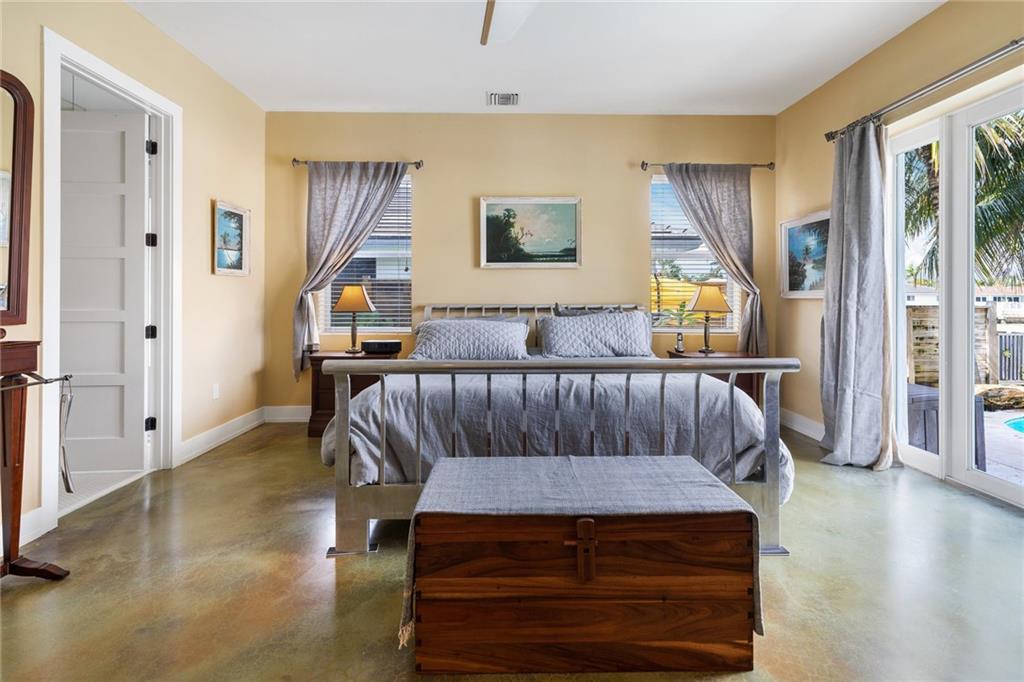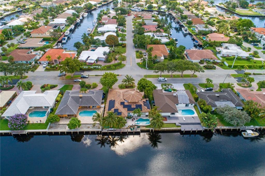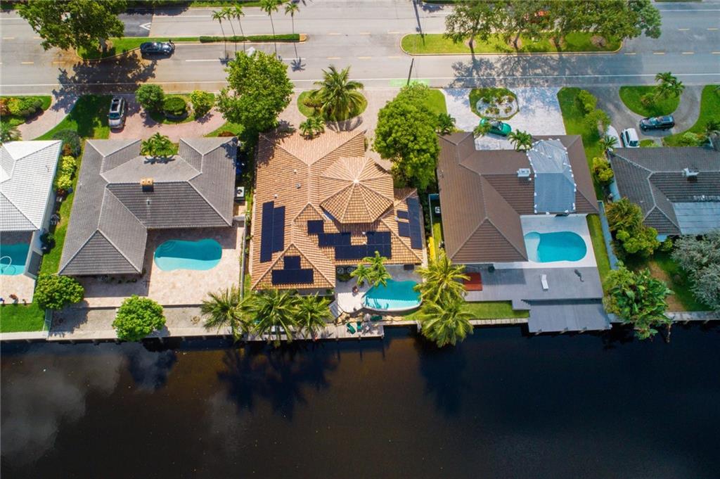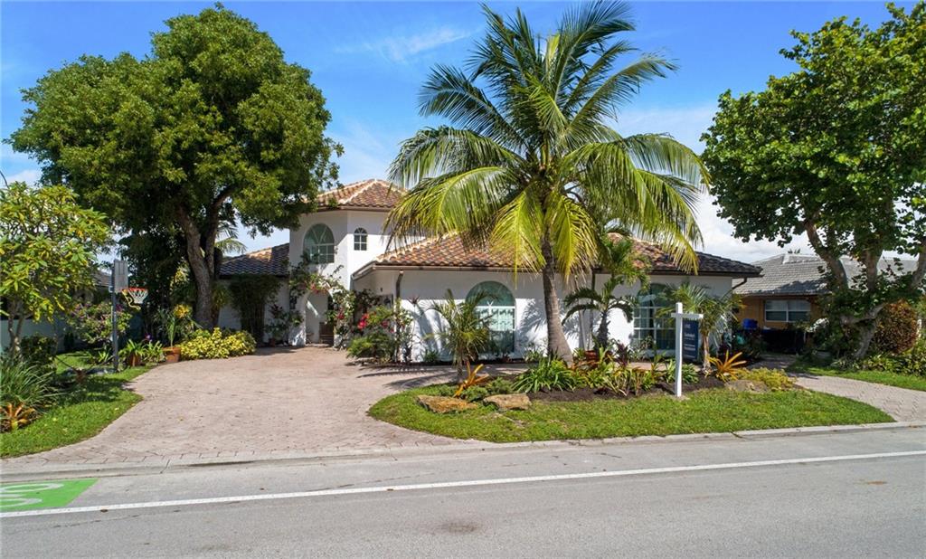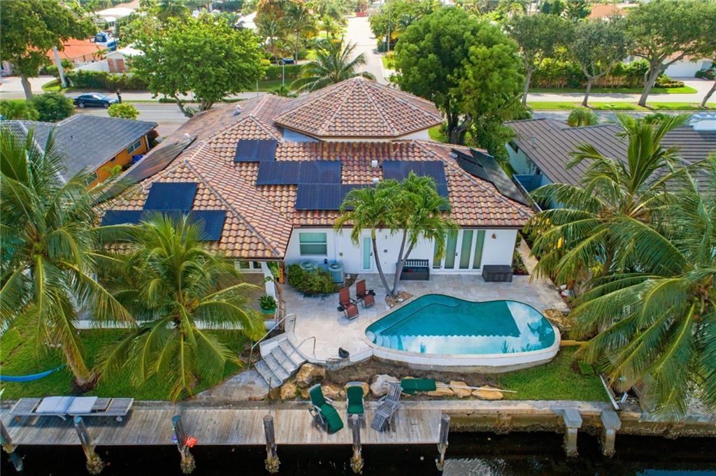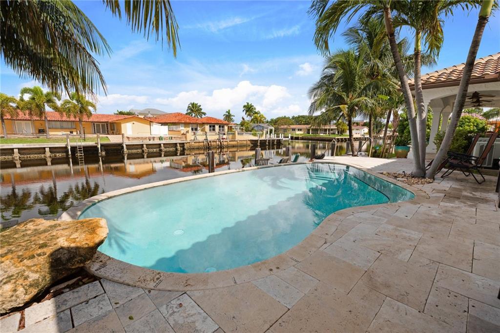 Rebuilt from foundation in 2004, 2882 sq ft of living space with 12ft high ceilings, 8ft impact windows and doors, unique polished concrete floors, gourmet kitchen with gas stove/oven, stainless steel appliances, custom cabinets, and granite countertops. 4 bedrooms in a split plan layout with 2 master suites, 3 full baths and ½ bath. Master suite bathroom has a jetted tub and steam shower. 2nd master bathroom has a jetted tub. On 80 feet of water with 50 feet of dockage with saltwater pool. Salt generator and pump are new as of 2021. Roof is 2 years old with full house solar energy. Beautiful backyard oasis patio/pool deck done in travertine. Tropical landscaping with room for a vegetable garden. Close to the beach, shopping and restaurants.