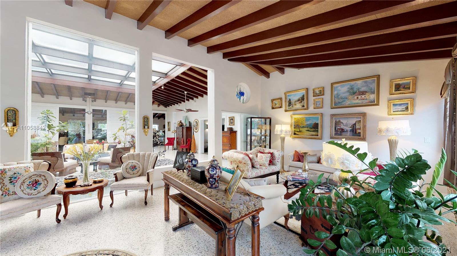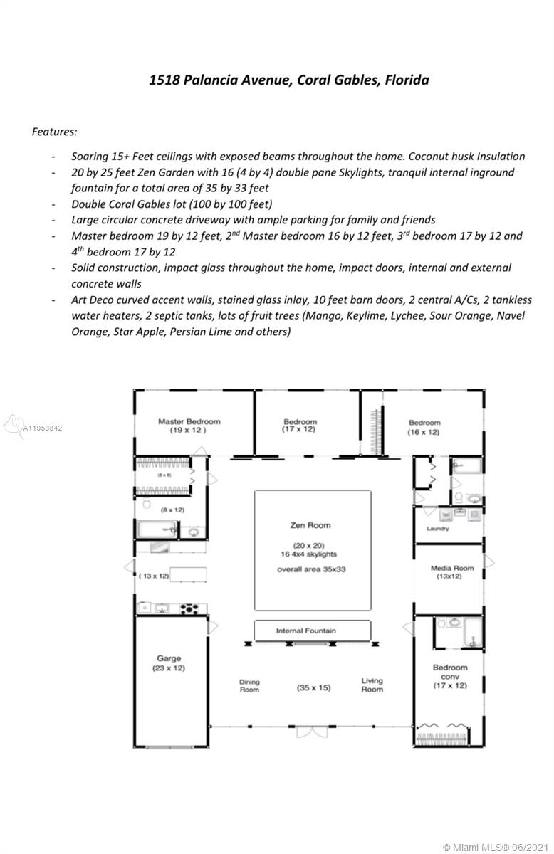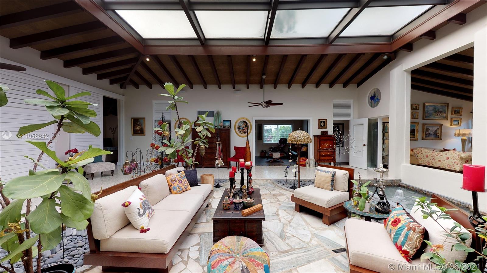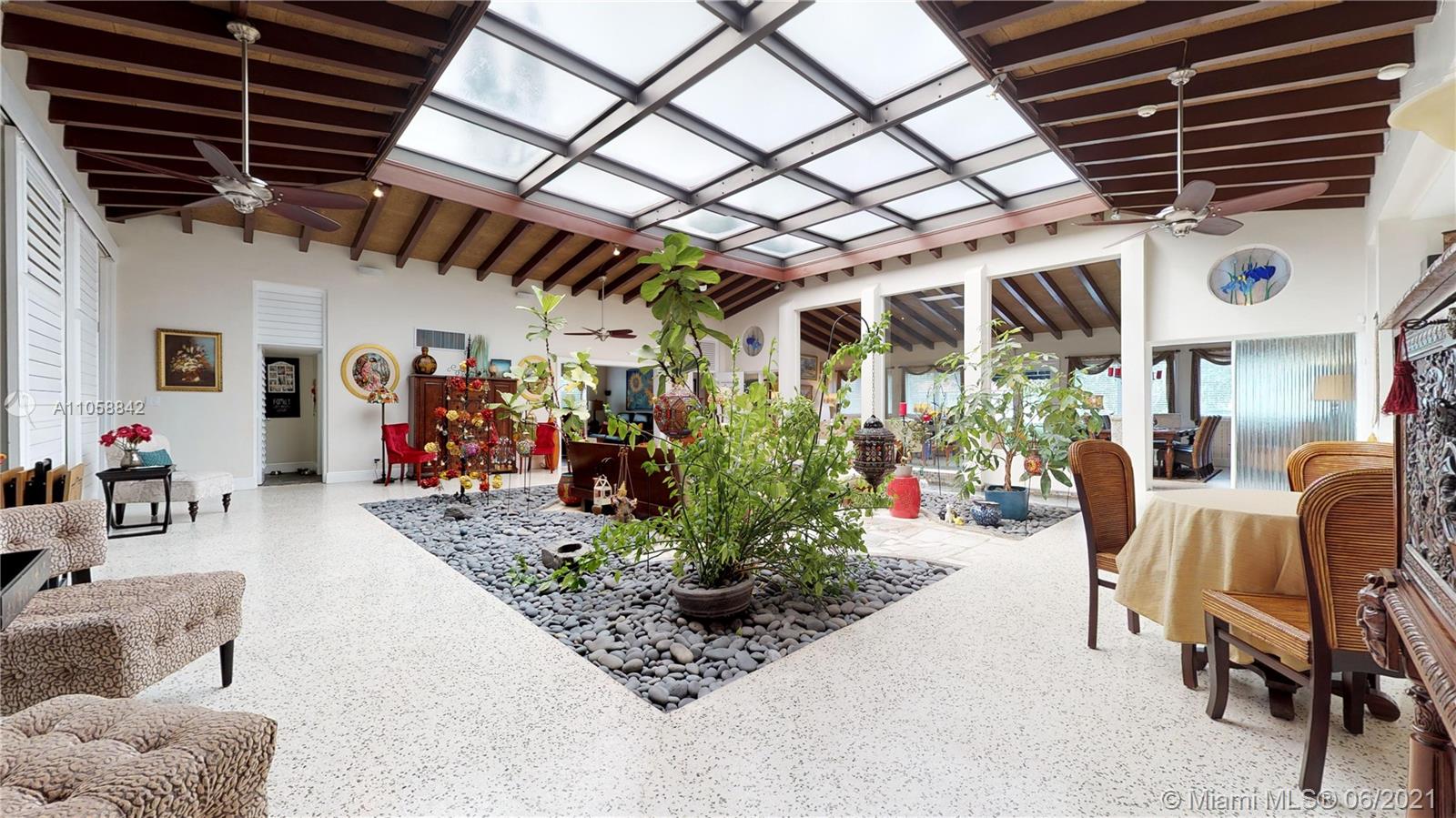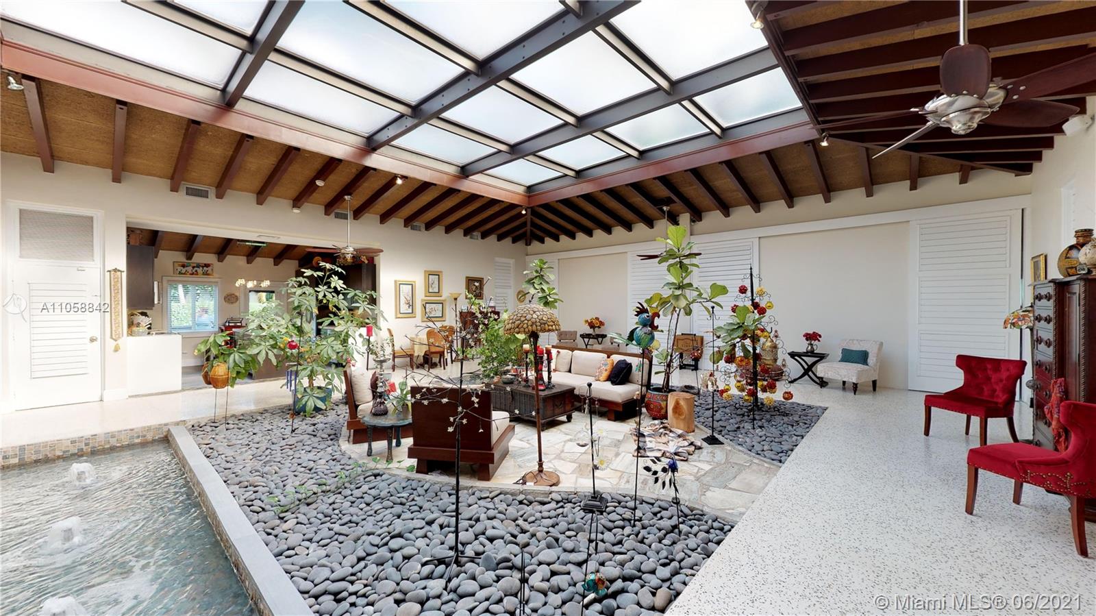 Unique Coral Gables home, Designed by Mid Century modern architect Tony Sherman, the house surrounds a 20 x 25 Zen room with an in-ground fountain. Overall under air as per appraiser is 3683 SQ FT, 3 bedrooms, 2 bath plus converted 4th bedroom and bath. 1 Car garage, large circular driveway, art deco curved glass and stain glass windows, 10 ft. barn doors, impact windows and doors, custom made wood kitchen cabinet, laundry room and exposed beam ceiling. House is on a Coral Gables double lot 100x100 in the Country Club Estate neighborhood. Walking distant to Fairchild Elementary