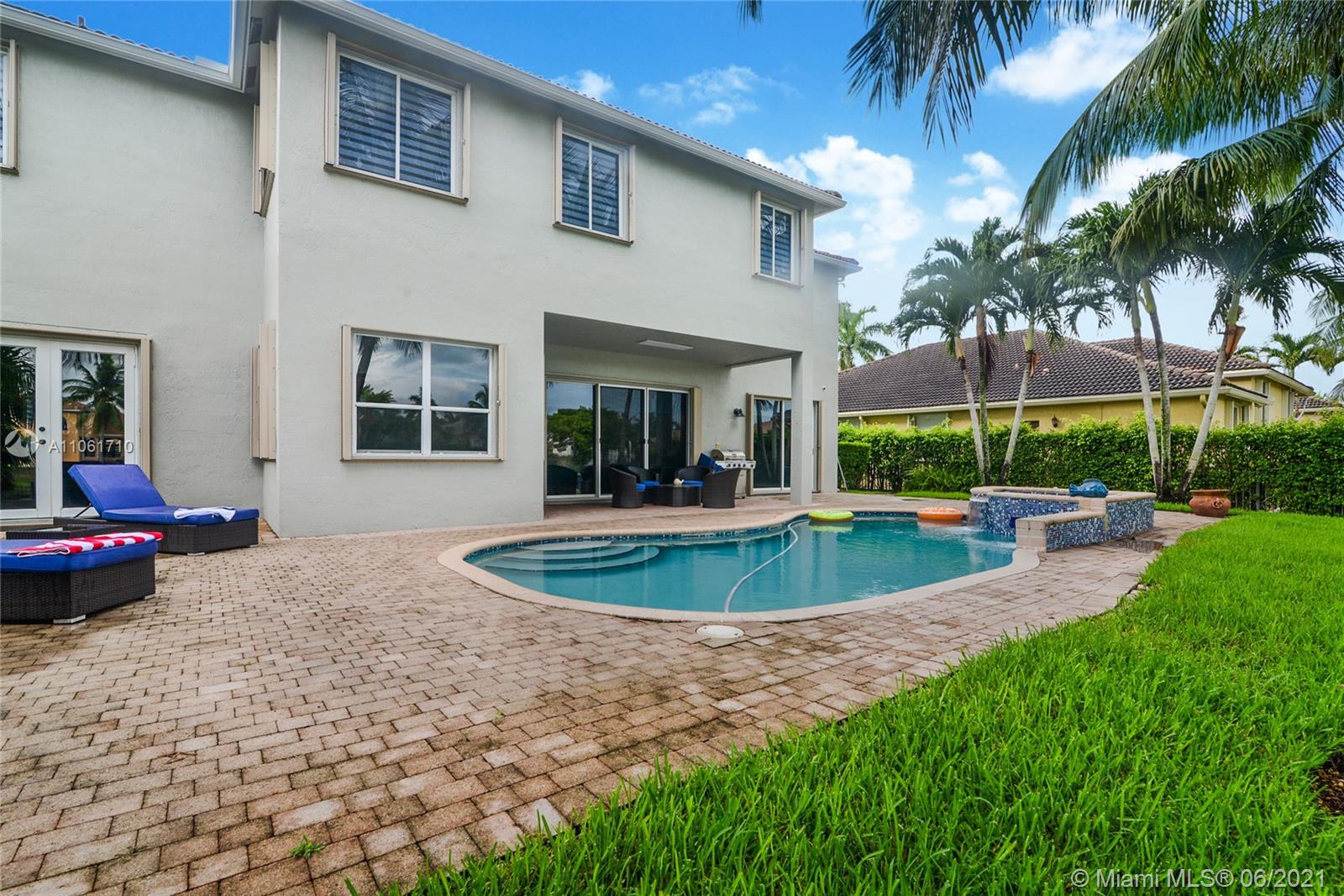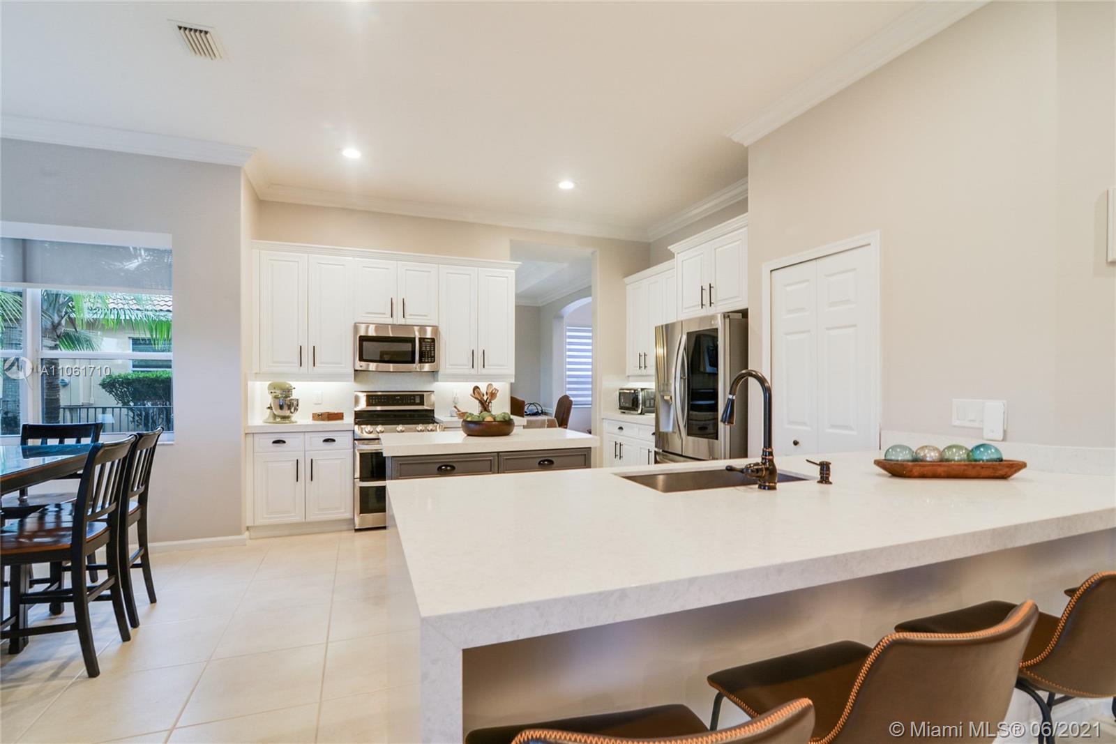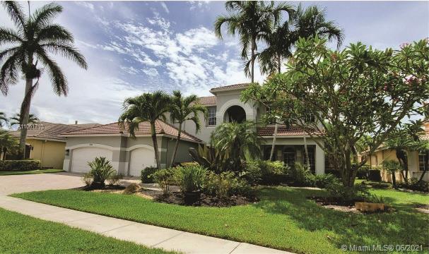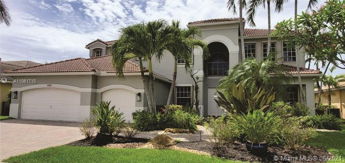 Beautiful Lakefront Home w/a breathtaking lake view. 5 Bedrooms, 4 Baths. Master bedroom has separate sitting room, 2 walk-in closets & oversized bathroom. California closets, Loft, Office/Den, TV/Theater Room, Fam. Room, Living Room & Dining Room, Foyer, 3 car garage, pool, jacuzzi, patio furnit, covered terrace & entry, sprinkler system, soaring volm ceilings, spiral staircase, porcelain tiles, new blinds, freshly painted. NEW kitchen w/ Quartz Waterfall countertops, stainless steel appliances, LG double oven range. New Maytag washer & dryer, smart outlets w/USB chargers, LED lights, 2019 high efficiency air conditioner, 2 units, smart thermostat, built out garage, hurricane shutters. 10,719 sqr ft of land. Great amenities & wonderful location, close to schools, shopping & restaurants.