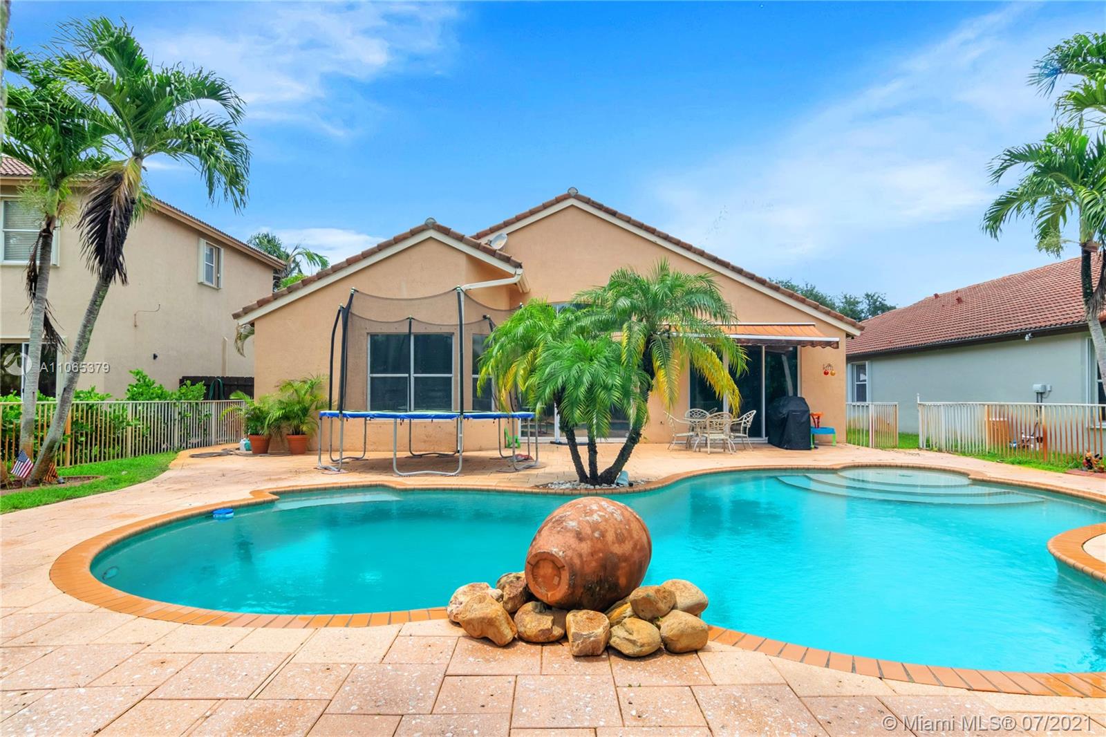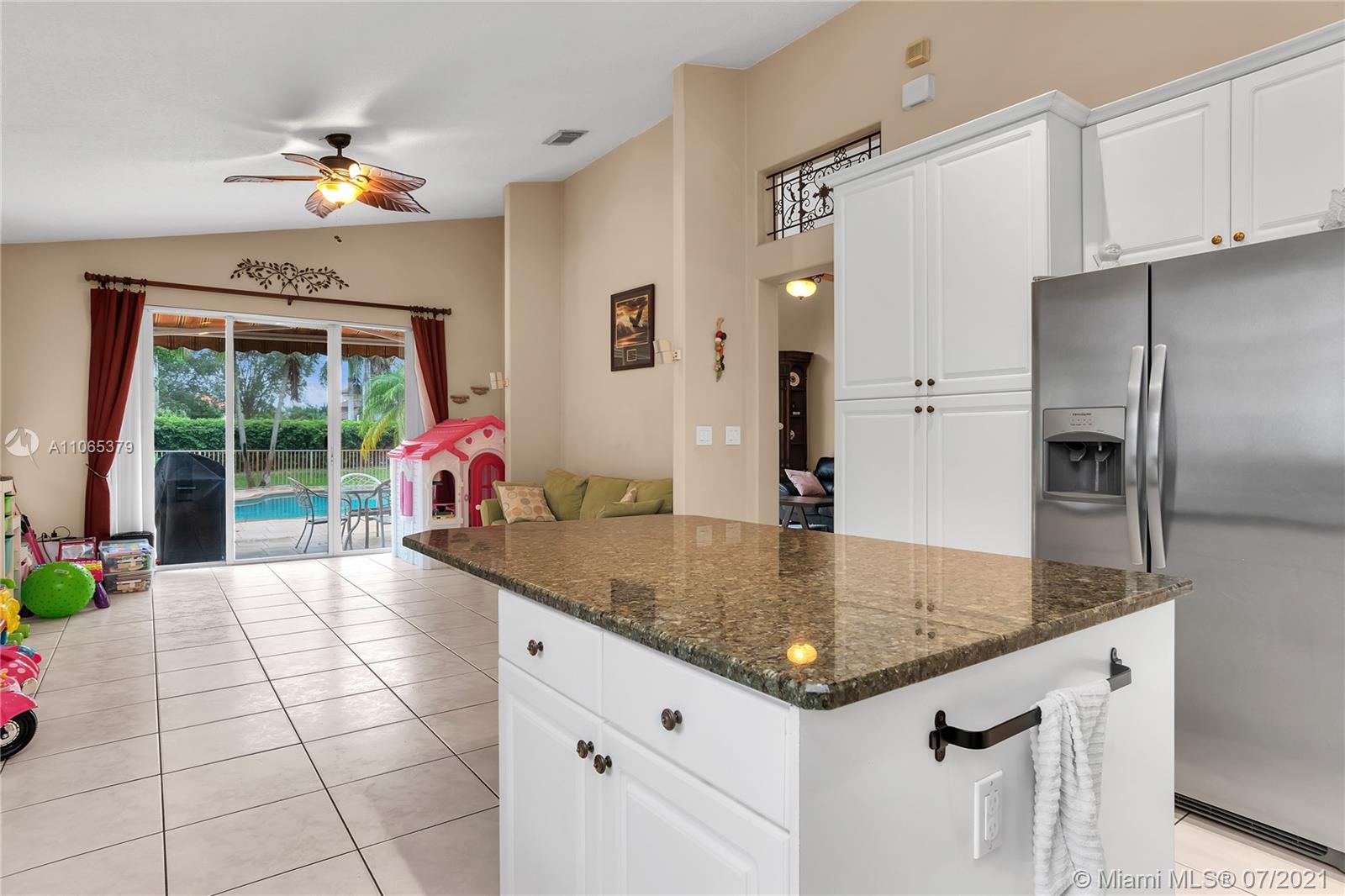 Superb 4 bedroom, 3 bathroom pool home in gated community of Sunset Lakes. Remodeled kitchen with granite countertops, wood cabinetry, pantry,large island with seating, and more. Wood laminate in all rms, tile in living areas, split bedroom design , surround sound in family rm, pool views from various rooms. Spacious rooms. Beautiful paver patio, retractable awning, great for entertaining, tropically landscaped fenced yard. Resort-level community amenities: basketball courts, tennis, gym, sauna, pool, volley ball, beach area, resort pool, picnic areas and much more. A+ rated Sunset Lakes Elementary.