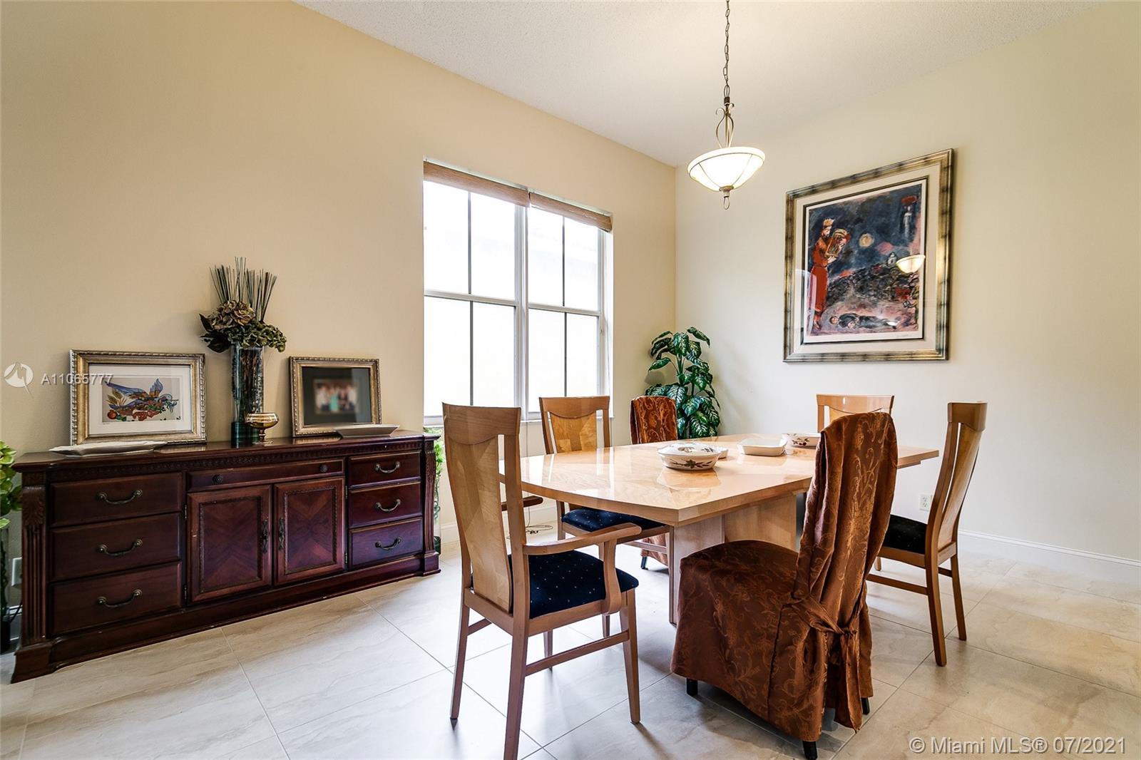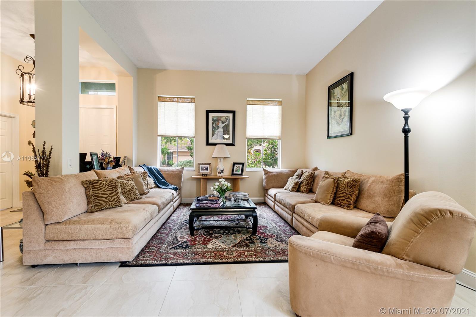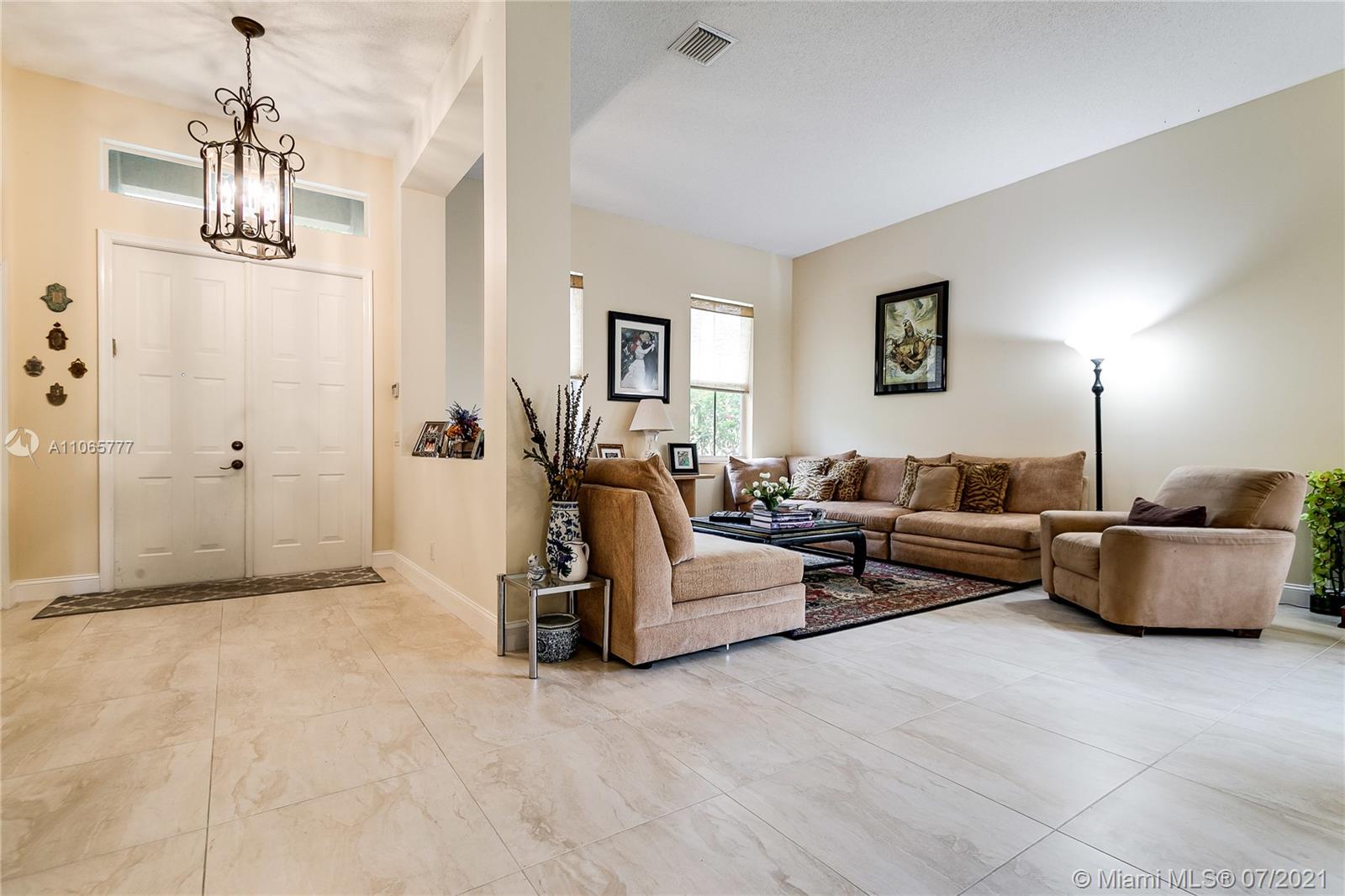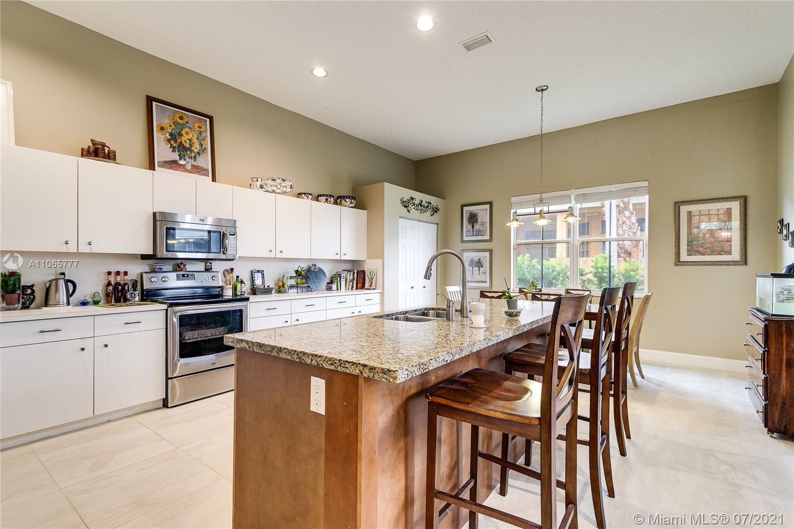 Elegant 4/2.5, desirable Dove model,23x23 tiles, neutral colors, in mint condition. 12 ft ceilings, large eat-in kitchen, island, lots of closet space. Master bathroom features exceptionally large walk in closets & marble baster bath. Newly updated II bathroom. Great community with resort like amenities. 3 pools, active club house with a restaurant, classes, a soccer field, mini golf and more. 2 manned gates.