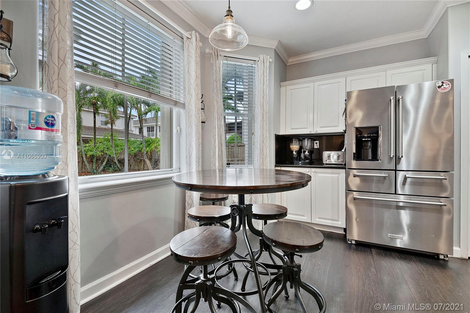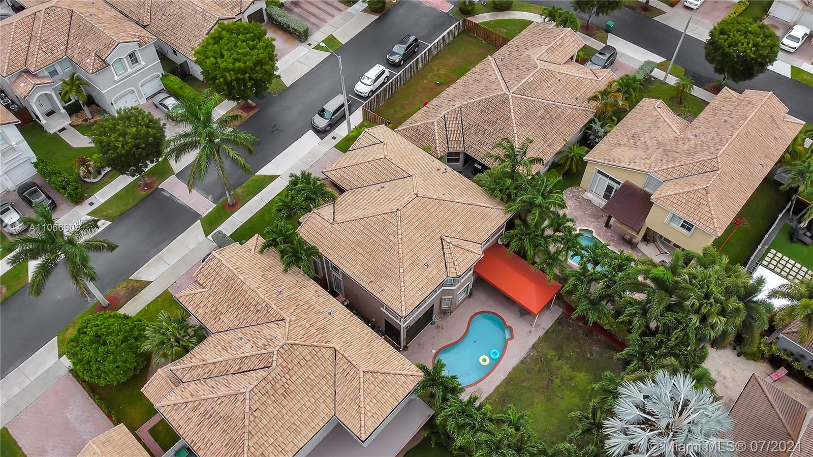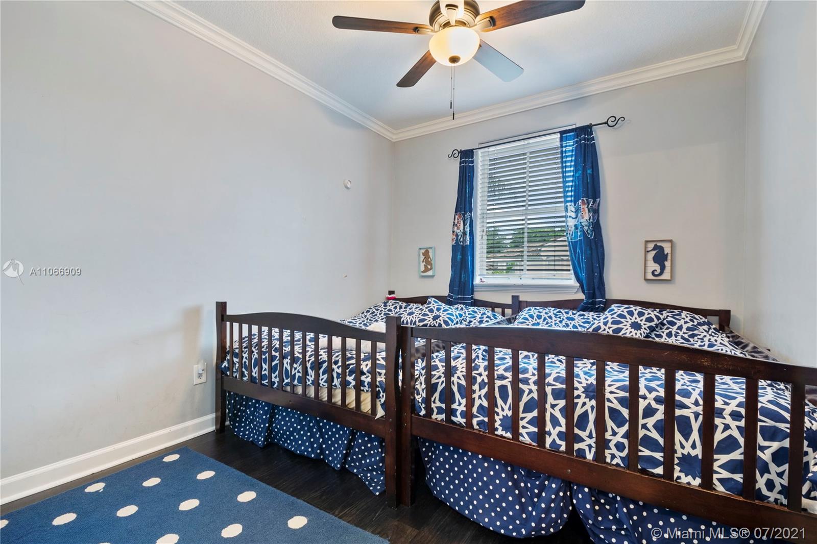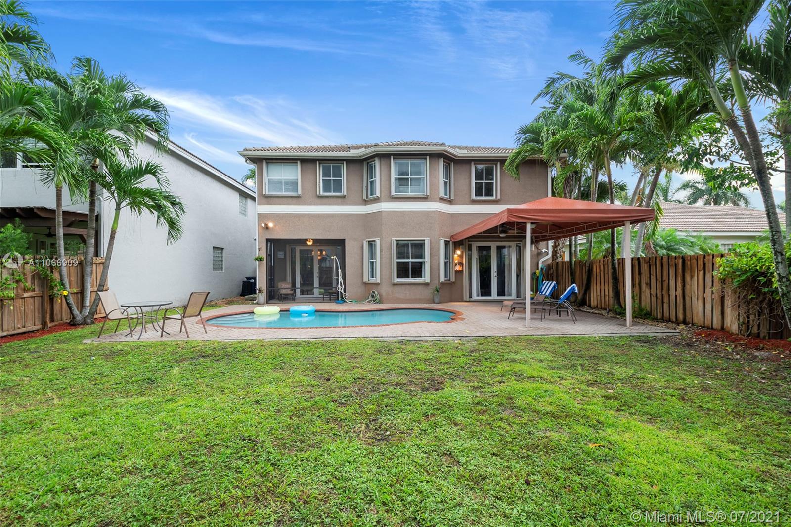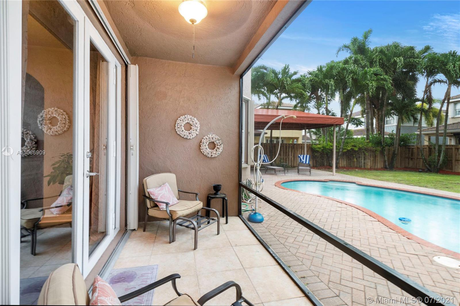 Costa Bonita, a Gated community in Doral. Mediterranean 2-story style home with private pool. Good location in move in condition. Expresso wood laminate floors throughout. Freshly painted interiors, crown moldings. New kitchen cabinets with granite counters and all stainless steel appliances. 2nd floor master suite with huge walk in closet and bathroom. Generous sized bedrooms, all upstairs. Accordion shutters for hurricane protection. Pool with surrounding brick pavers and awning, pool fence, rain gutters. Low monthly maintenance fee of $ 175.00 a month.