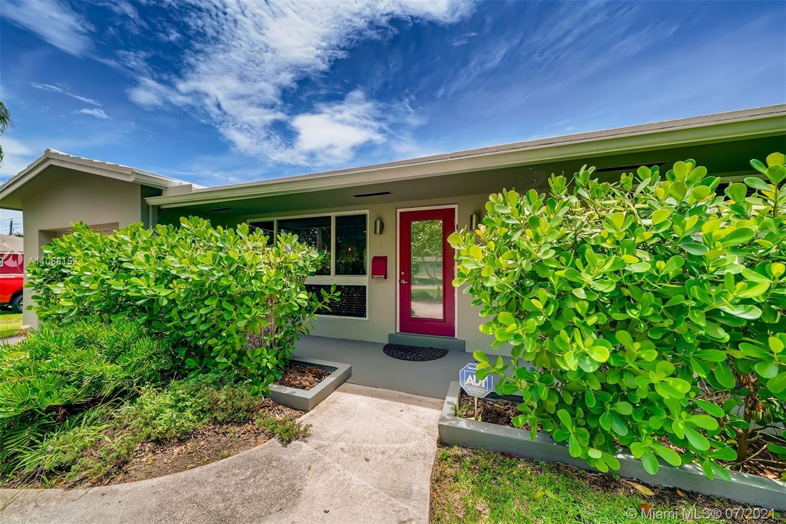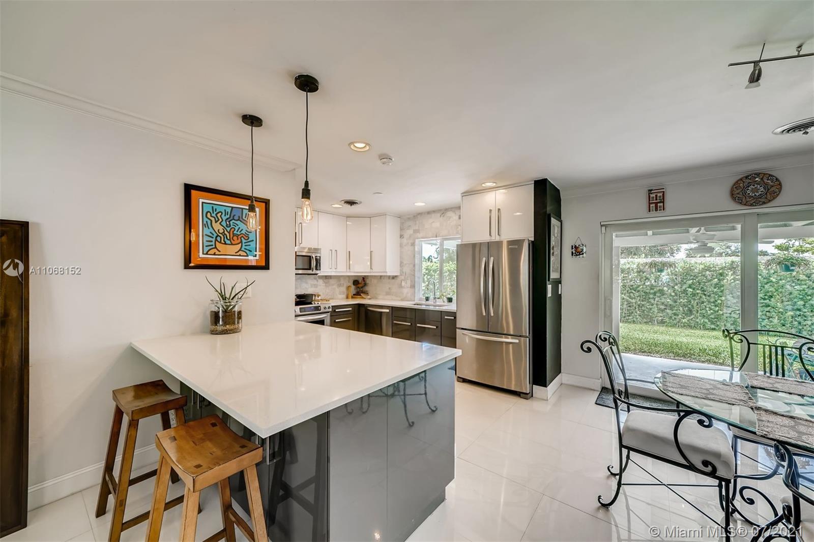 Entering past the beautiful tropical landscape, you will find yourself in a beautiful open-concept living area, with white tiling throughout and tons of natural light from the huge picture window! It flows onward seamlessly toward the dining area, which has access to the backyard via sliding doors. To the left is the remodeled U-shaped kitchen; it comes equipped with stainless steel appliances, marble backsplash, tons of prep space and a breakfast bar. The bedrooms are located just off the dining room, with the primary featuring a walk-in closet and a beautiful ensuite bathroom with a subway tiled standing shower and white fixtures. The secondary bedroom is spacious with continued white tiling and with ample closet space and a great view of the tropical landscape.