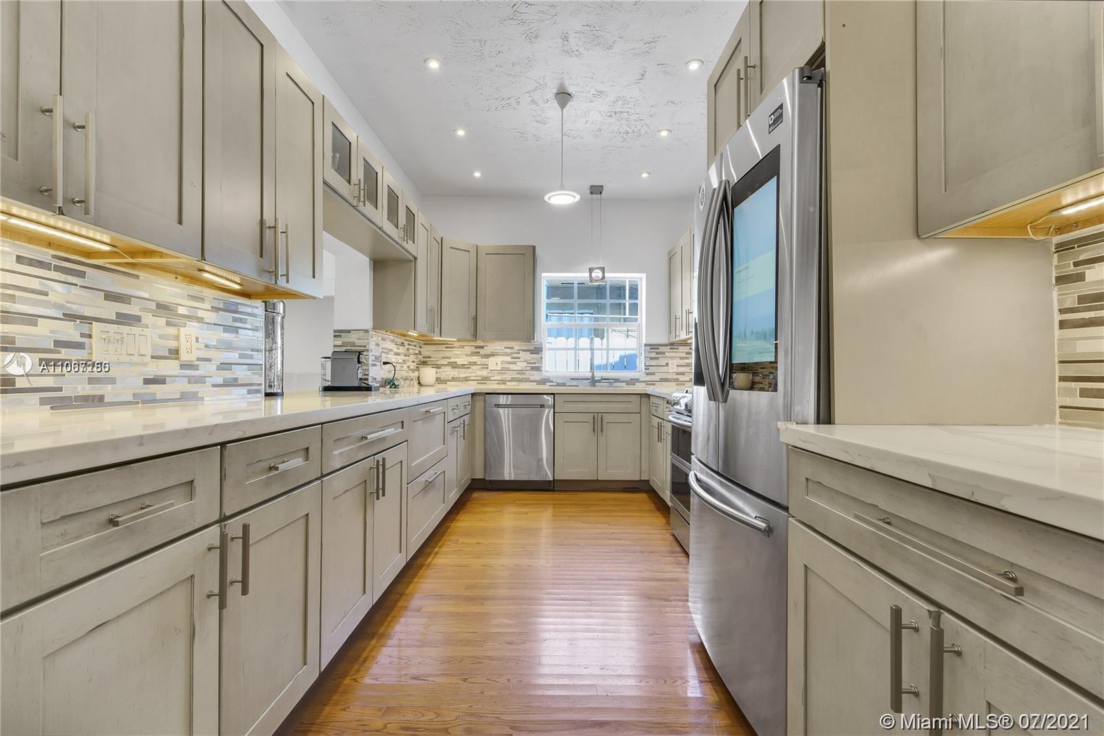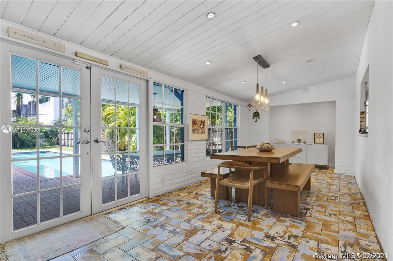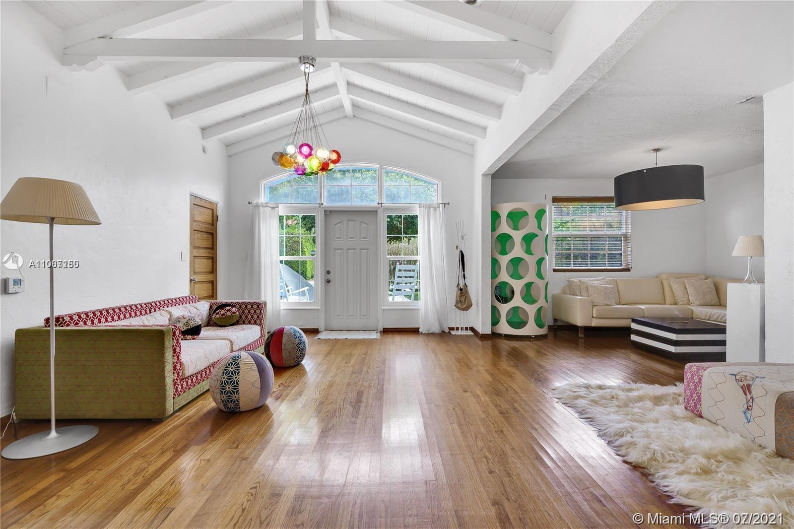 Beautiful warm and cozy Carlos Schoeppl's masterpiece in the heart of Miami Beach on quiet Royal Palm ave. This 4 bedroom 3 bathroom classic home features original hardwood floors, fireplace, cathedral and volume ceilings throughout. Stunning kitchen design includes top of the line appliances, designer cabinets, and beautiful white marble countertops which effortlessly flow into the dining room overlooking pool and garden.The bathrooms have been updated tastefully with modern day tiles, countertops, and a freestanding bathtub.The expansive garden area and a pool are perfect for relaxation as well as entertainment. Home was just repainted an off white color.