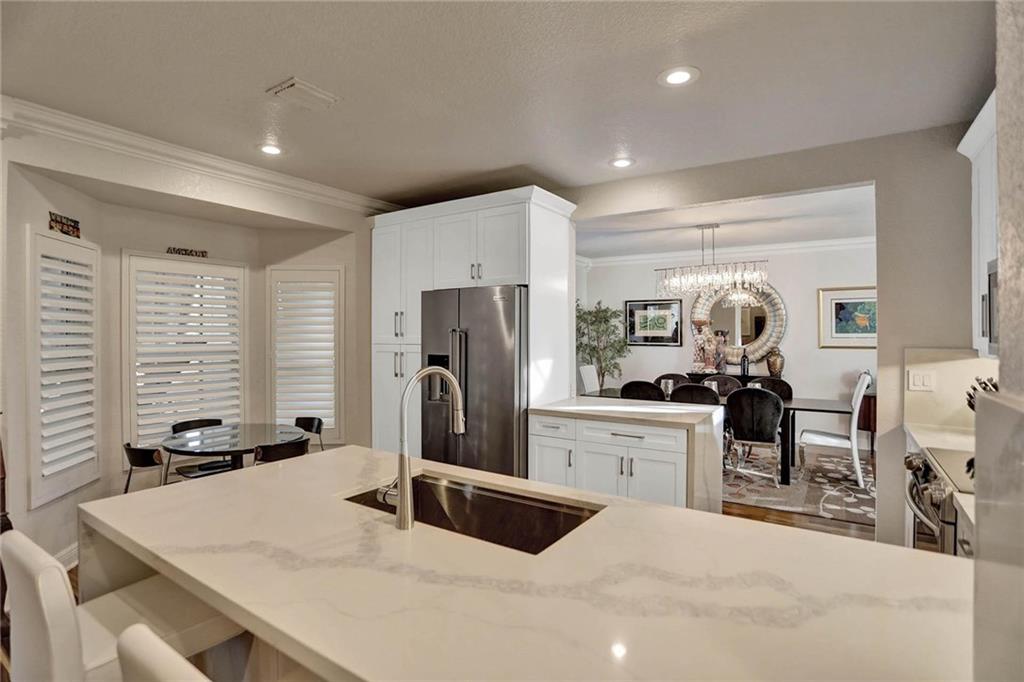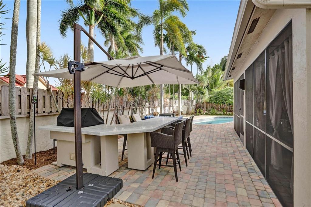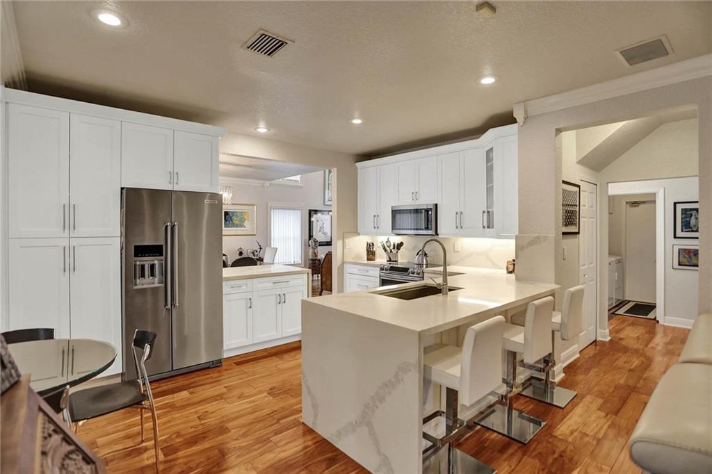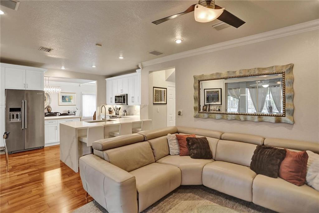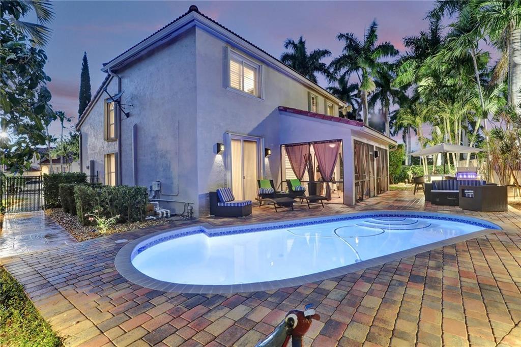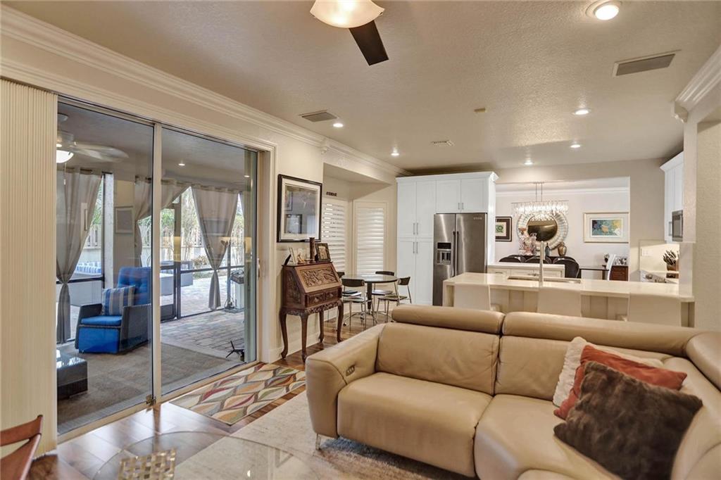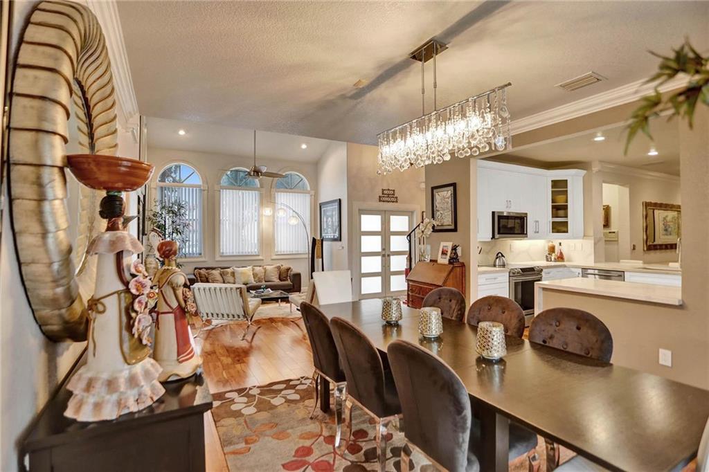 This expertly designed and remodeled home nestled on the premier corner lot in the coveted The Cove in Poinciana Parc, features 4 beds 3 baths and 2,124 of eclectic living space. Step inside the impact french doors on to the brilliant wood floors that are found throughout, a wrought iron staircase, and volume ceilings in the foyer and living room next to the formal dining room. The gourmet kitchen features white shaker cabinets with crown molding, stainless steel appliances, and majestic waterfall quartz countertops, a breakfast nook with impact bay windows overlooking the pool. Entertain in style or just relax in the covered and screened-in patio overlooking the heated pool with brick-pavers, custom bar and grill which is perfect for entertaining guests or your private enjoyment alike.