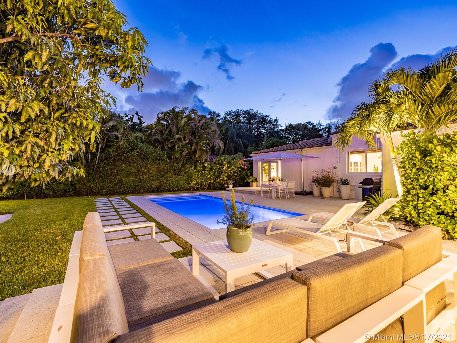 Welcome to Shores Palm Retreat! Great updates meet timeless character and charm in this sprawling mid-mod home and spectacular pool retreat. Beautiful, vaulted-beamed great room with fireplace and bonus flex-den, perfect as office or music room. Updated designer kitchen with bonus eating room flows to elegant formal dining for lively dinners with friends and family. Binge on your favorite movies in the media room with double French doors to the resort-like deck and gardens with newer dazzling elongated heated pool—great to entertain or just chill. Unwind in the dreamy main suite retreat with spa-style bath and custom walk-in closets. All this with spacious guestrooms, impact windows-doors, new roof, and illuminated lush landscaping on a desirable double lot just a block to Downtown Shores!
