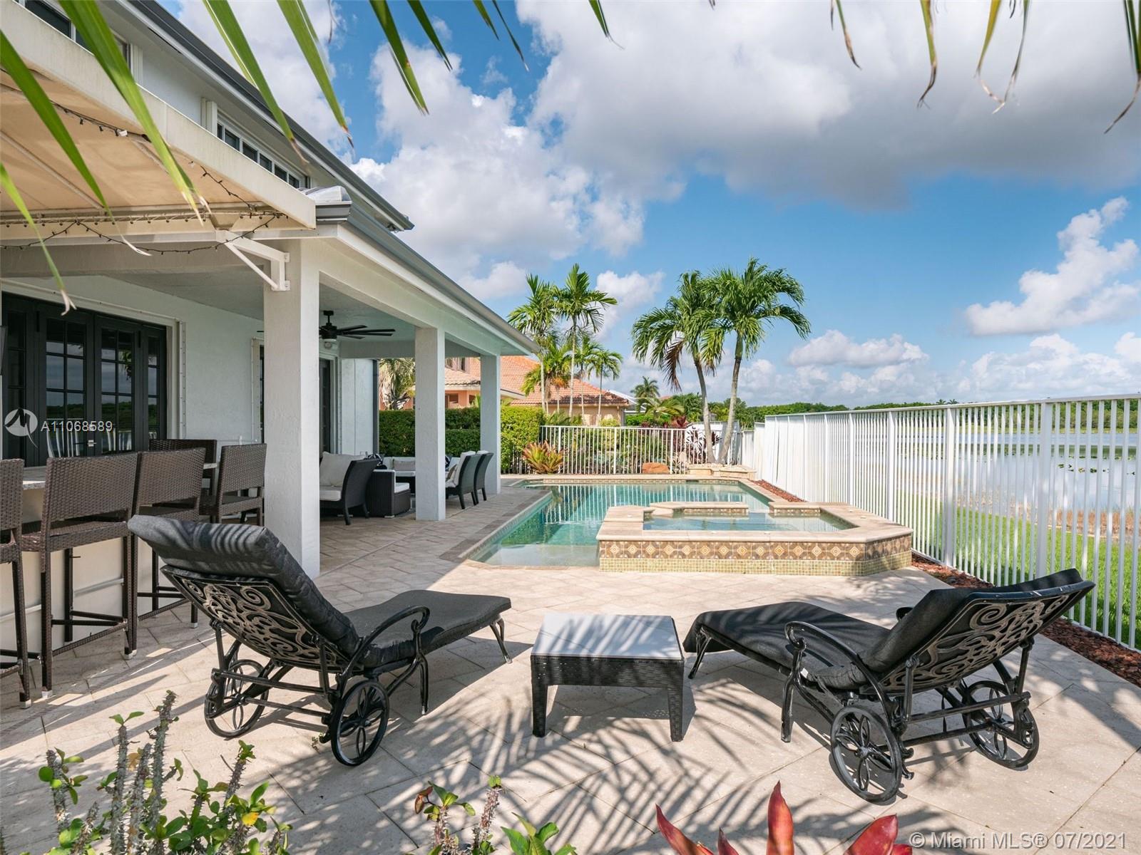 Enjoy one of the most spectacular wide-lake waterfront views from this completely updated pool home. Situated on one of the largest lakes in Weston, this 3,700sf 5 bed/3 bath professionally decorated home has it all. No detail has been overlooked. NEW ROOF!! Marble & wood flooring throughout. 1 bedroom & bath downstairs. Open kitchen design including subzero refrigerator & double ovens. Oversized master suite with sitting area, 2 large walk-in closets and coffee bar. Modern master bath w/ separate vanities, bath tub & walk-in shower w/ multiple shower heads/body sprays. Custom built-ins including bar and wine storage, pool/spa automation, freshly painted, modern window treatments, accordian shutters, & A+ schools just begin to tell the story of this sophisticated Highland Meadows home.