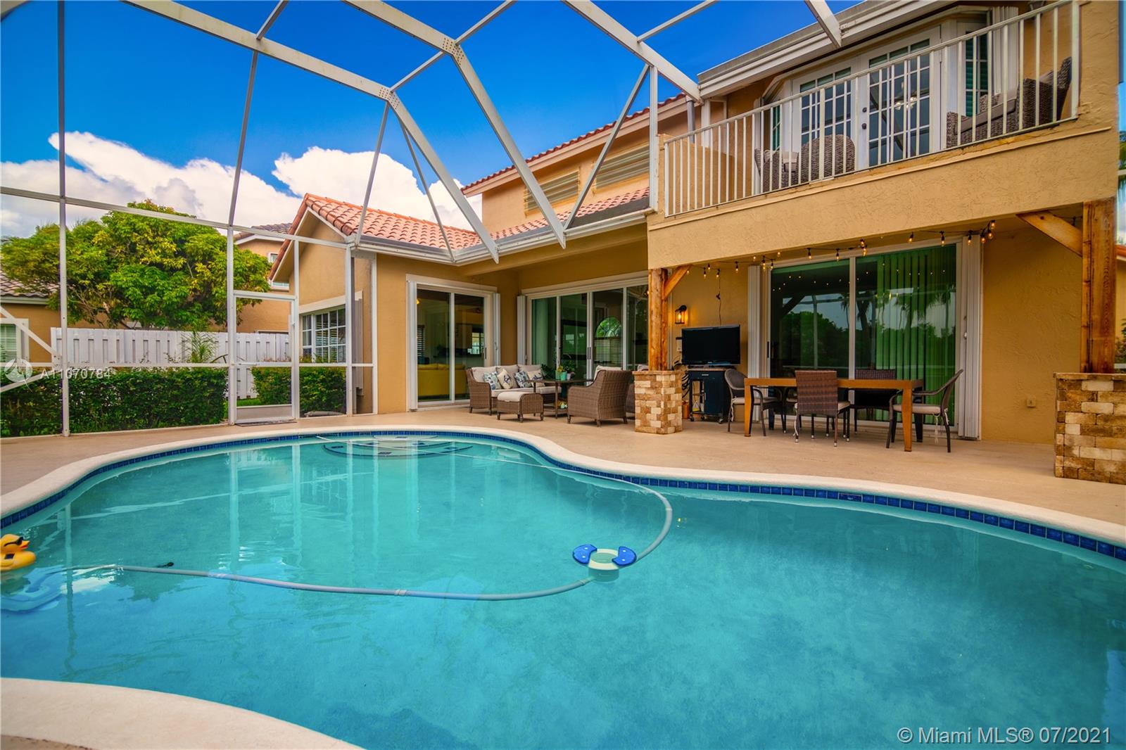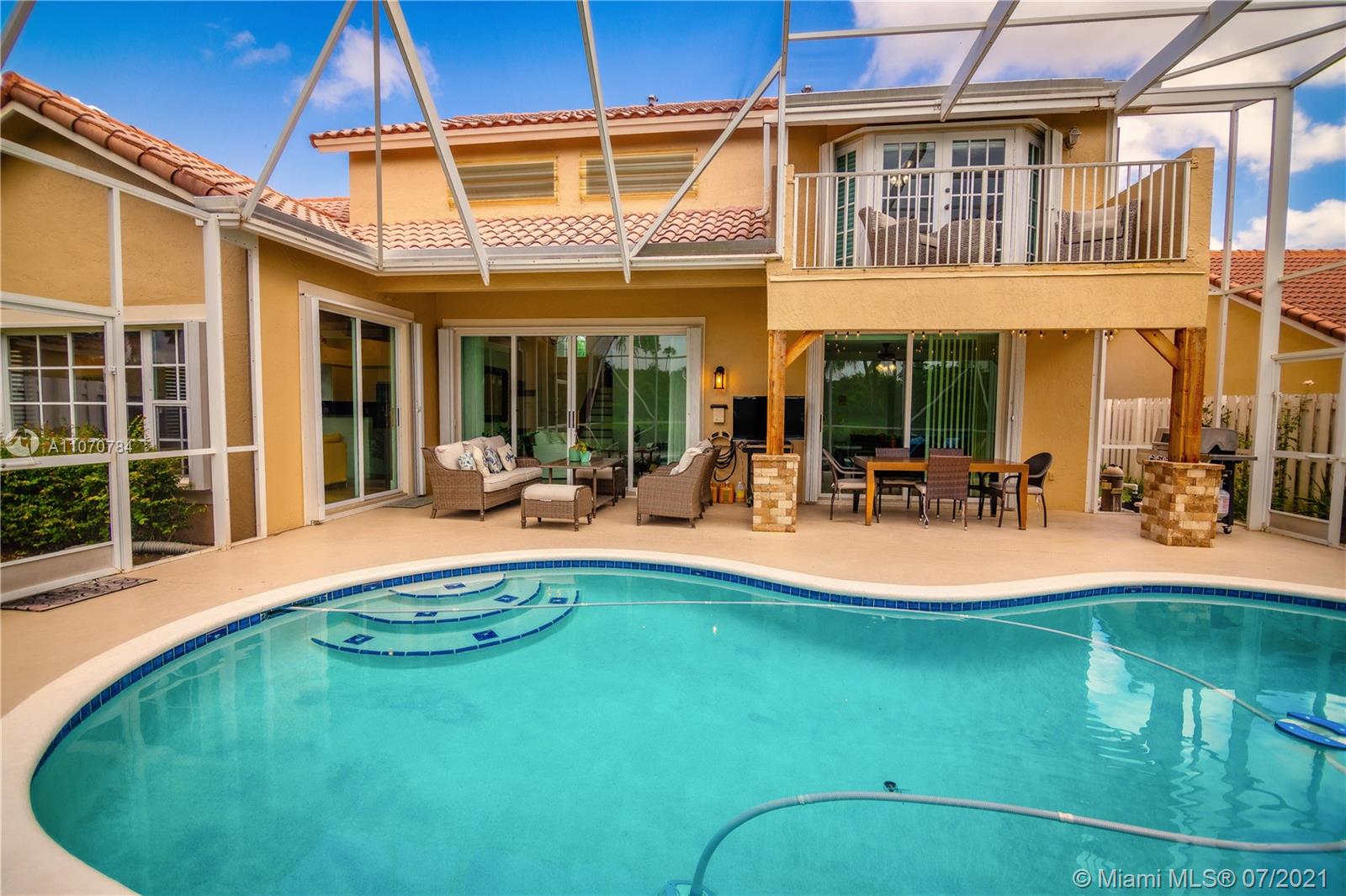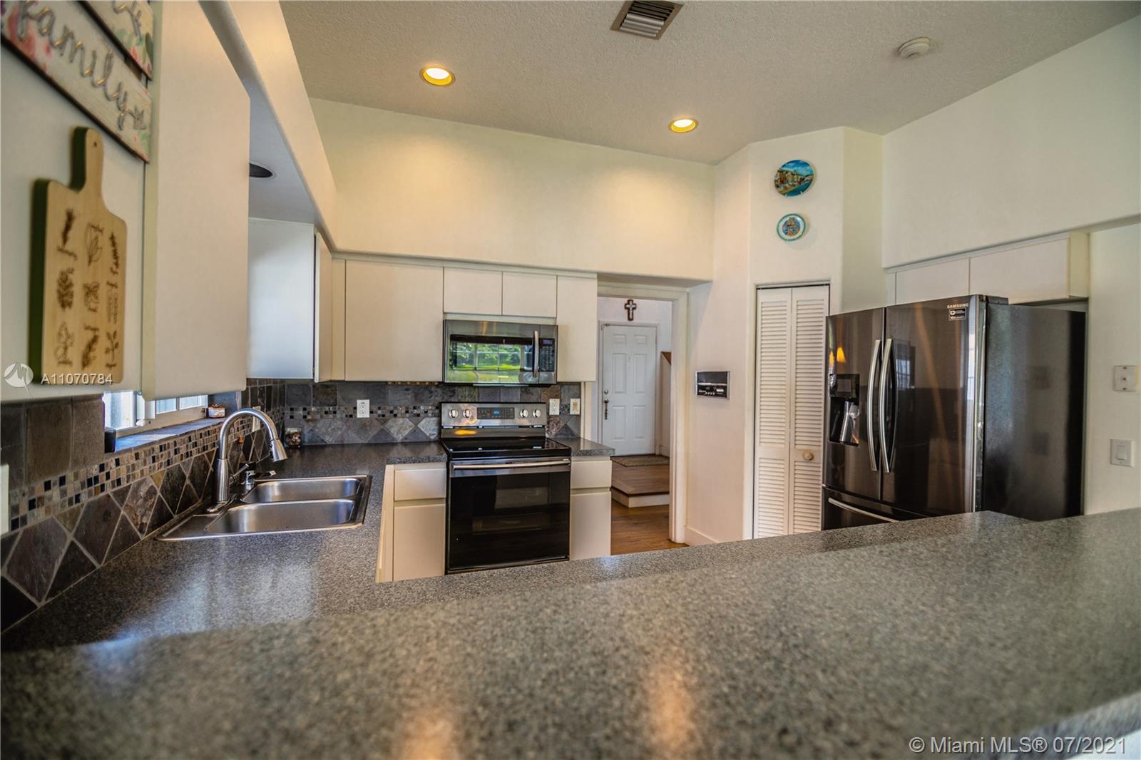 NO MORE SHOWINGS. IMMACULATE TWO STORY HOME IN DESIRED LAGUNA SPRINGS I - TWO BEDROOMS ON FIRST FLOOR - MASTER SUITE UPSTAIRS - MASTER BR HAS FRENCH DOORS LEADING TO BALCONY THAT WAS REDONE AT THE END OF 2020, OVERLOOKING DOME SCREENED POOL AND SERENE WATERVIEW - MASTER BATH WITH HEATED JACUZZI TUB - SWISS LAMINATED FLOORS THROUGHOUT THE HOUSE, WATER AND FLOOD RESISTANT UP TO 72 HOURS- CUSTOM SILHOUETTE BLINDS - REMODELED BATHROOMS - KITCHEN WITH NEW SAMSUMG APPLIANCES (2019) - ELECTRIC FIREPLACE IN LIVING ROOM AREA. CEDAR WOOD AND STONE COLUMNS IN POOL AREA. A/C 9 YEARS OLD W/UV FILTER - SOLAR WATER HEATER - ROOF AFTER WILMA - ACCCORDION SHUTTERS - NEW HURRICANE PROTECTION GARAGE DOOR ( SEPT.2020). NEW PAVERS INSTALLED ON NOV. 2020 IN DRIVEWAY. EXTERIOR JUST PAINTED. CUL-DE-SAC LOT.