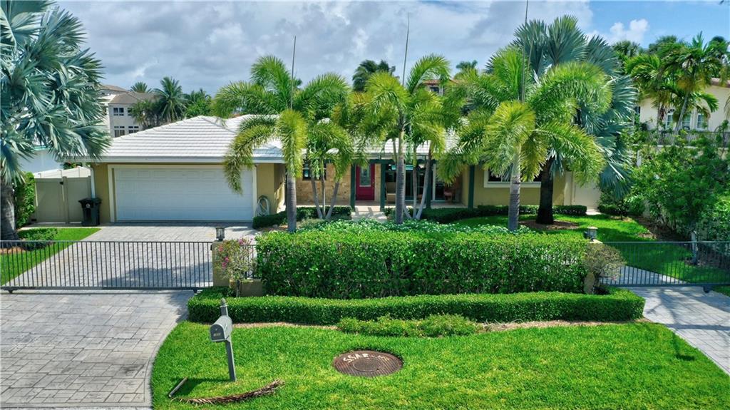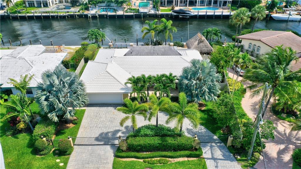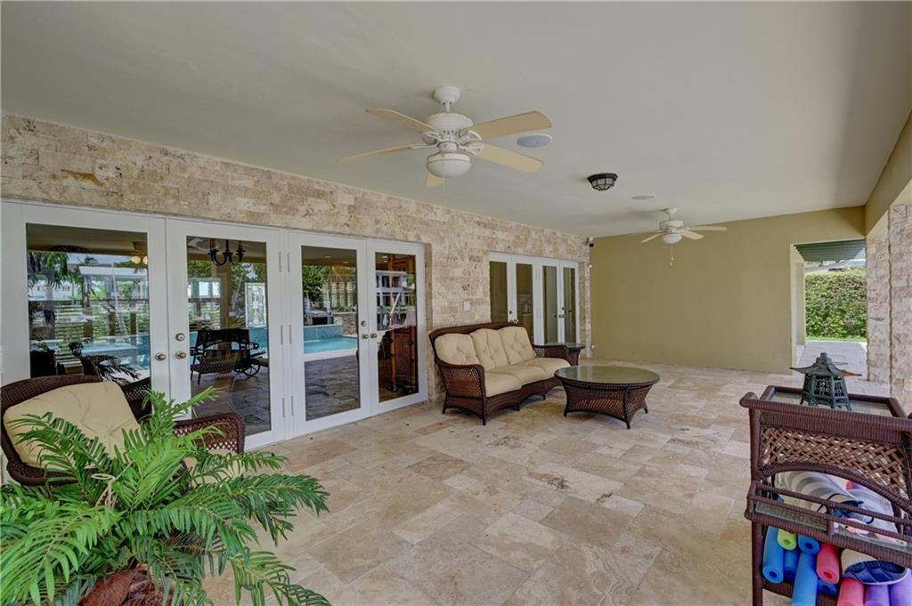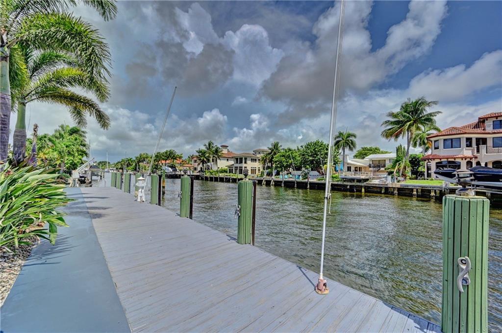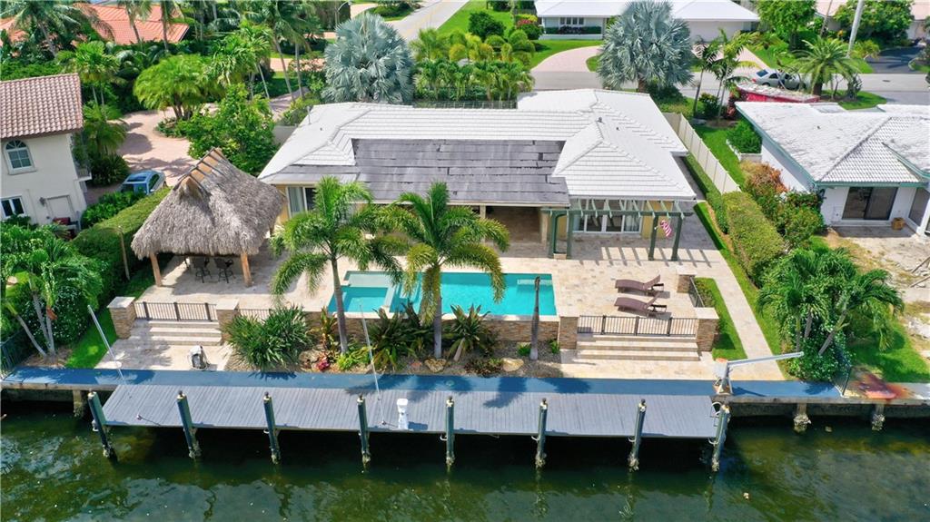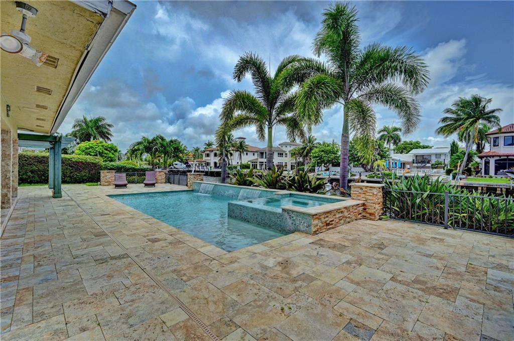 Coral Ridge one story beauty on oversized lot just one off the Intracoastal point. Perfect for those who love to boat and/or entertain. Large covered patio overlooks heated pool with waterfall/spa, outdoor kitchen with built in gas grill/gas burners, fridge, ice maker. Deep water ocean access with no bridges perfect for boaters with 100 foot seawall and 80 foot dock. Open floor plan has kitchen open to living room/dining room, all renovated with travertine tile throughout. Split floor plan. Master and guest bedroom overlook pool and water. Impact windows & doors, 2 car garage, built in cabinets for storage. Large circular gated driveway that gives added privacy/security. Bayview Elementary school district &close to private schools. Minutes to the mall, Las Olas, the beach, and more.