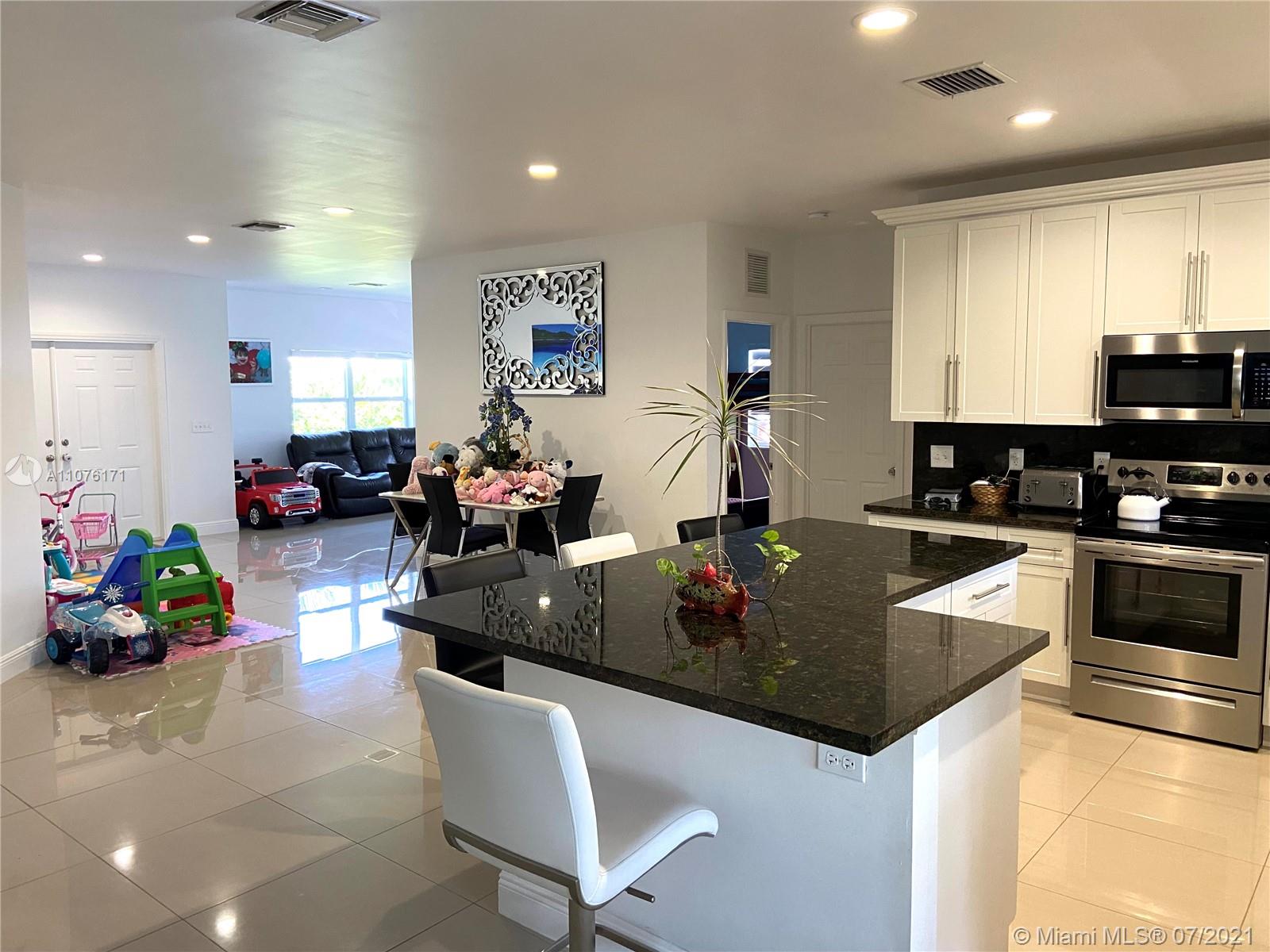 Built in 2018 this beautiful home offers 3 bedrooms, 2 bathrooms & a large 2 car garage & a split floor plan. The gorgeous kitchen is complete with granite counters & backsplash, 42” cabinets, stainless steel appliances, breakfast bar and large center island with seating. Enjoy the two living spaces with great natural light, the grand double door entry, and white marble tile throughout. Master bedroom has a walk-in closet, en suite bathroom with tub/shower. This almost new home offers hurricane impact windows & doors, volume ceilings with recessed lighting throughout and a large poured concrete driveway. Home is well landscaped with custom lighting. No association fees, all ages, pets welcome. All Zebra Blinds are included.