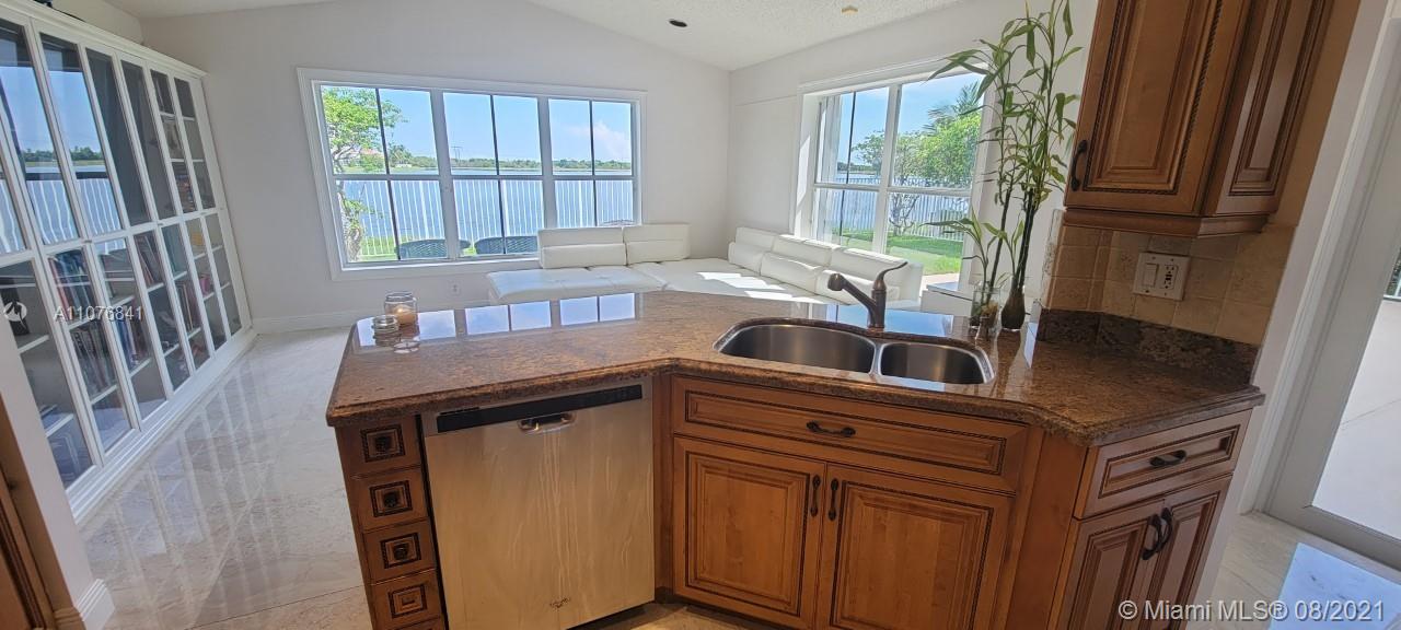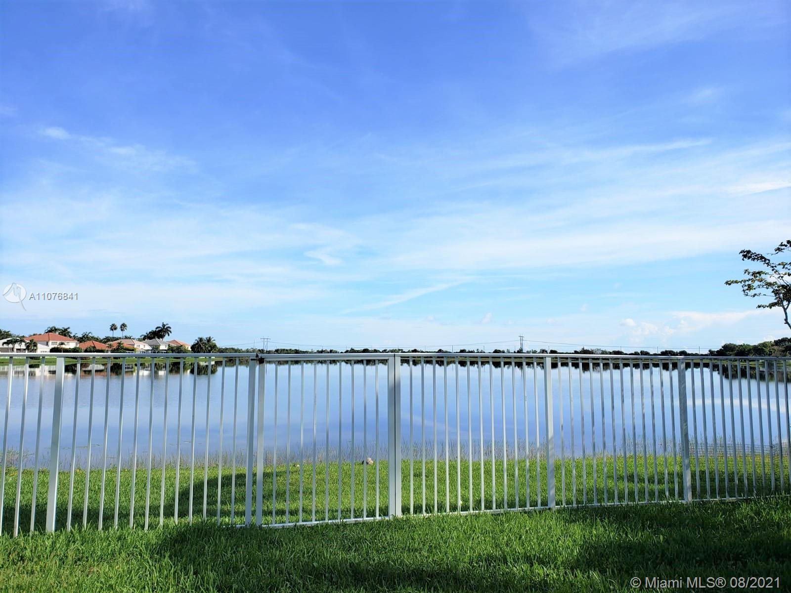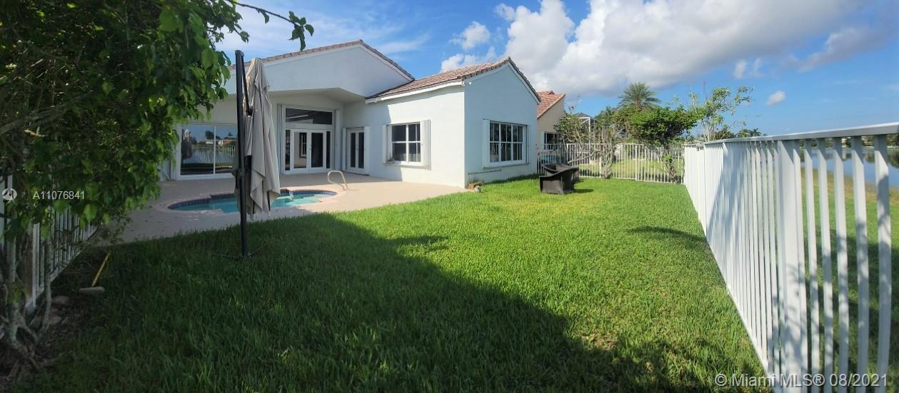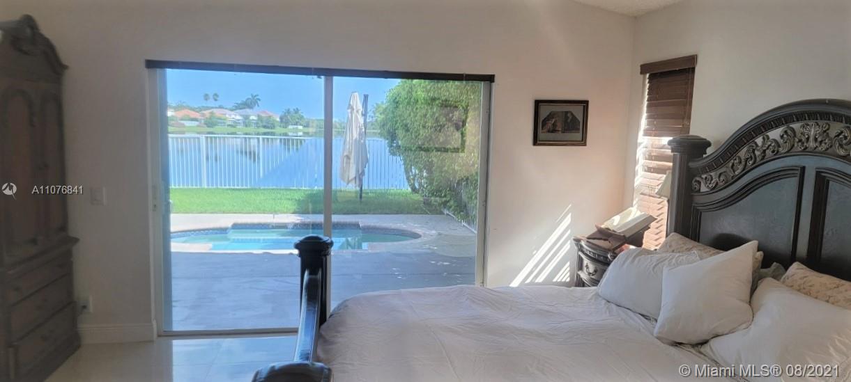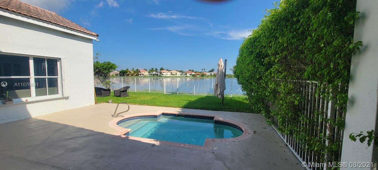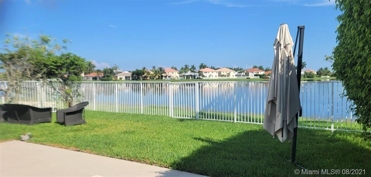From the moment the door is open you can see this amazing water view that can be enjoyed not only from the living room and family room but also from the master bedroom. Tranquil waters that will live you breathless and relaxed. Bright and airy home with imported porcelanato floors from Spain. Kitchen has high costume made cabinets with SS appliances, pull out drawers, back splash and granite countertops. An extra refrigerator at the garage and shelving. Build ins in family room and one of the bedrooms. Bathrooms has been updated. Nice size back yard with pool spa. 4yr old AC, new water heater. Accordion shutters throughout. Spot lights that illuminates the house at night. House has been well kept by owner. Gated community, with pool, kids playground, basketball and volleyball courts.