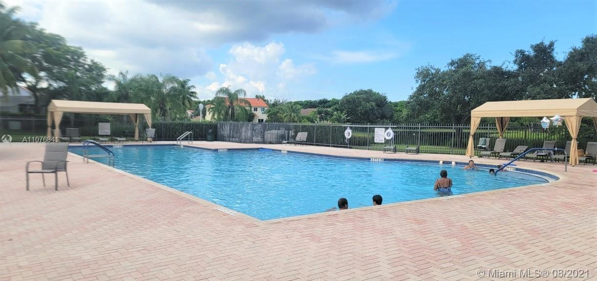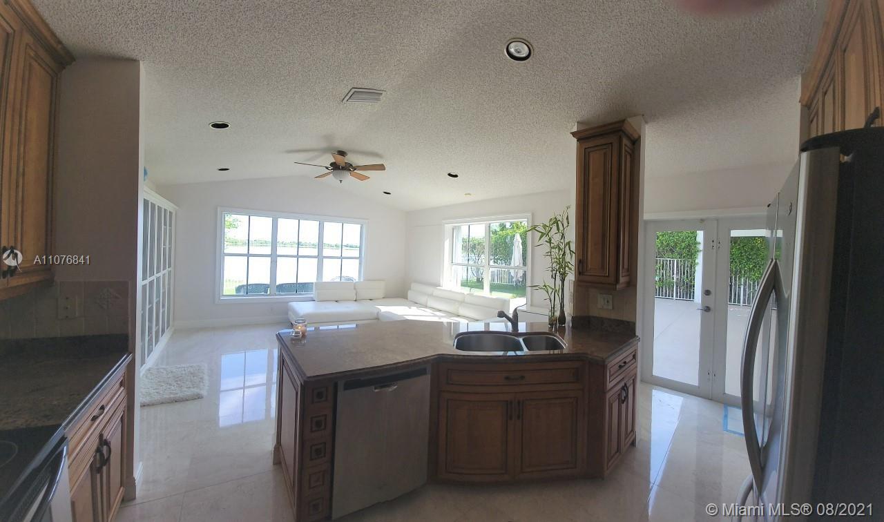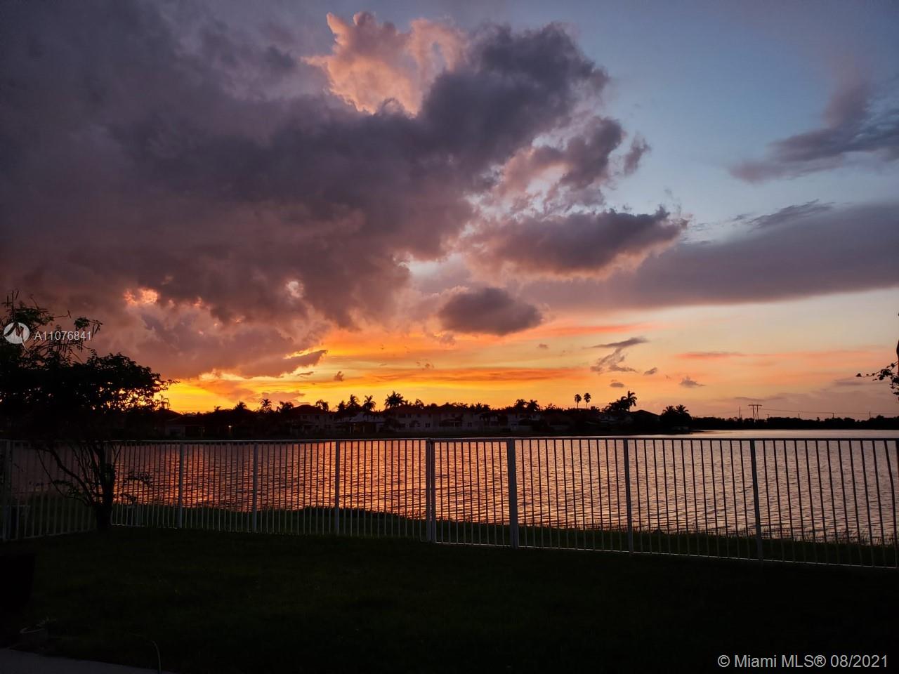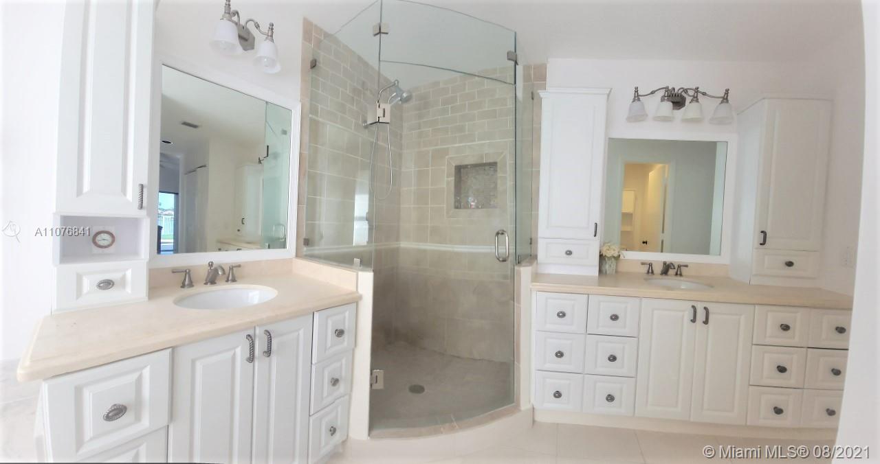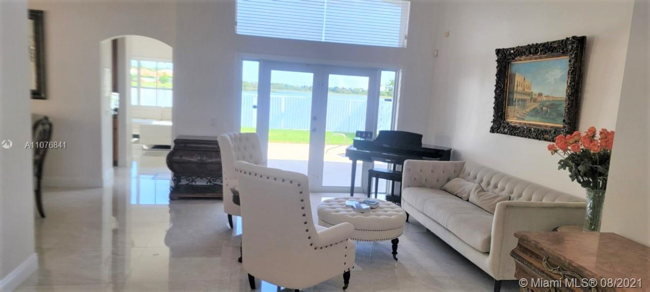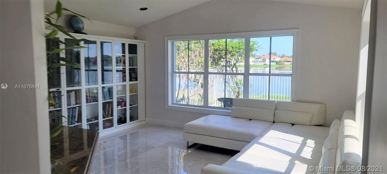 From the moment the door is open you can see this amazing water view that can be enjoyed not only from the living room and family room but also from the master bedroom. Tranquil waters that will live you breathless and relaxed. Bright and airy home with imported porcelanato floors from Spain. Kitchen has high costume made cabinets with SS appliances, pull out drawers, back splash and granite countertops. An extra refrigerator at the garage and shelving. Build ins in family room and one of the bedrooms. Bathrooms has been updated. Nice size back yard with pool spa. 4yr old AC, new water heater. Accordion shutters throughout. Spot lights that illuminates the house at night. House has been well kept by owner. Gated community, with pool, kids playground, basketball and volleyball courts.