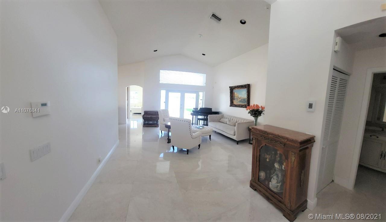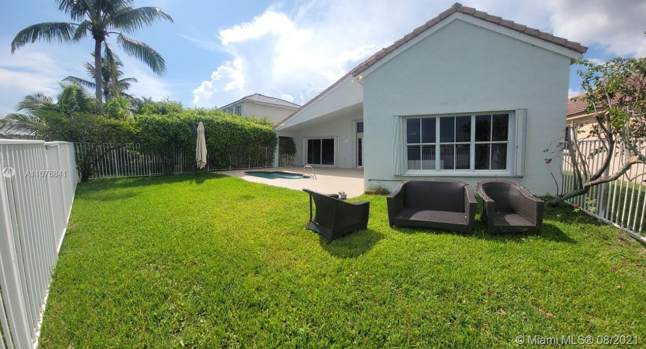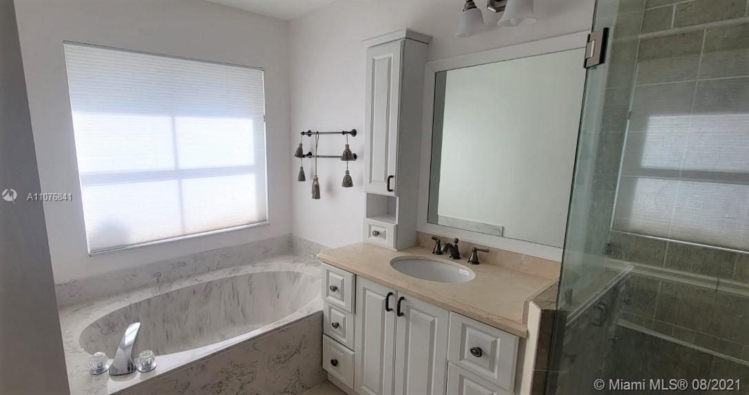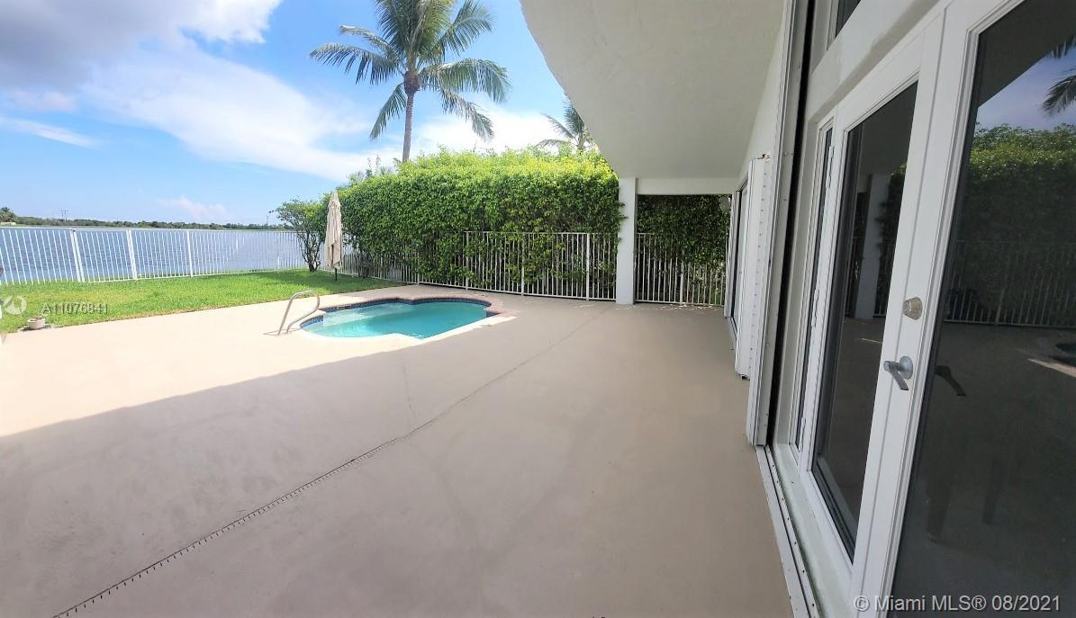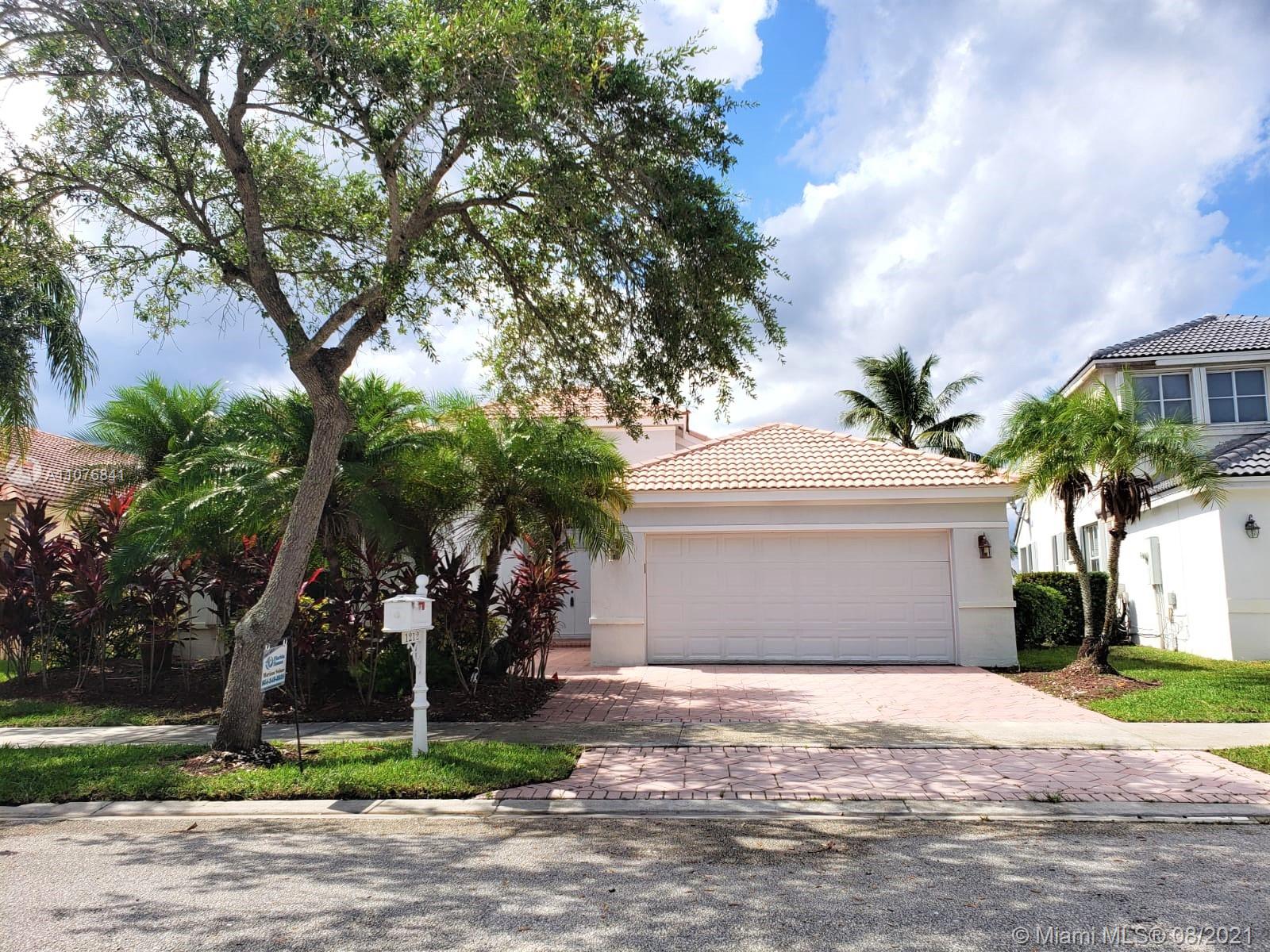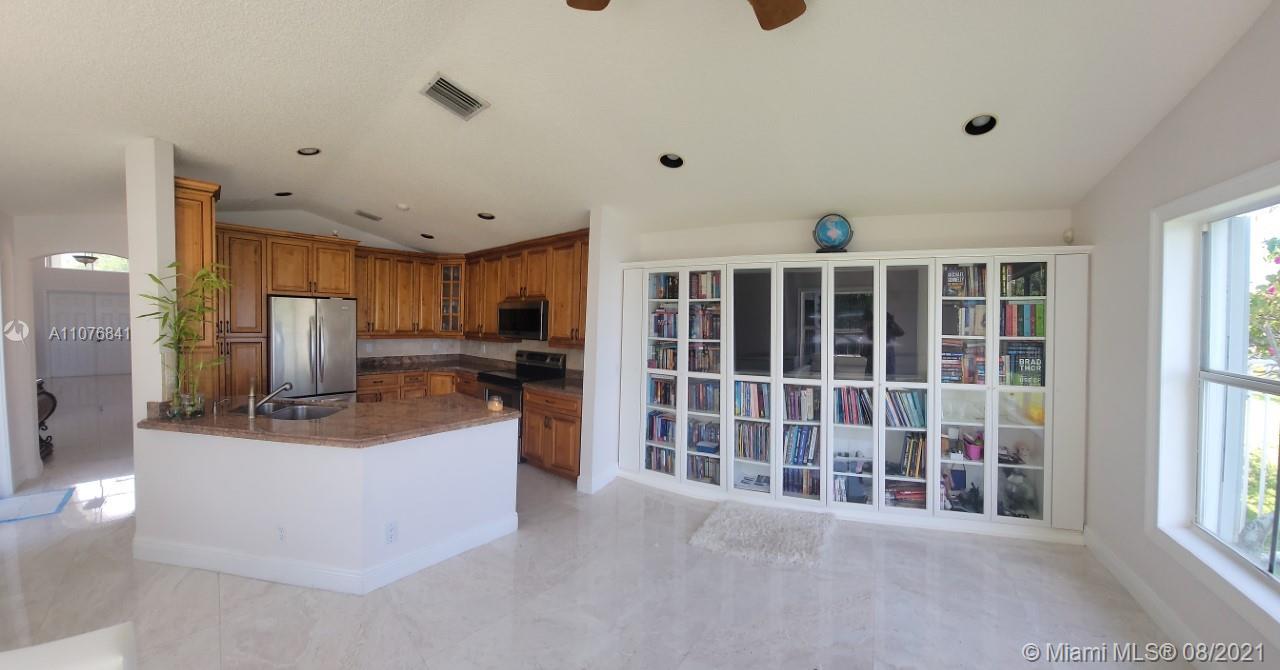 From the moment the door is open you can see this amazing water view that can be enjoyed not only from the living room and family room but also from the master bedroom. Tranquil waters that will live you breathless and relaxed. Bright and airy home with imported porcelanato floors from Spain. Kitchen has high costume made cabinets with SS appliances, pull out drawers, back splash and granite countertops. An extra refrigerator at the garage and shelving. Build ins in family room and one of the bedrooms. Bathrooms has been updated. Nice size back yard with pool spa. 4yr old AC, new water heater. Accordion shutters throughout. Spot lights that illuminates the house at night. House has been well kept by owner. Gated community, with pool, kids playground, basketball and volleyball courts.
