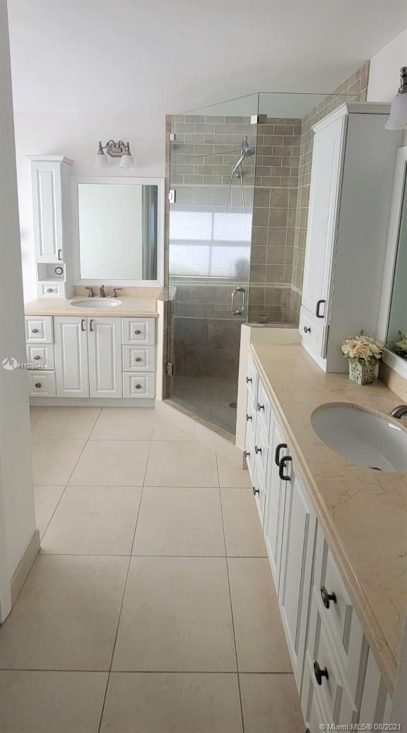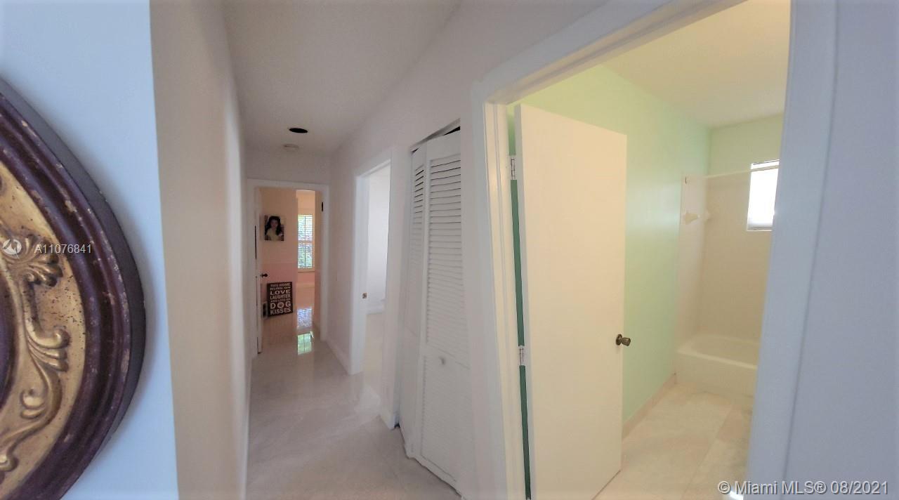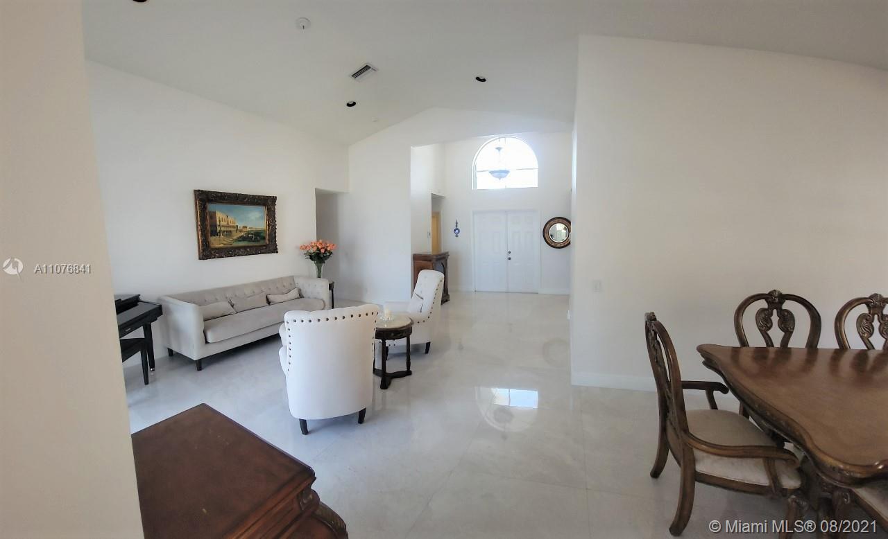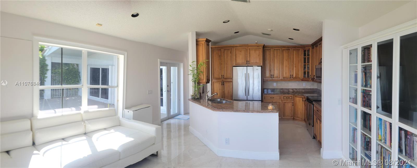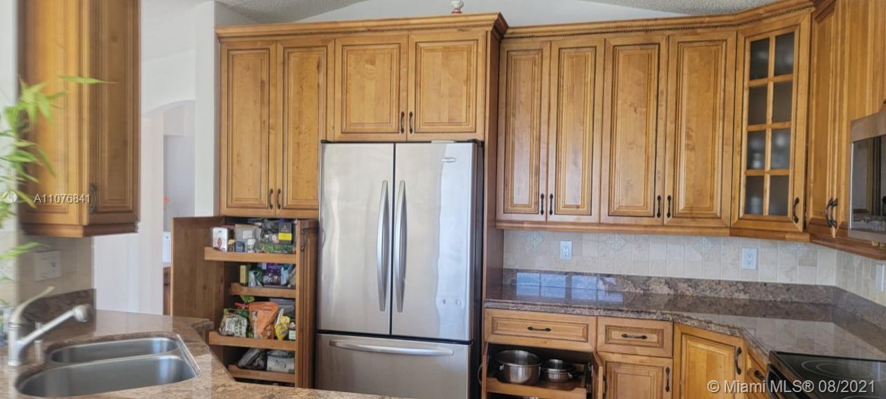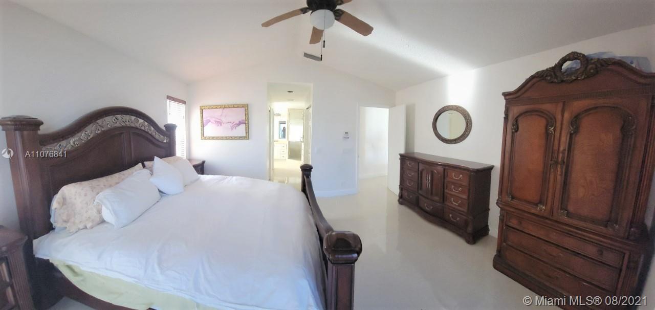 From the moment the door is open you can see this amazing water view that can be enjoyed not only from the living room and family room but also from the master bedroom. Tranquil waters that will live you breathless and relaxed. Bright and airy home with imported porcelanato floors from Spain. Kitchen has high costume made cabinets with SS appliances, pull out drawers, back splash and granite countertops. An extra refrigerator at the garage and shelving. Build ins in family room and one of the bedrooms. Bathrooms has been updated. Nice size back yard with pool spa. 4yr old AC, new water heater. Accordion shutters throughout. Spot lights that illuminates the house at night. House has been well kept by owner. Gated community, with pool, kids playground, basketball and volleyball courts.