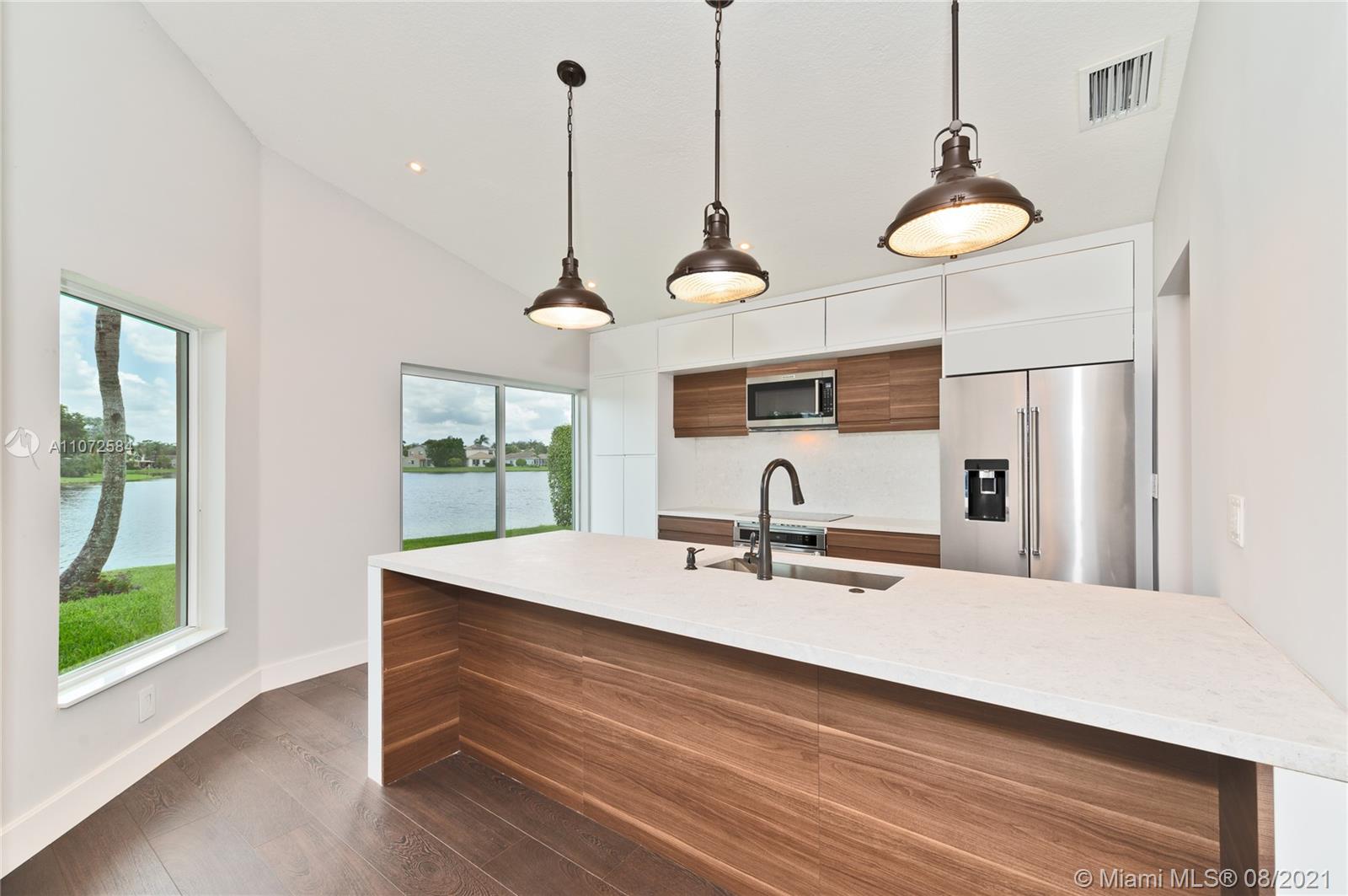 NEW $150K FULL RENOVATION. PRIVATE LOT WITH TRAVERTINE PATIO, LONG WATER VIEWS, SW EXPOSURE AND GORGEOUS SUNSETS. BRIGHT OPEN FLOOR PLAN. ARCHED ENTRY FOYER. NEW TILE AND MODERN DOORS, BASEBOARDS THROUGHOUT. DESIGNER KITCHEN WITH QUARTZ COUNTERS AND NEW APPLIANCES WITH BEVERAGE COOLER. DESIGNER BATHROOMS WITH FLOOR TO CEILING TILE AND TASTEFUL FIXTURES. NEW IMPACT HURRICANE DOORS AND WINDOWS. NEW HIGH PERFORMANCE A/C. NEW WATER HEATER. AUTOMATED LUTRON LED LIGHTING SYSTEM. DUAL 1 GB INTERNET (ATT FIBER AND COMCAST CABLE) IN BEAUTIFUL EMERALD ESTATES, LOW HOA INCLUDES, CABLE TV, ALARM MONITORING, LAWN CARE, TREE TRIMMING, IRRIGATION, FERTILIZATION, COMMUNITY POOL, GYM, KIDS PLAYGROUND, 24HR GUARD GATE, TOP RATED WESTON SCHOOLS, EVERGLADES, FALCON COVE, CYPRESS BAY HS.