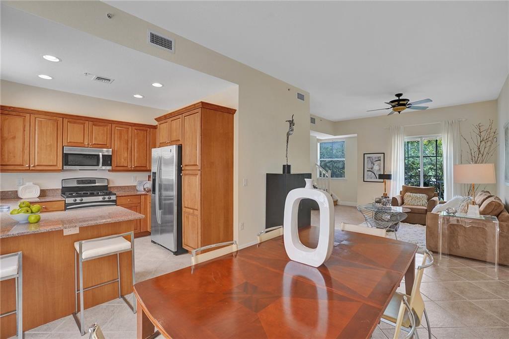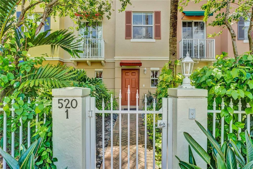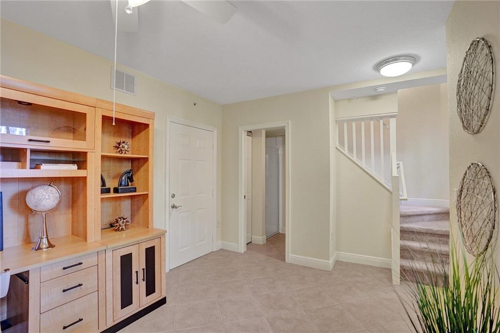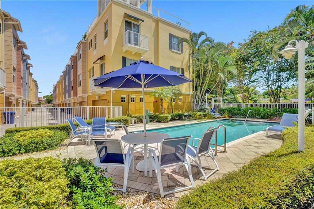 Victoria Park Elegant 3 story townhouse features 2 Bedrooms & 3.5 Bathrooms & a 2 car garage!.....On 1st floor is a bonus room which is presently used as office;( desks & cabinets stay); but perfect den or 3rd bedroom & has a full bath....Gated front court yard great for your pets....2nd floor features volume ceilings, a 1/2 bath, custom kitchen w/ granite breakfast bar, stainless steel appliances, gas range, generous cabinet space & granite counter tops overlooking dining room & living room....Tile floors on 1st & 2nd level are laid at a diagonal....On 3rd floor is washer/dryer & 2 master bedroom en-suites; w/ walk in closet in 1 Master Bedroom & separate tub & shower....2 zone AC, impact windows & doors, tankless water heater..... Community heated pool..... Walk to dining & shopping