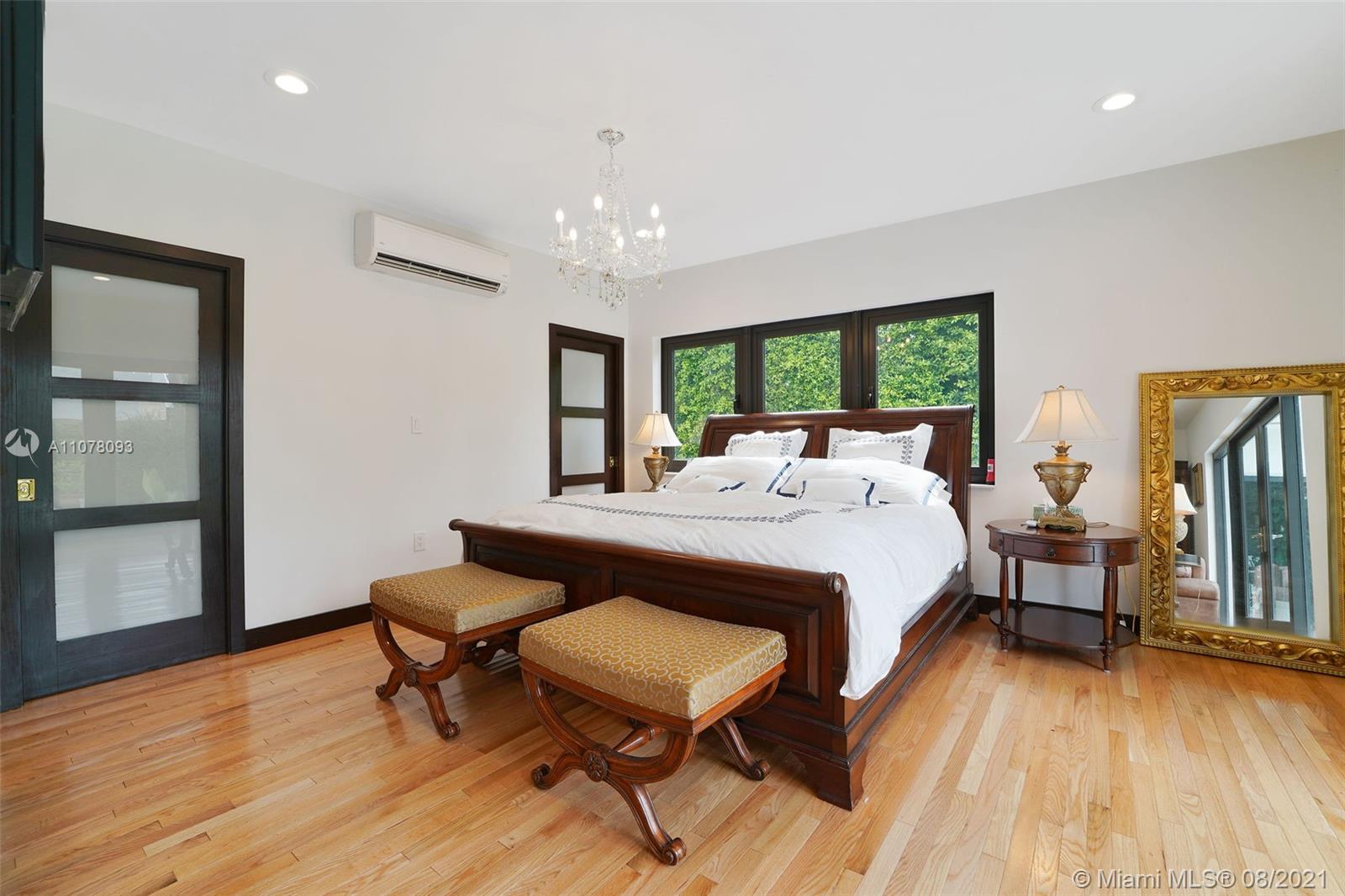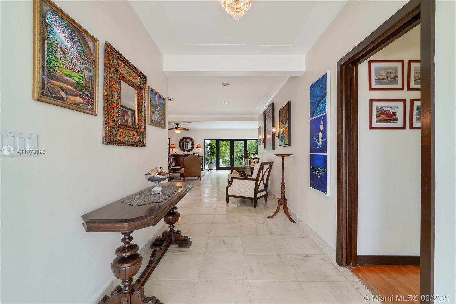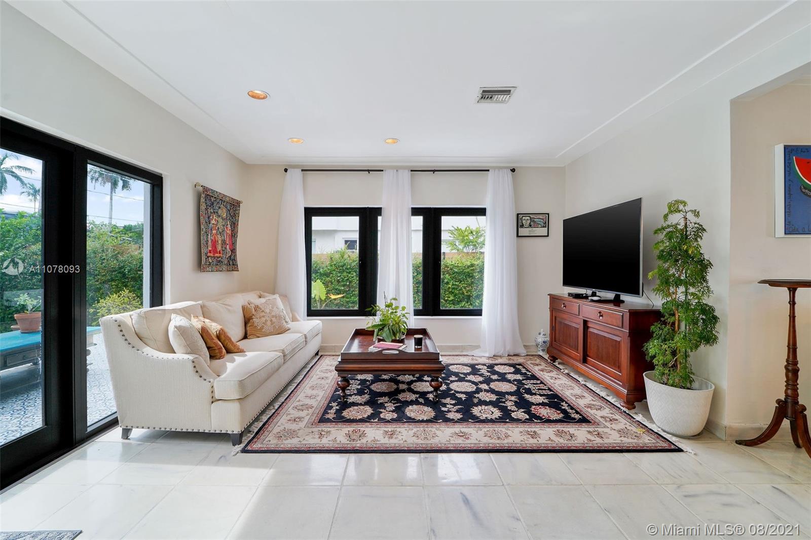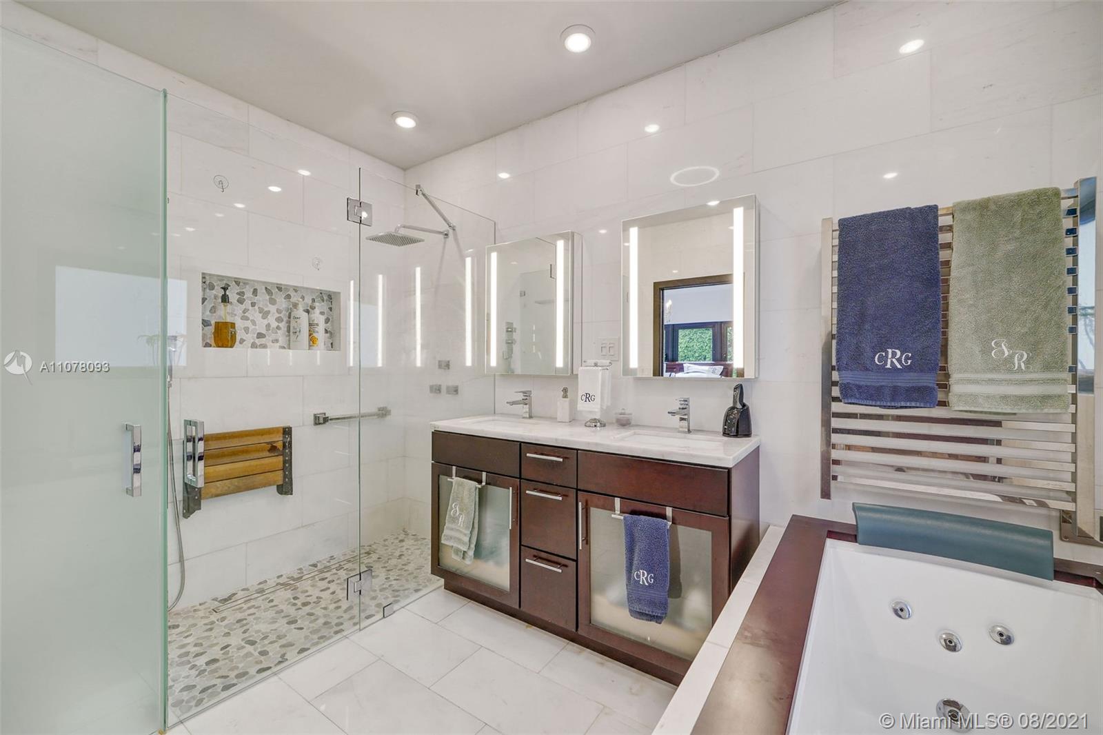 Welcome to "North Bay Villa"! This remodeled tropical modern villa includes an expansive primary BR w/dramatic high impact glass doors leading out to an elevated & wraparound terrace w/eclectic Spanish tile deck. The primary BR has wall-to-wall walk-in closets & an enlarged double-vanity en-suite bath made possible by an enlarged building footprint encompassing the BR. The main living is an open concept connecting the living, dining, & entertainment spaces. A true chef's kitchen designed w stainless hood, gas cooking, & large cooking island w/ adjacent bar area leading out to an expansive deck & outdoor patio. Features include roof retrofit, impact windows/doors, oak & white natural stone flooring. Guard gated bayside community w/private backyard & high foliage. Plenty of room for a pool!