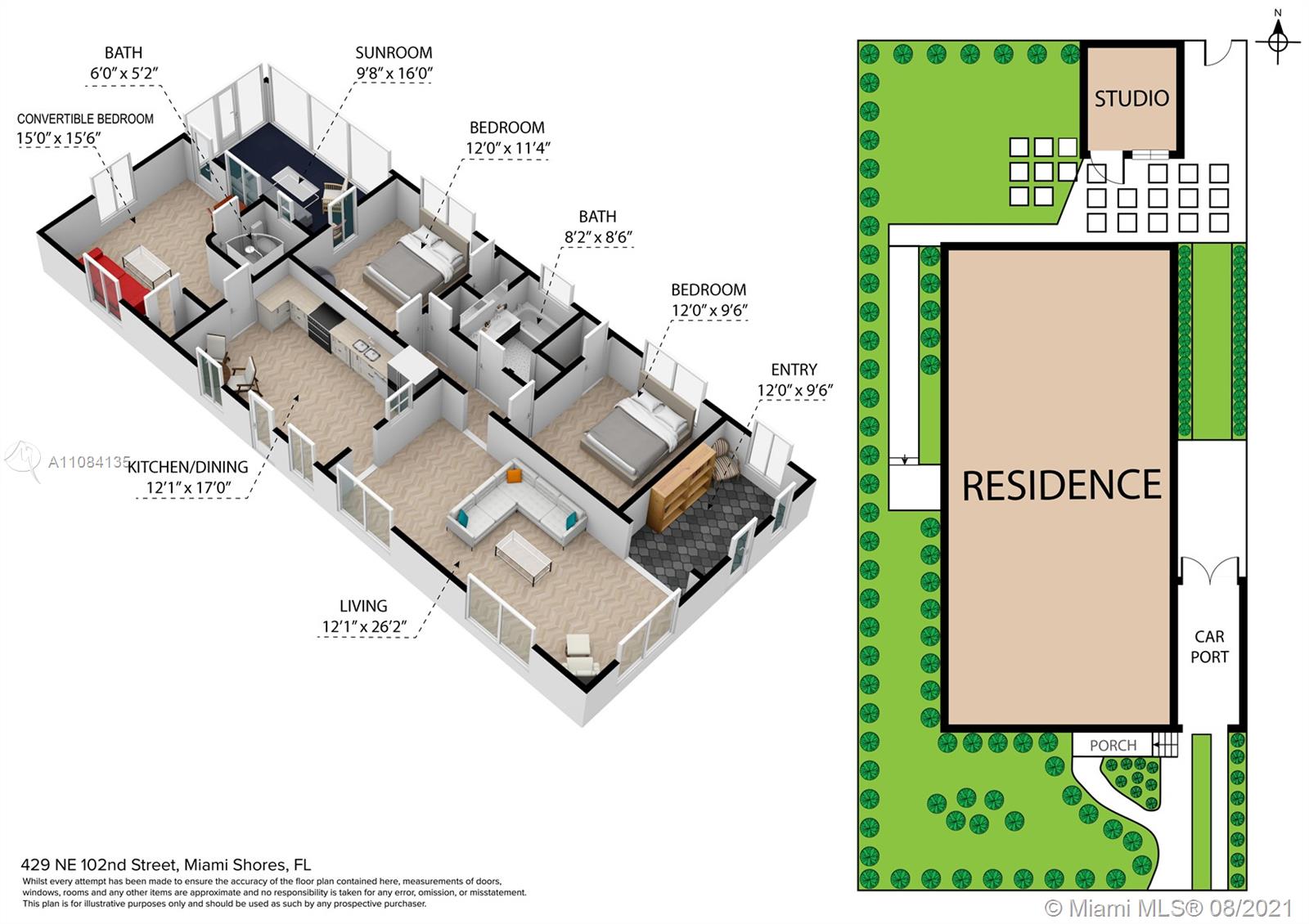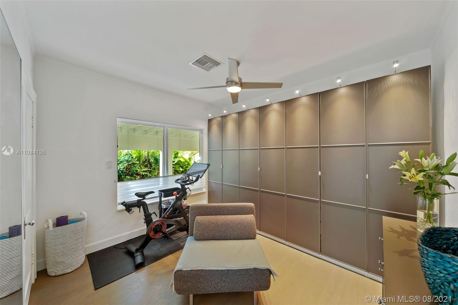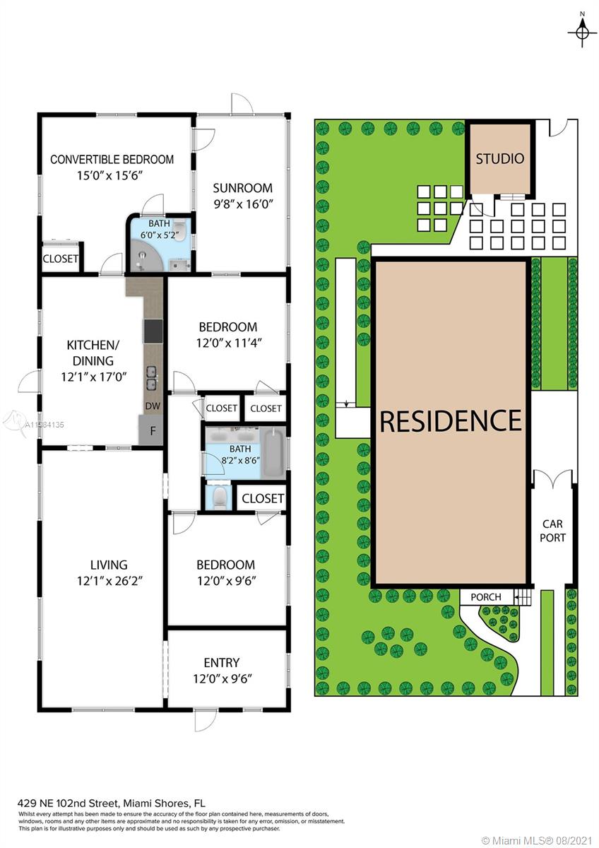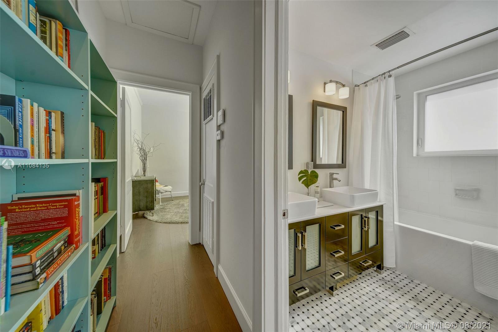 Stunning Miami Shores residence with absolutely gorgeous custom finishes, high ceilings, and beautiful landscaping, with no expense spared! Detached converted garage w/plumbing is a great flex space for a gym or artist studio. Home has 2 bedrooms/ 1 bath on one side, and a convertible 3rd bedroom or family room + 2nd bathroom after kitchen leading to a charming screened patio. See floor plan in photos. Lovely tiled foyer leads into the main living area with recently installed beautiful oak wood flooring in a herring bone pattern. Contemporary kitchen with top of the line appliances and ravishing dolomite backsplash. New roof w/ tapered insulation for main house & studio. Home has impact windows & doors, new electrical panel, & carport electrical for your electric car charger. Must see!