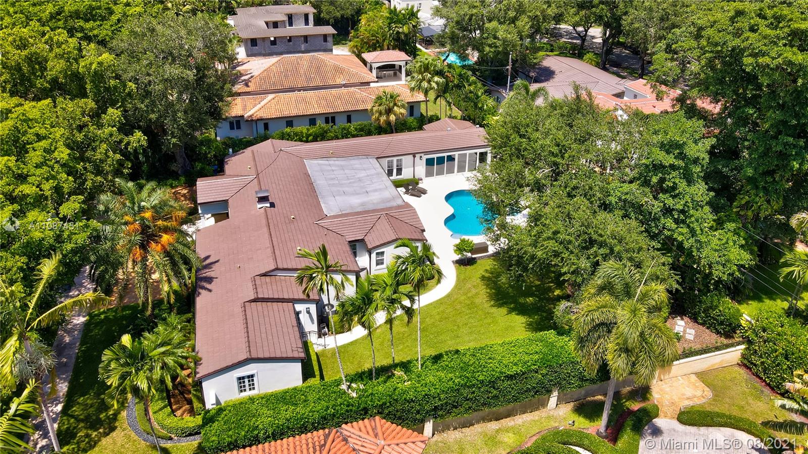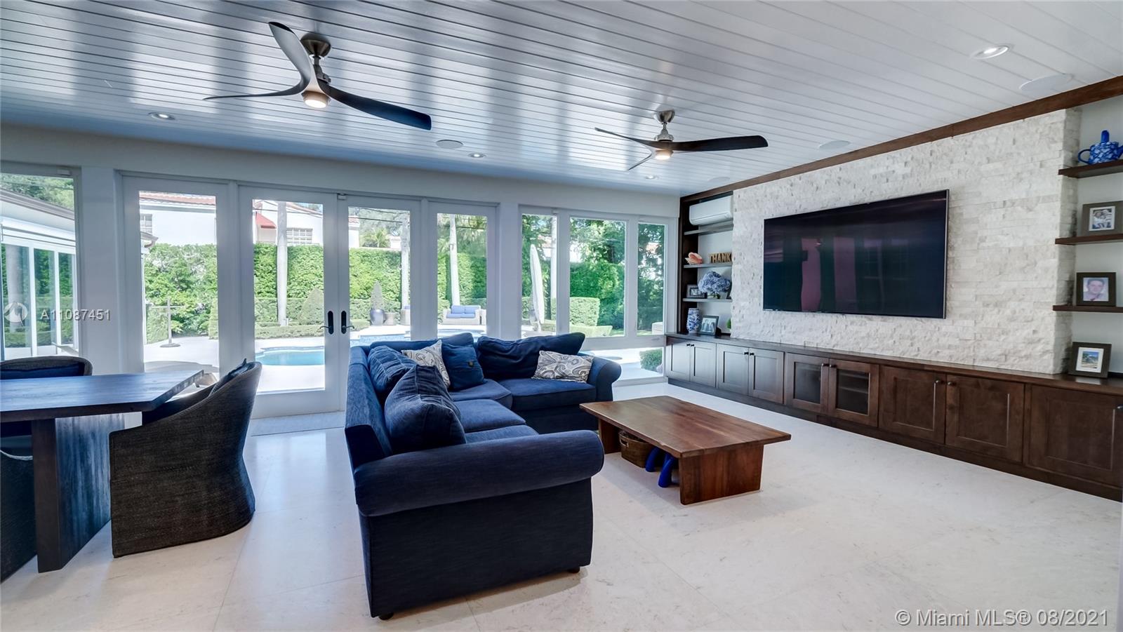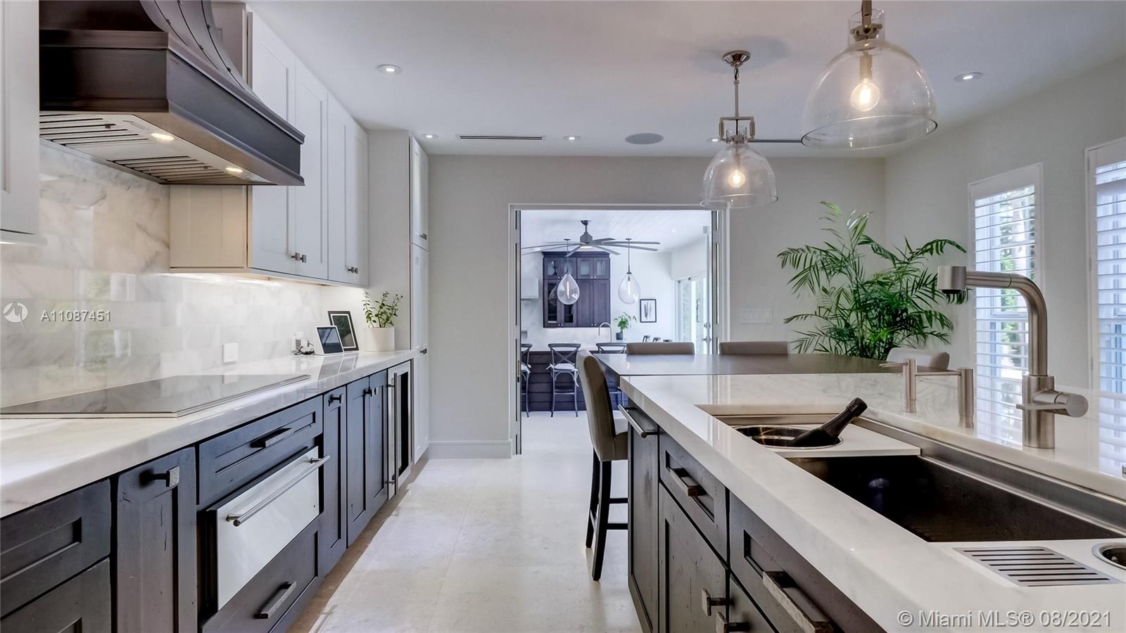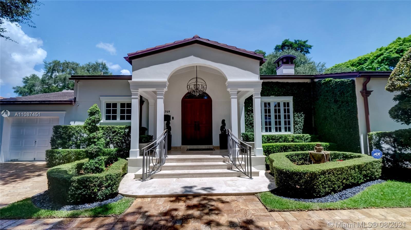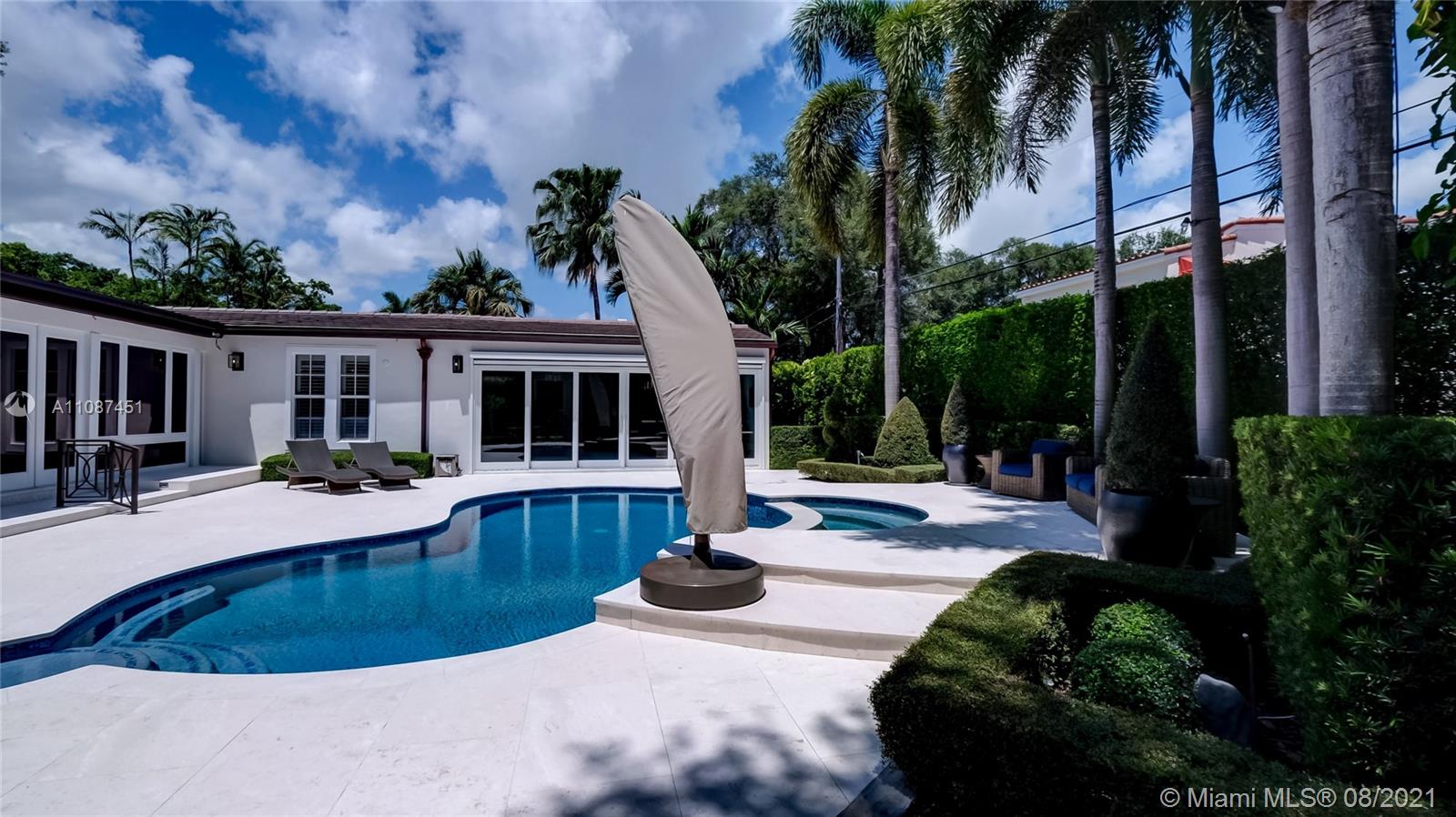 Unique opportunity in the heart of coveted Coral Gable’s Golden Triangle. 1930's renovated 5 Br 4 Ba home on quiet tree-lined 16,500 sqft lot. Property includes newly-built indoor/outdoor entertainment room w/ impact glass sliding doors, full bar & lynx grill + automatic roll down screen. State-of-the-art kitchen w/ subzero/WOLF, Miele appliances, oversized kitchen island w/ galley workstation sink and custom-integrated table, ideal for entertaining. Exquisite shell-stone and oak hardwood flooring. Large great room w/ floor-to-ceiling windows overlooking pool and yard area, offers plenty of natural sunlight. Lush landscaping w/ custom lighting. Extra features: Automatic standby generator w/ 500-gallon underground propane tank, 8 security cameras, Swat repellent integrated system & more!