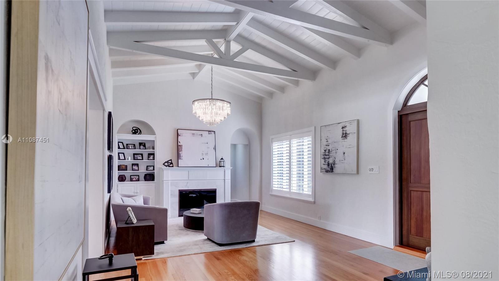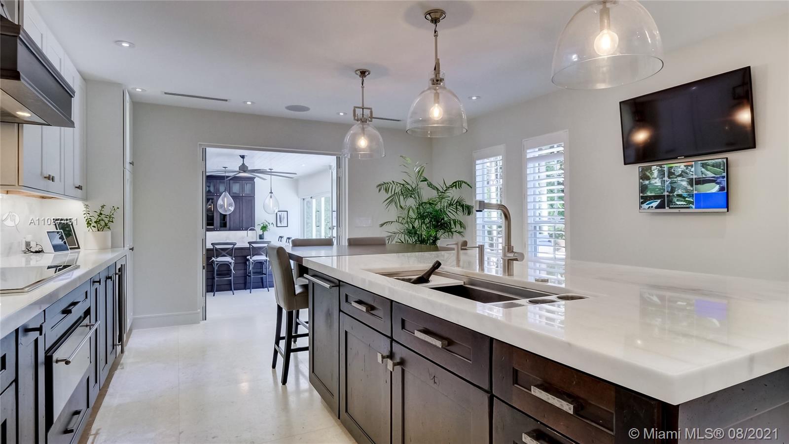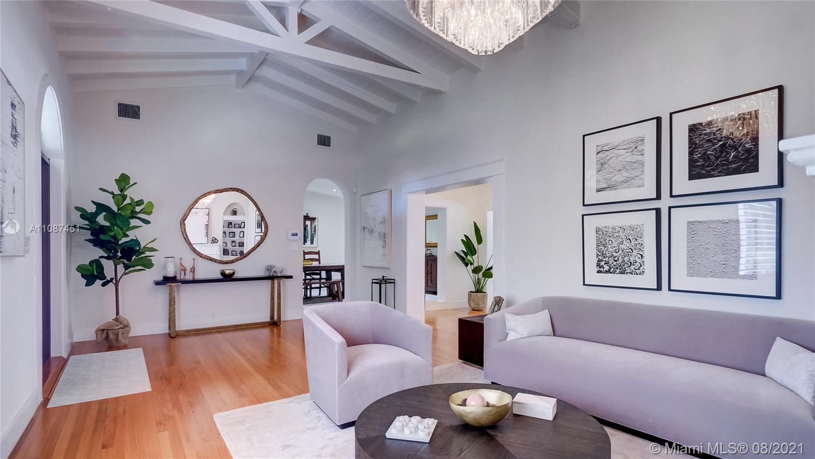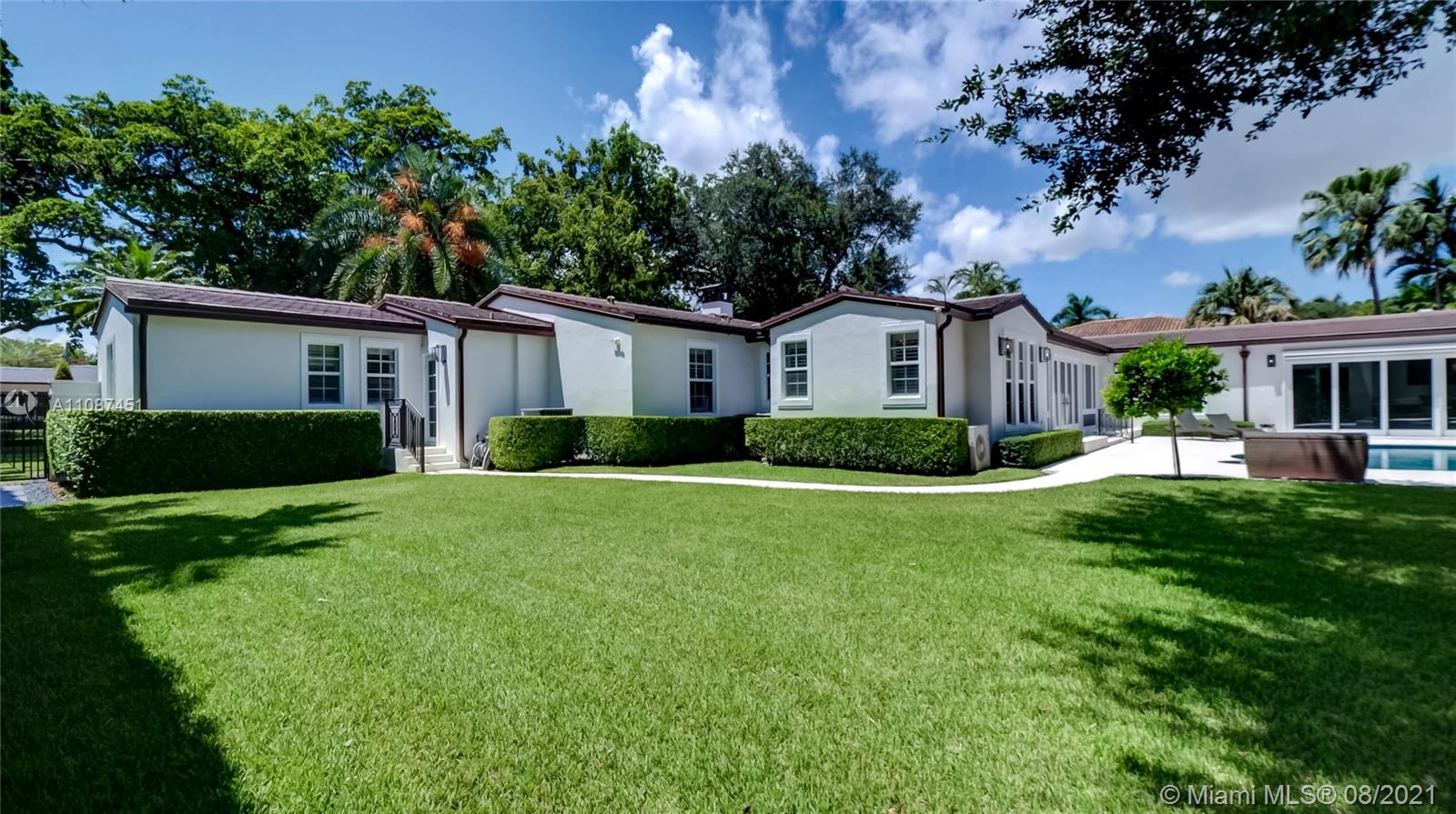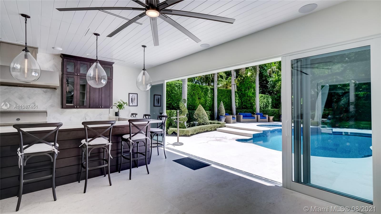 Unique opportunity in the heart of coveted Coral Gable’s Golden Triangle. 1930's renovated 5 Br 4 Ba home on quiet tree-lined 16,500 sqft lot. Property includes newly-built indoor/outdoor entertainment room w/ impact glass sliding doors, full bar & lynx grill + automatic roll down screen. State-of-the-art kitchen w/ subzero/WOLF, Miele appliances, oversized kitchen island w/ galley workstation sink and custom-integrated table, ideal for entertaining. Exquisite shell-stone and oak hardwood flooring. Large great room w/ floor-to-ceiling windows overlooking pool and yard area, offers plenty of natural sunlight. Lush landscaping w/ custom lighting. Extra features: Automatic standby generator w/ 500-gallon underground propane tank, 8 security cameras, Swat repellent integrated system & more!