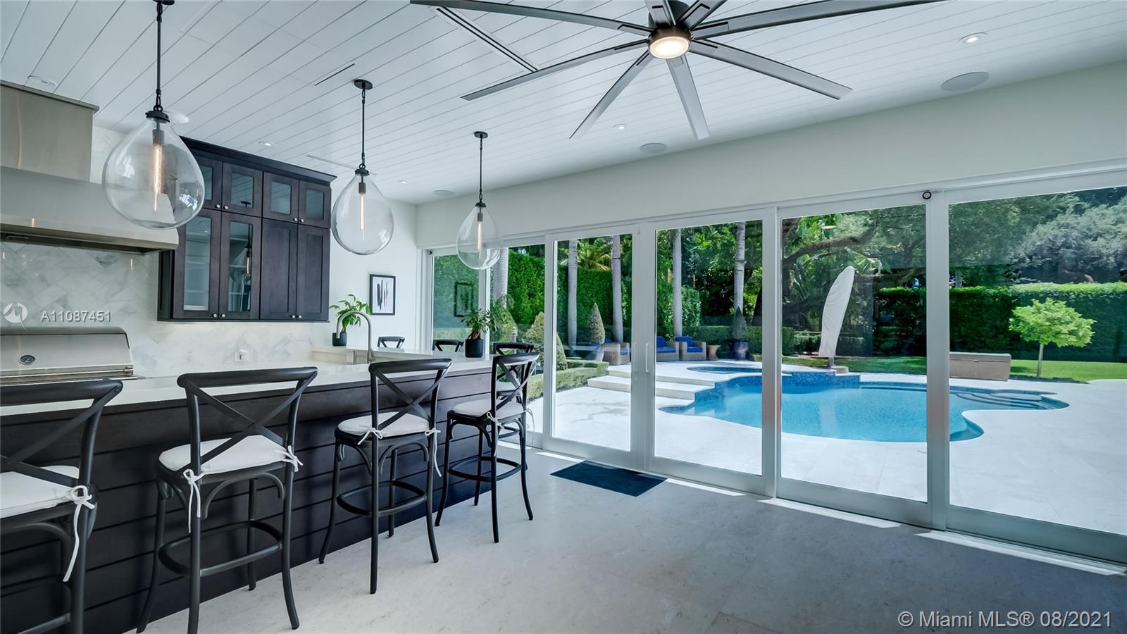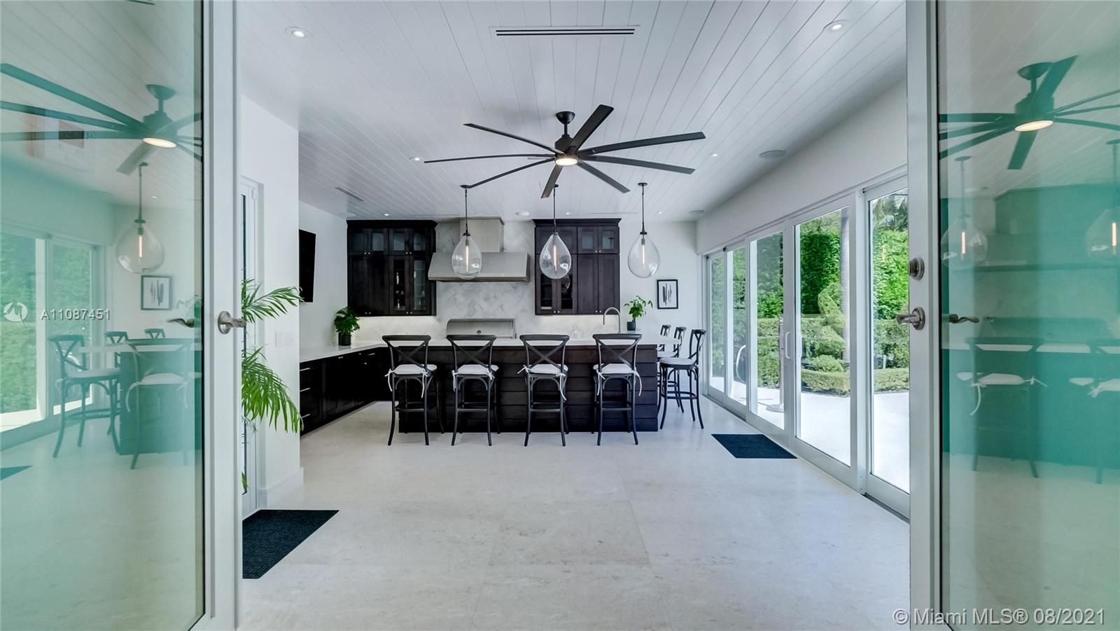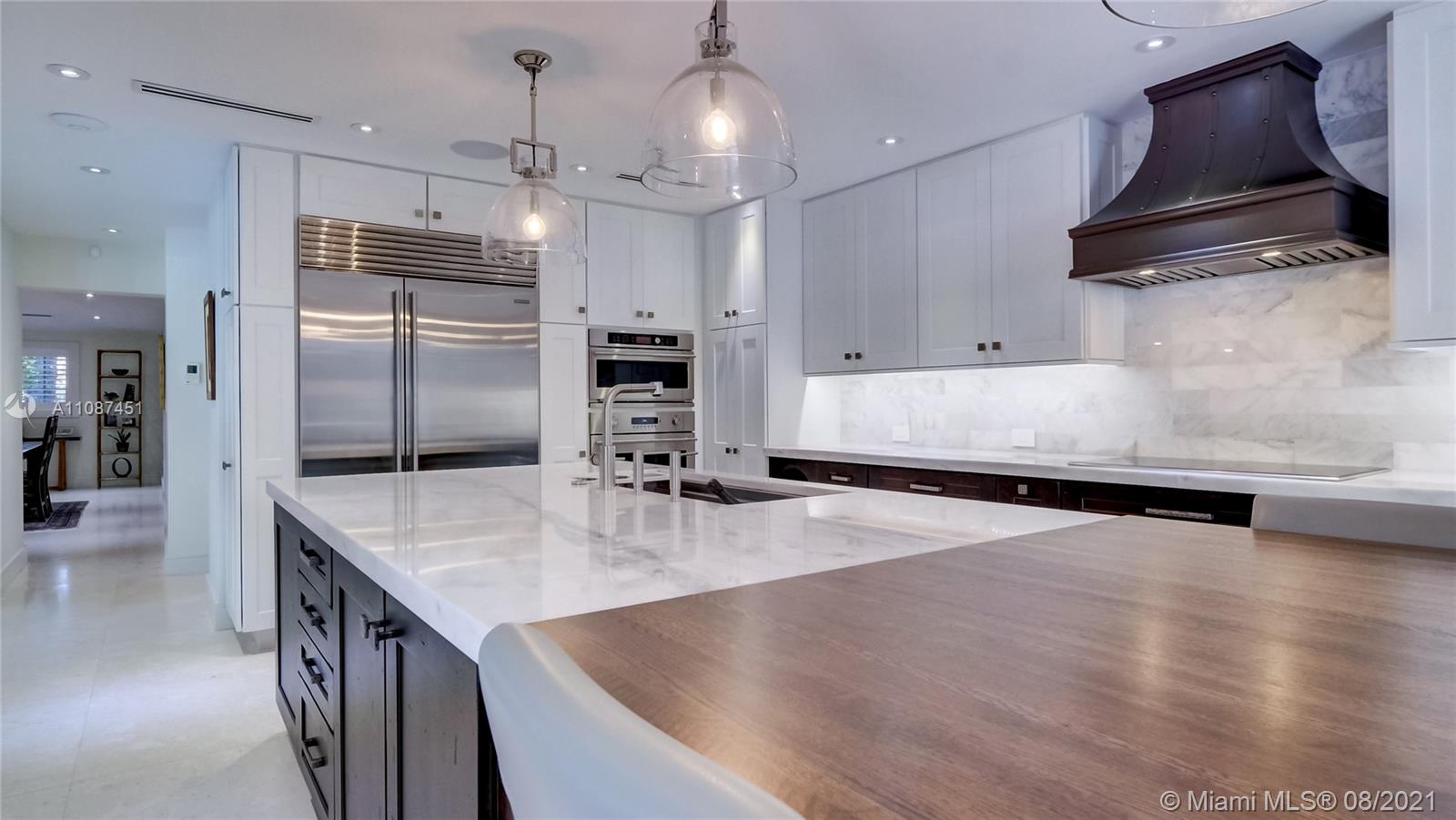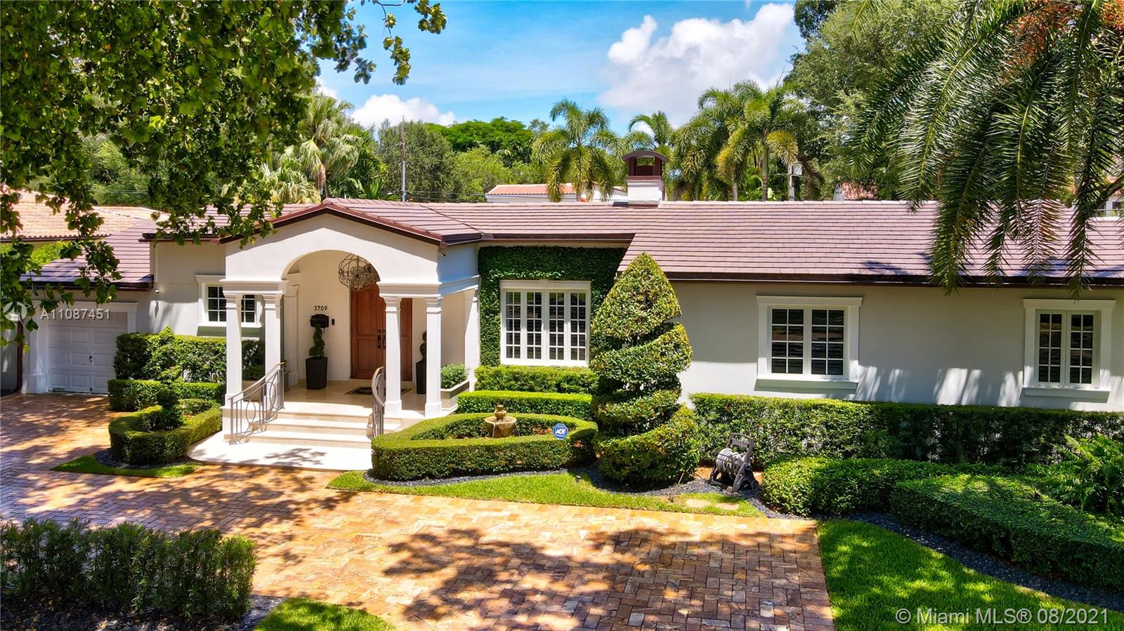 Unique opportunity in the heart of coveted Coral Gable’s Golden Triangle. 1930's renovated 5 Br 4 Ba home on quiet tree-lined 16,500 sqft lot. Property includes newly-built indoor/outdoor entertainment room w/ impact glass sliding doors, full bar & lynx grill + automatic roll down screen. State-of-the-art kitchen w/ subzero/WOLF, Miele appliances, oversized kitchen island w/ galley workstation sink and custom-integrated table, ideal for entertaining. Exquisite shell-stone and oak hardwood flooring. Large great room w/ floor-to-ceiling windows overlooking pool and yard area, offers plenty of natural sunlight. Lush landscaping w/ custom lighting. Extra features: Automatic standby generator w/ 500-gallon underground propane tank, 8 security cameras, Swat repellent integrated system & more!